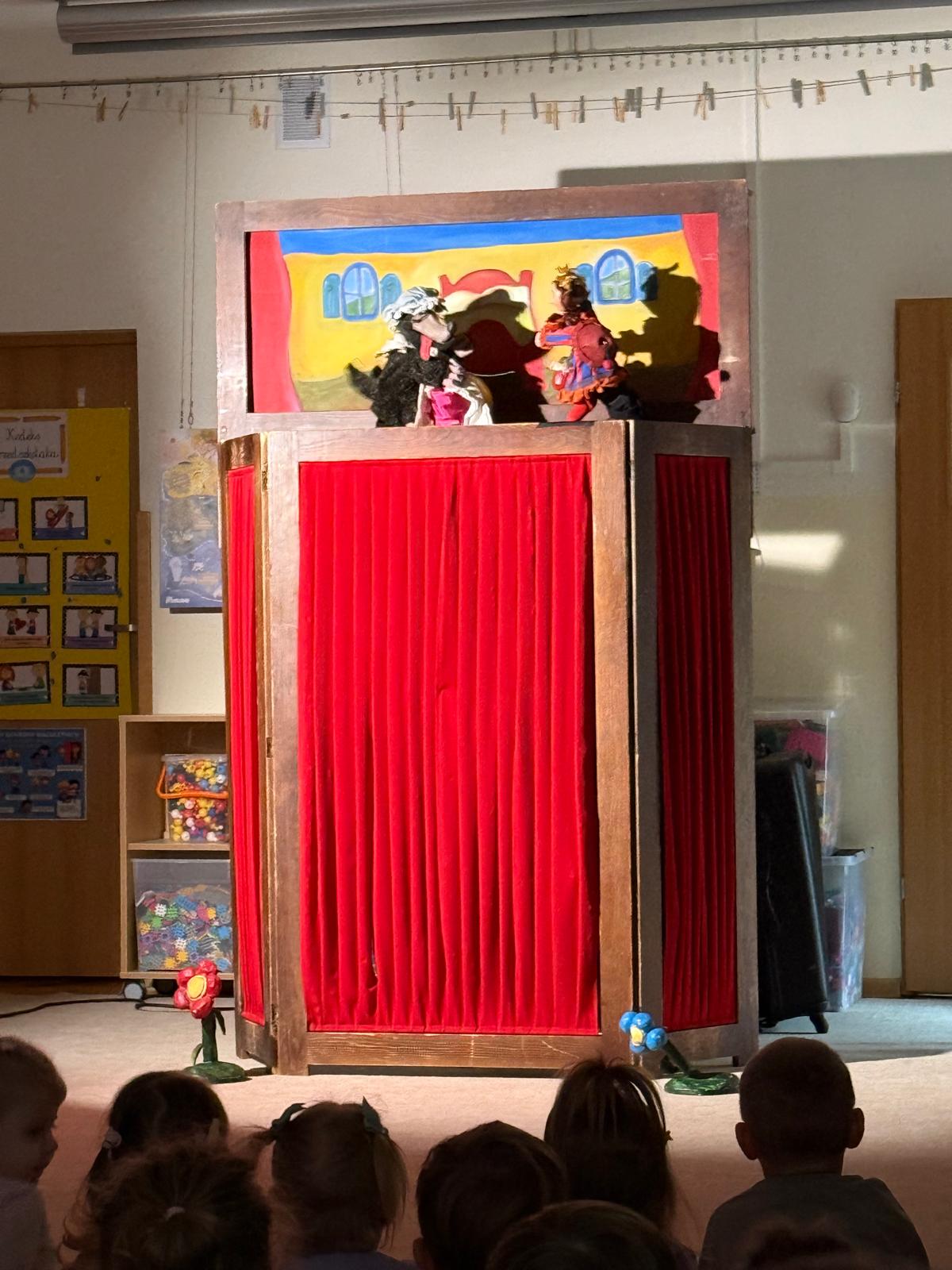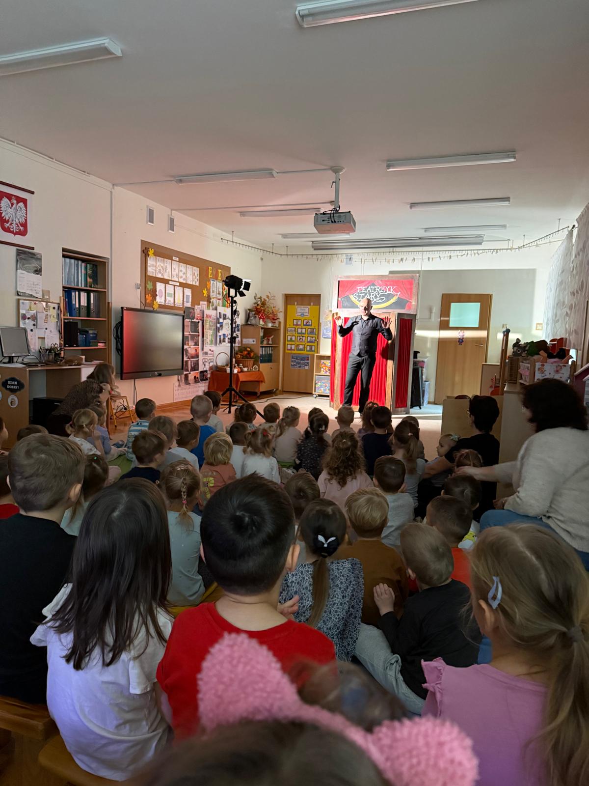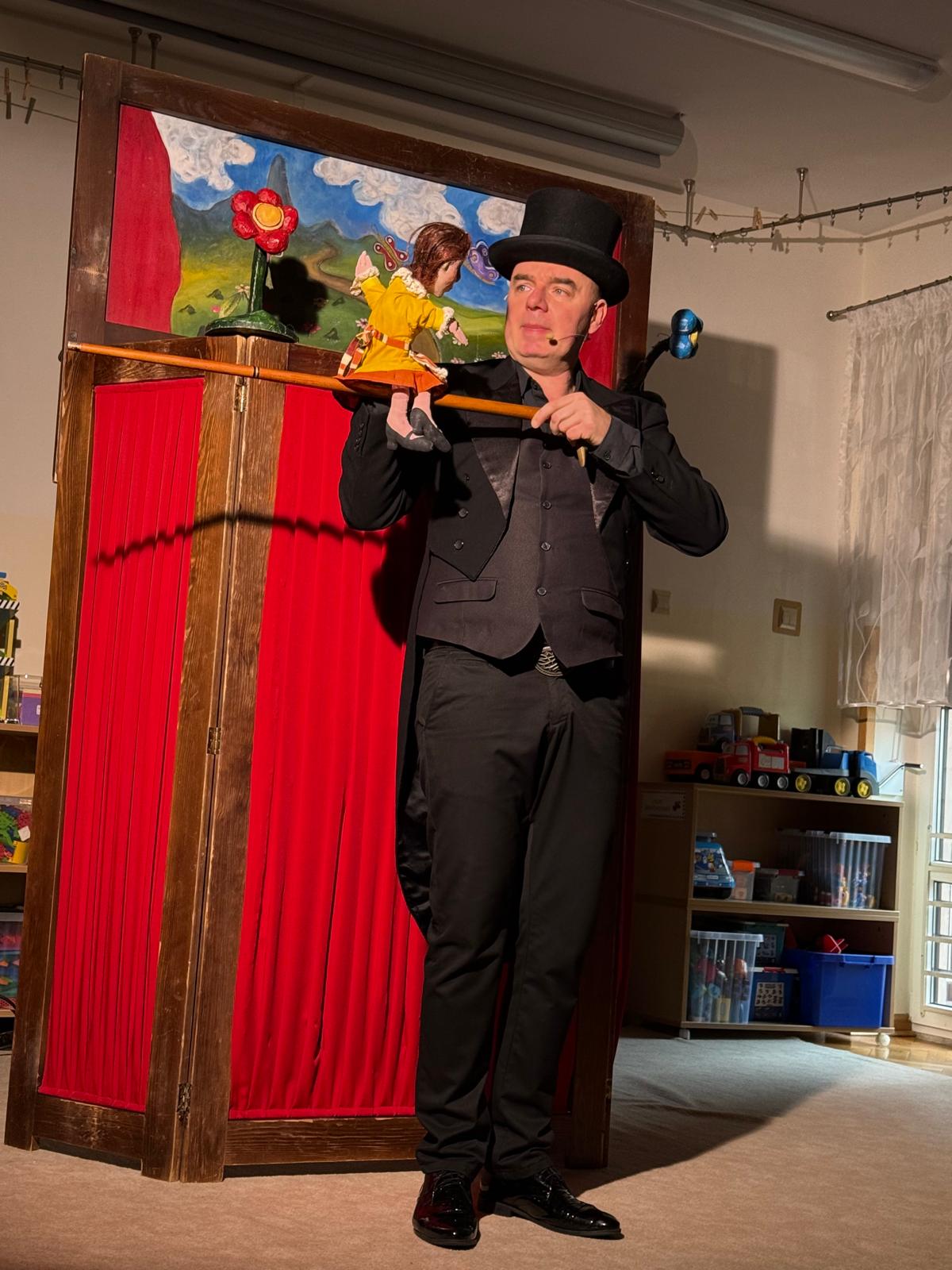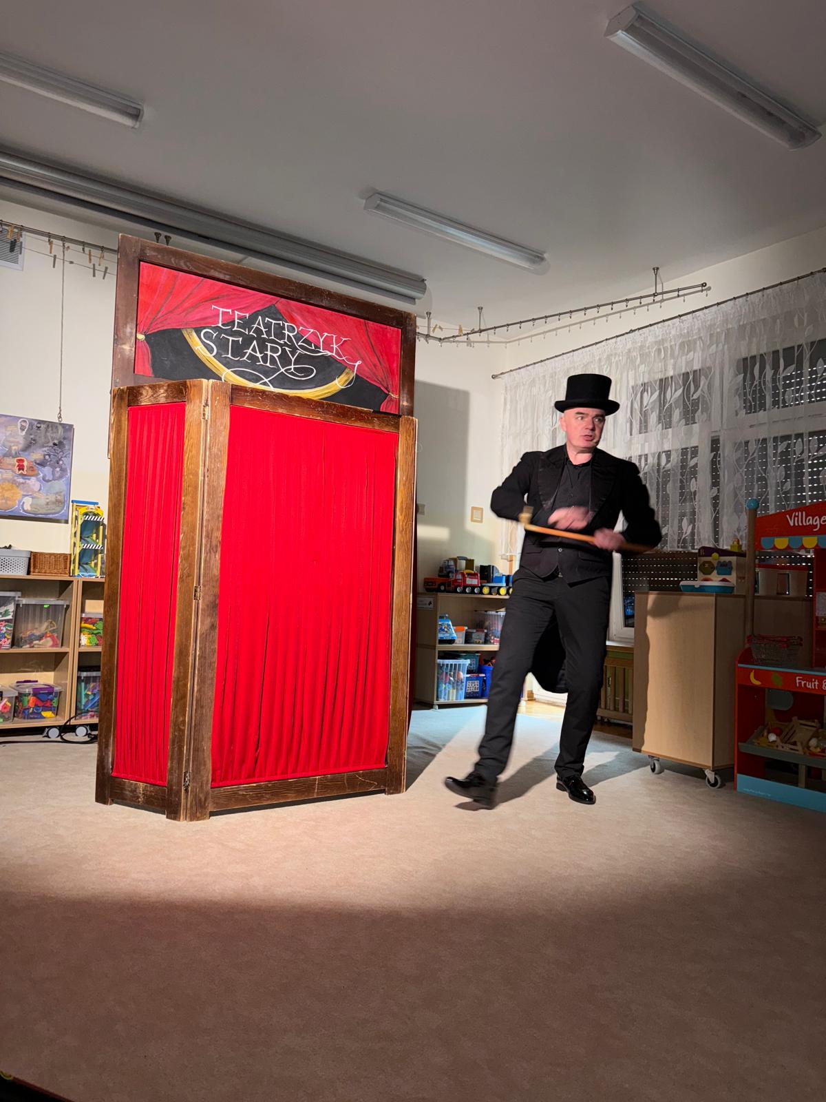 W piątek 14.11.2025 nasze przedszkole ponownie odwiedził Pan Tomasz Falkowski, który zaprezentował dzieciom niezwykły spektakl „Czerwony Kapturek”.