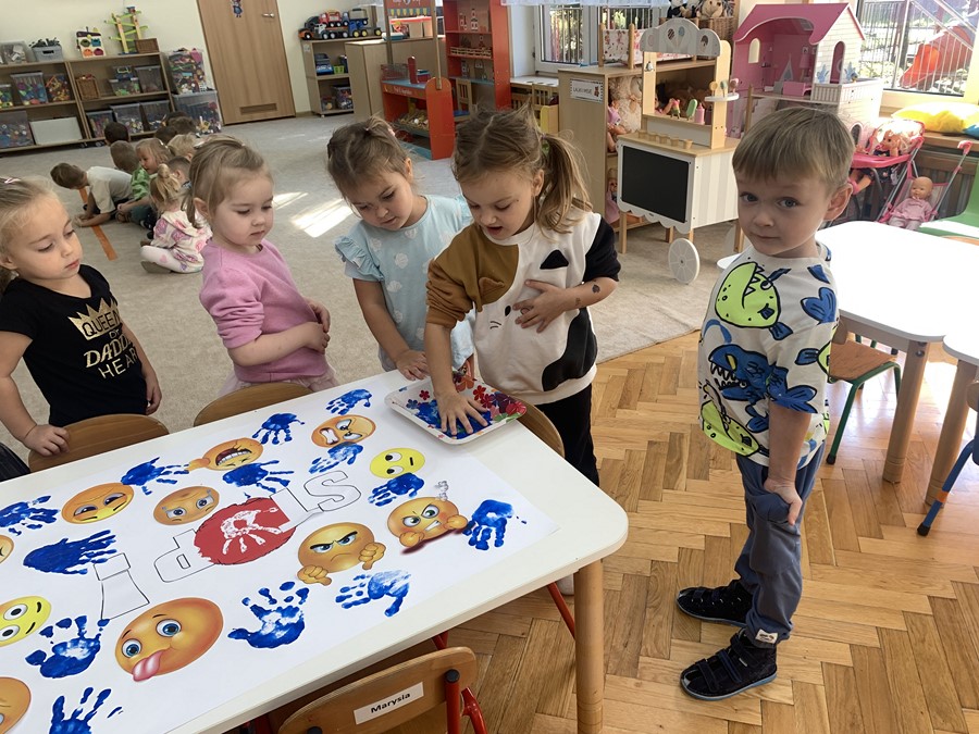 Natomiast w piątek wszystkie 4-latki przyszły do przedszkola ubrane w kolorze niebieskim - był to symboliczny znak sprzeciwu wobec przemocy. To czas, w którym wspólnie chcemy pokazać, jak ważne jest tworzenie bezpiecznych miejsc zabawy i nauki oraz budowanie relacji opartych na szacunku. Bezpieczne, radosne, wypełnione miłością dzieciństwo – to bezcenny kapitał w życiu dorosłym. Rolą każdego z nas jest zwrócenie uwagi na dobrostan dzieci, by reagować i zapobiegać krzywdzeniu dzieci.