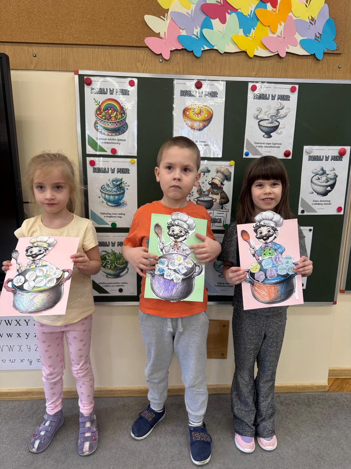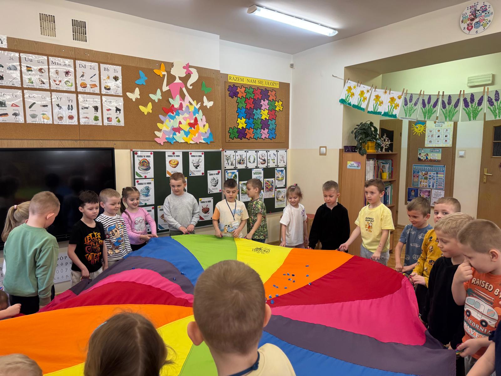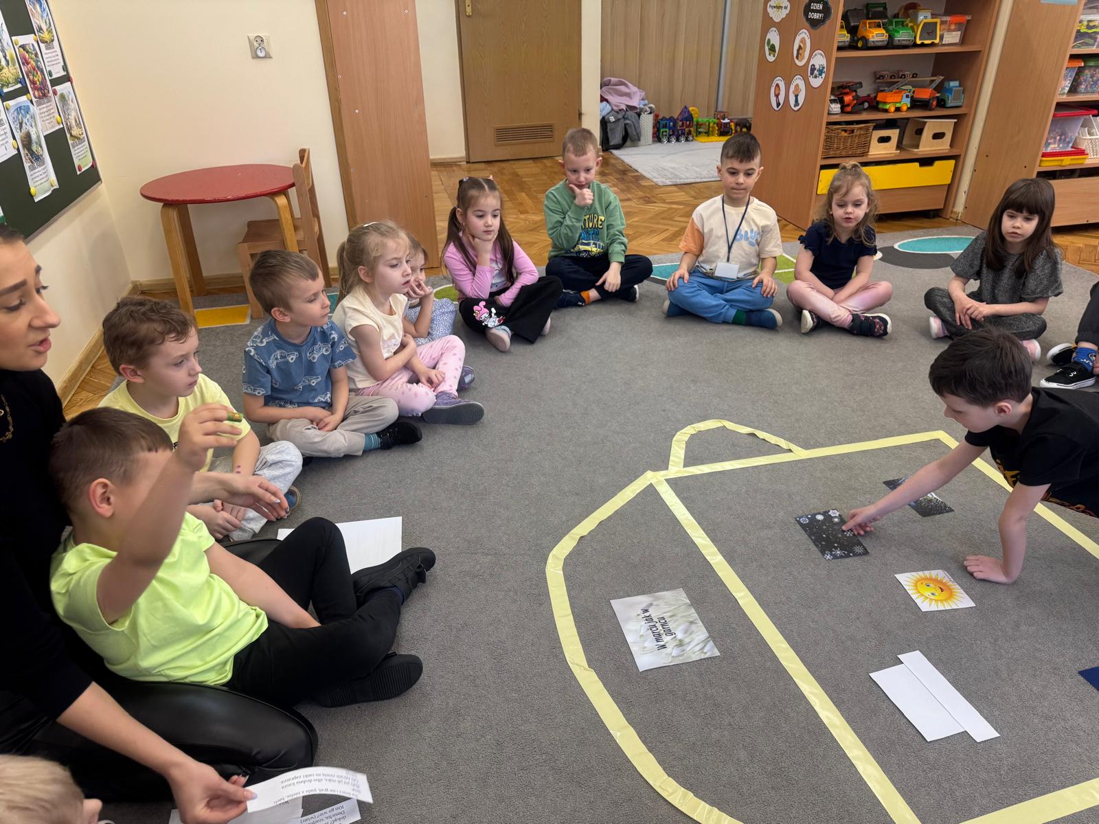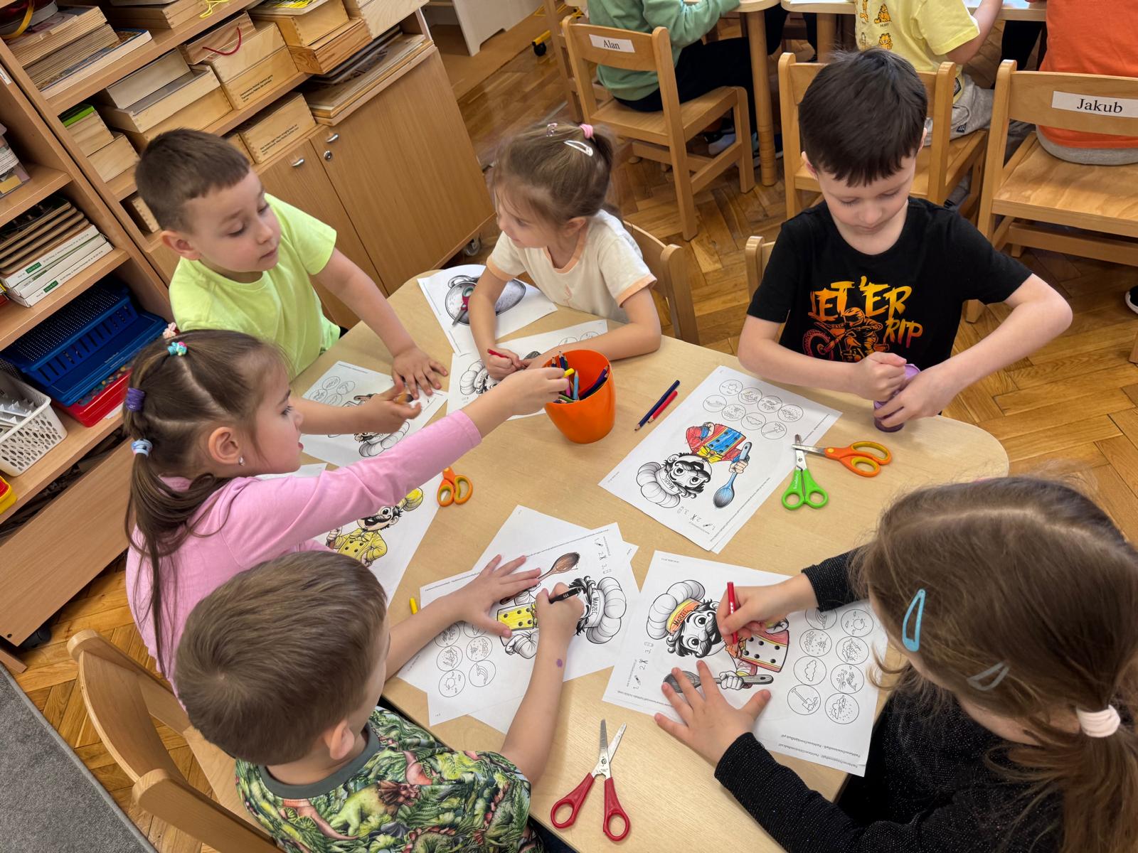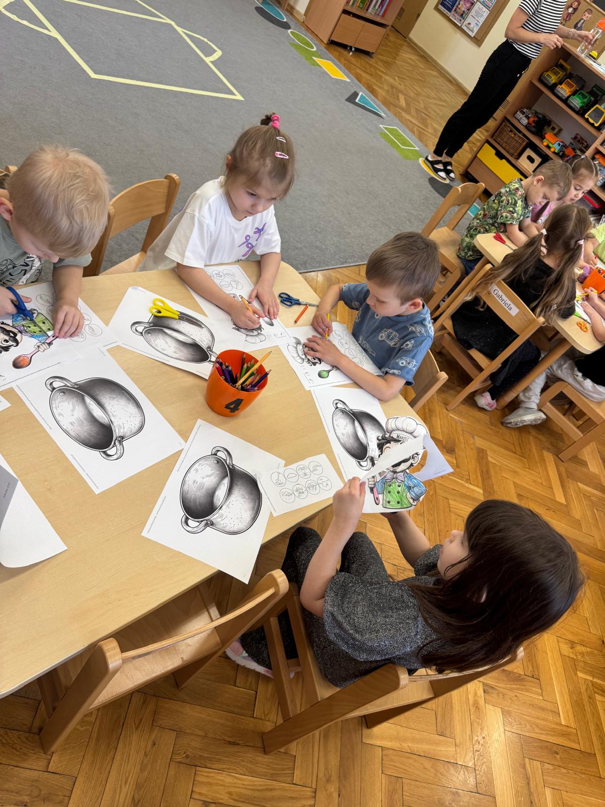 Na początku zajęć dzieci poznały znaczenie tego powiedzenia. Poprzez zabawę w zagadki dowiedziały się, jak zmienna potrafi być pogoda w marcu - od słońca, przez deszcz, aż po śnieg. Przedszkolaki świetnie poradziły sobie z ich odgadywaniem, wykazując się dużą wiedzą i spostrzegawczością. Następnie wspólnie bawiliśmy się w grę z kostką, na której znajdowały się symbole pogodowe. Dzieci z radością rozpoznawały wylosowane zjawiska i aktywnie uczestniczyły w zabawie. Utrwaliliśmy również poznaną w tym tygodniu literę „g” - dzieci z dużym zaangażowaniem układały jej kształt z ziaren grochu. Kolejnym punktem dnia była praca plastyczna - mali artyści stworzyli kucharzy mieszających w garnkach różne rodzaje pogody. Powstały bardzo pomysłowe i kolorowe prace. Na zakończenie zajęć dzieci wzięły udział w zabawie ruchowej z chustą animacyjną. Ich zadaniem było utrzymanie „deszczyku” na chuście, co sprawiło wszystkim wiele radości i śmiechu.