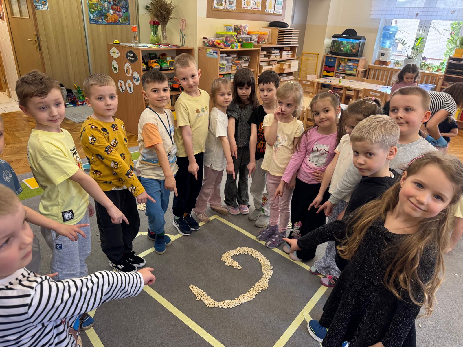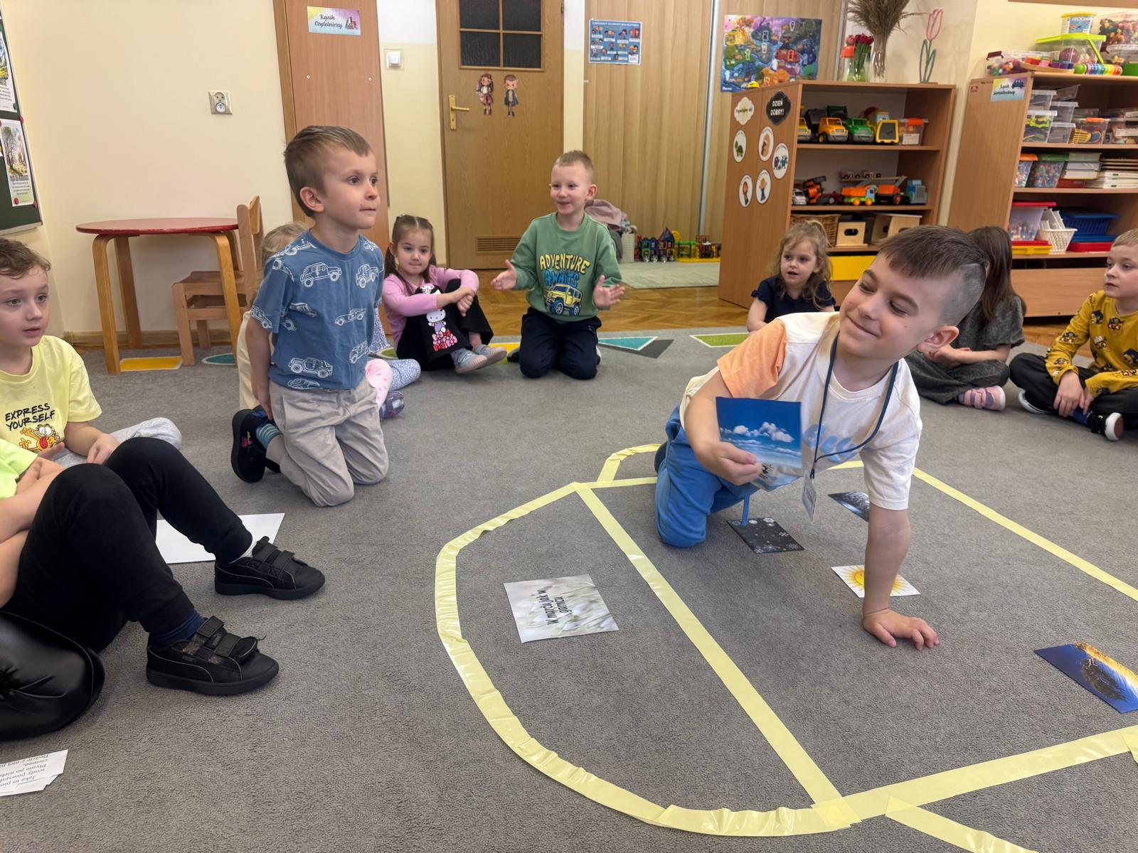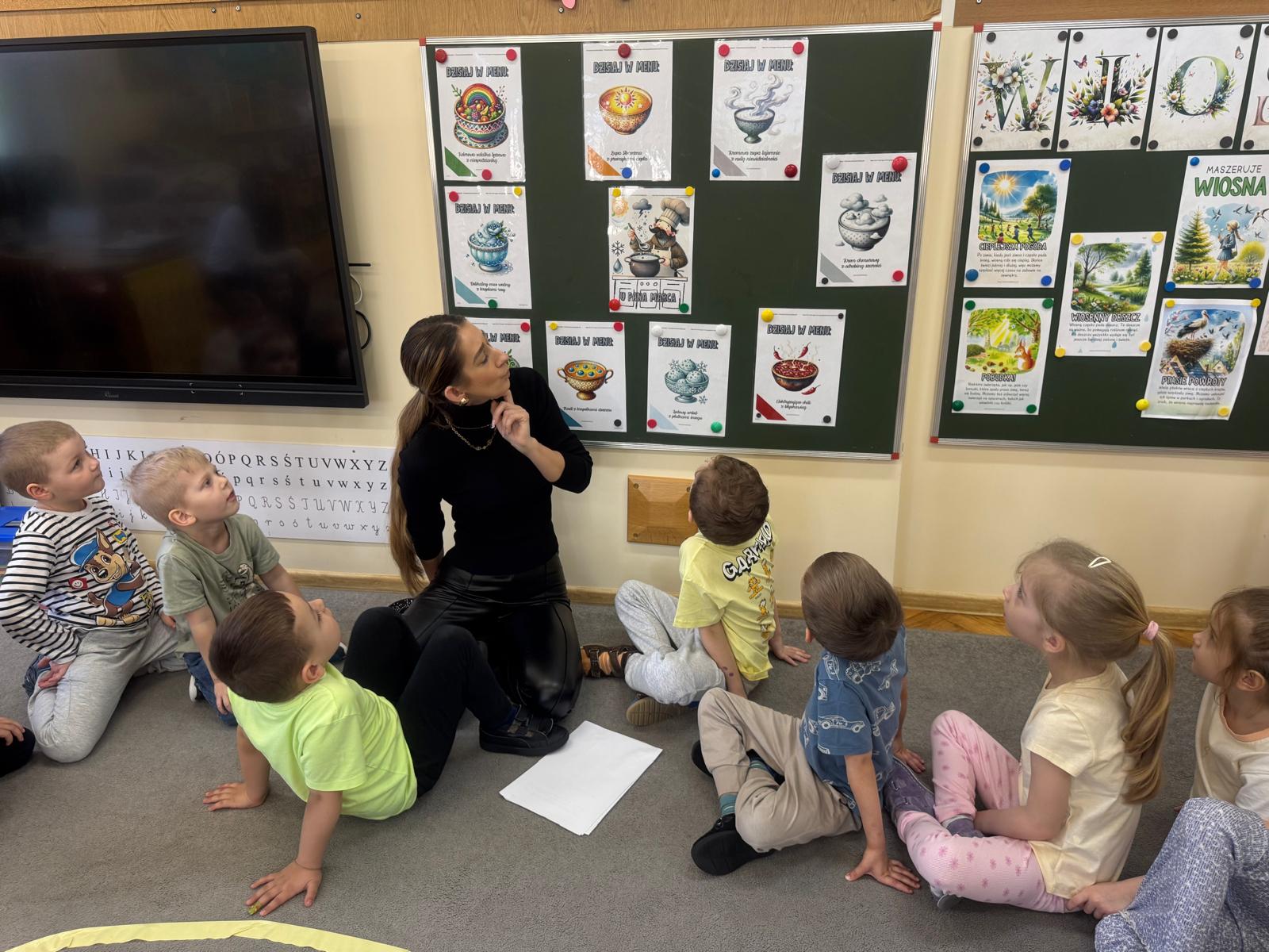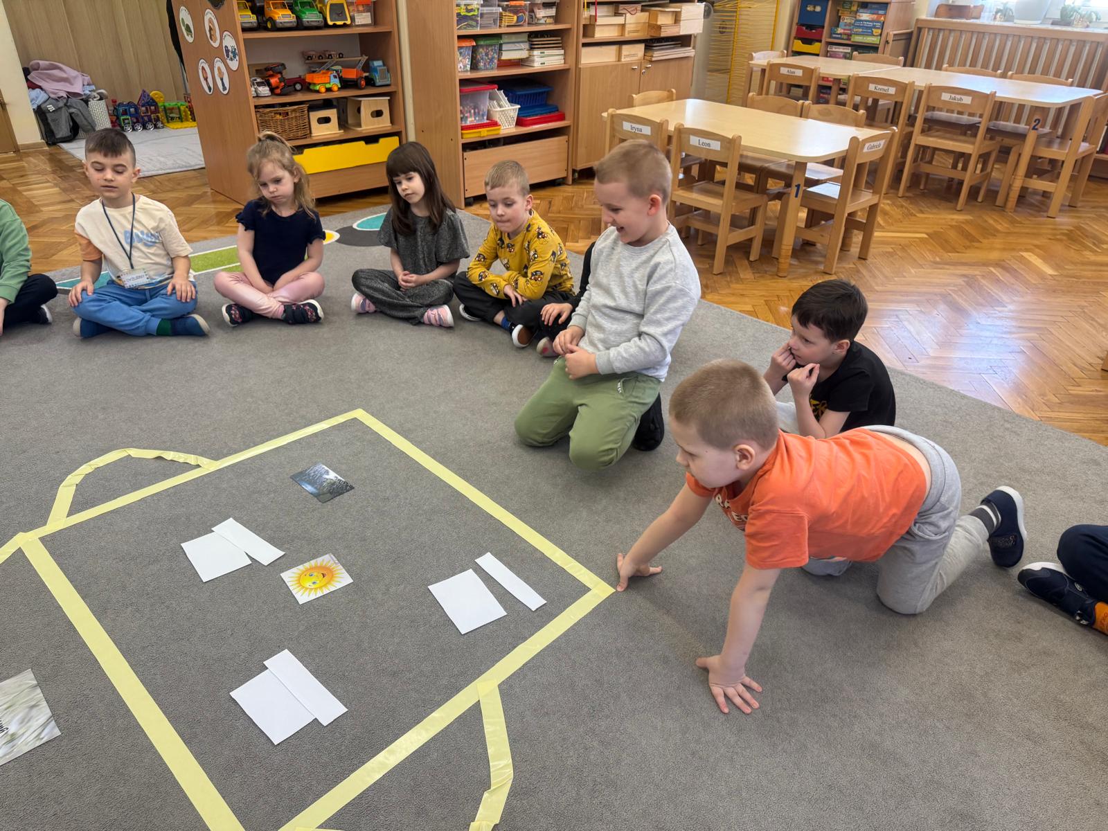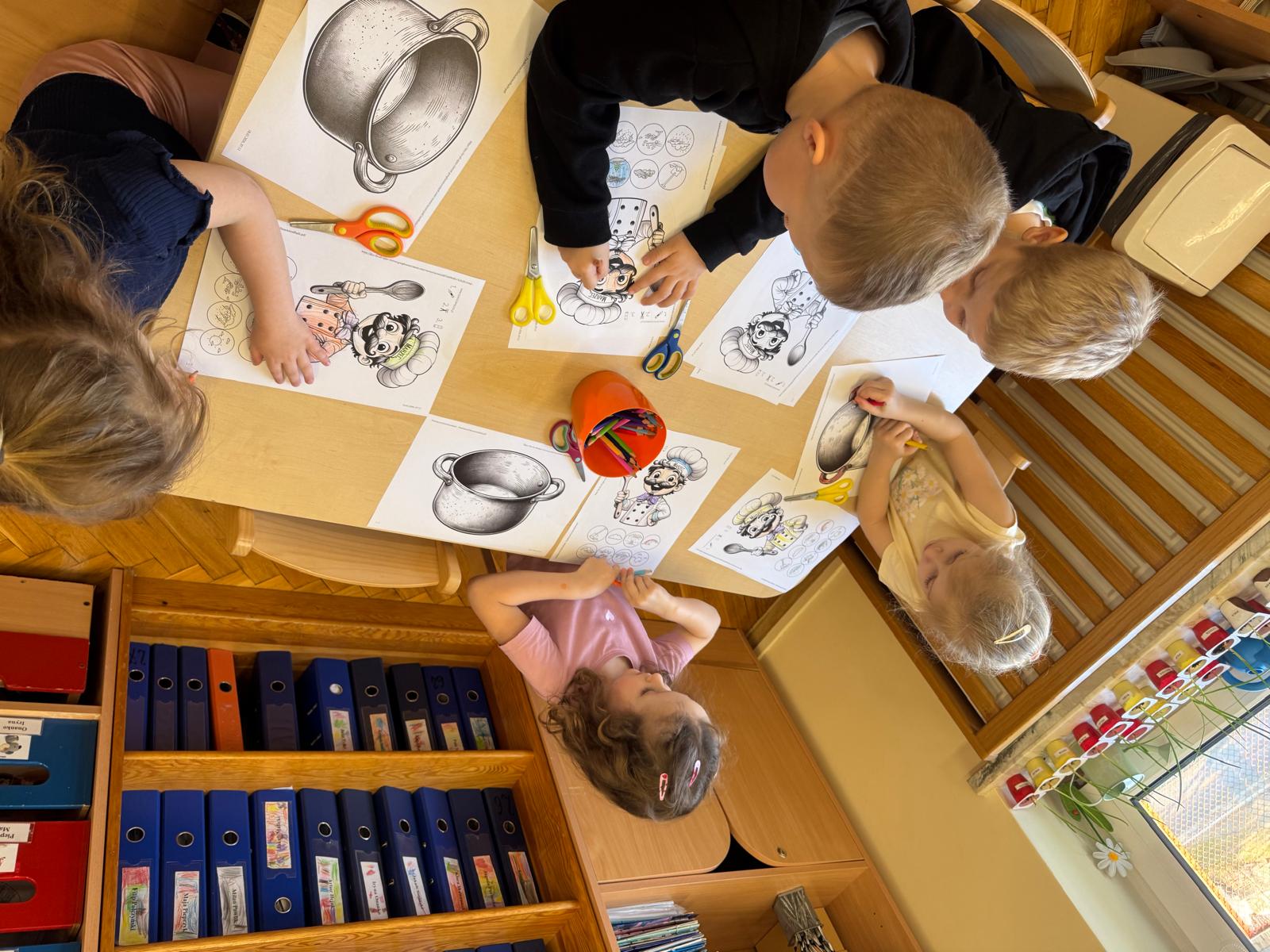 Na początku zajęć dzieci poznały znaczenie tego powiedzenia. Poprzez zabawę w zagadki dowiedziały się, jak zmienna potrafi być pogoda w marcu - od słońca, przez deszcz, aż po śnieg. Przedszkolaki świetnie poradziły sobie z ich odgadywaniem, wykazując się dużą wiedzą i spostrzegawczością. Następnie wspólnie bawiliśmy się w grę z kostką, na której znajdowały się symbole pogodowe. Dzieci z radością rozpoznawały wylosowane zjawiska i aktywnie uczestniczyły w zabawie. Utrwaliliśmy również poznaną w tym tygodniu literę „g” - dzieci z dużym zaangażowaniem układały jej kształt z ziaren grochu. Kolejnym punktem dnia była praca plastyczna - mali artyści stworzyli kucharzy mieszających w garnkach różne rodzaje pogody. Powstały bardzo pomysłowe i kolorowe prace. Na zakończenie zajęć dzieci wzięły udział w zabawie ruchowej z chustą animacyjną. Ich zadaniem było utrzymanie „deszczyku” na chuście, co sprawiło wszystkim wiele radości i śmiechu.