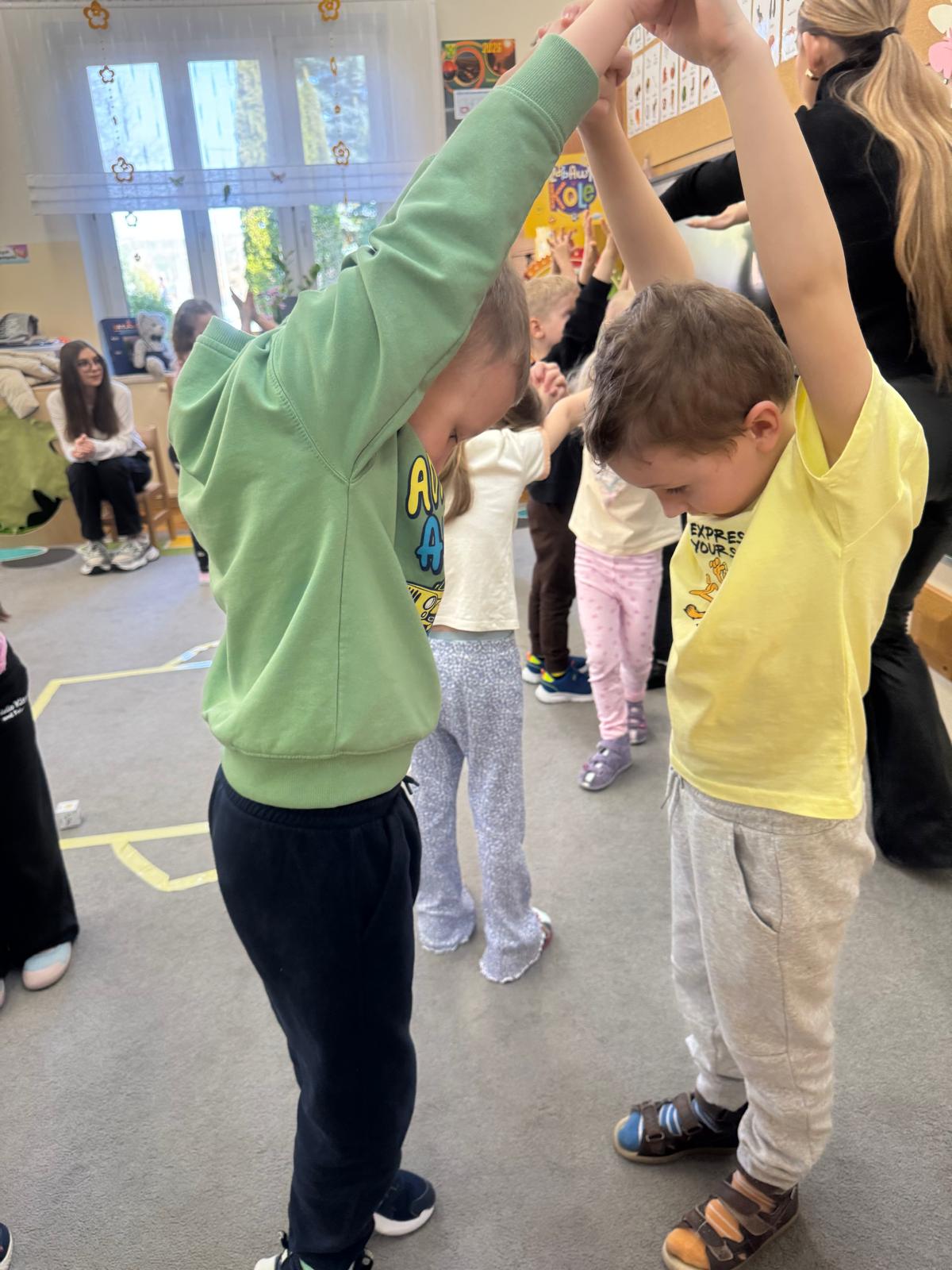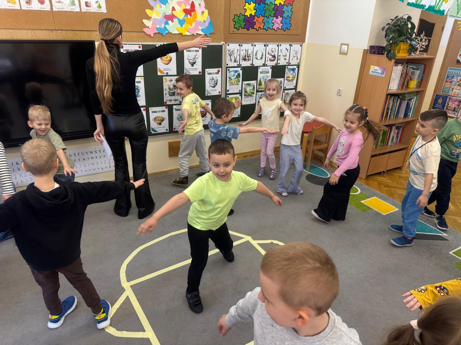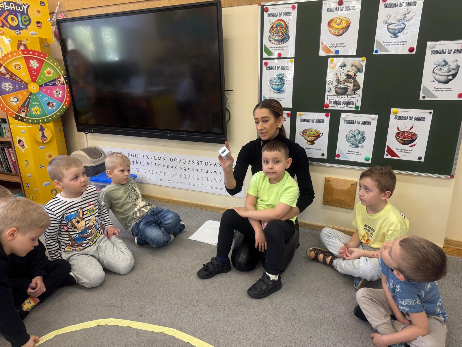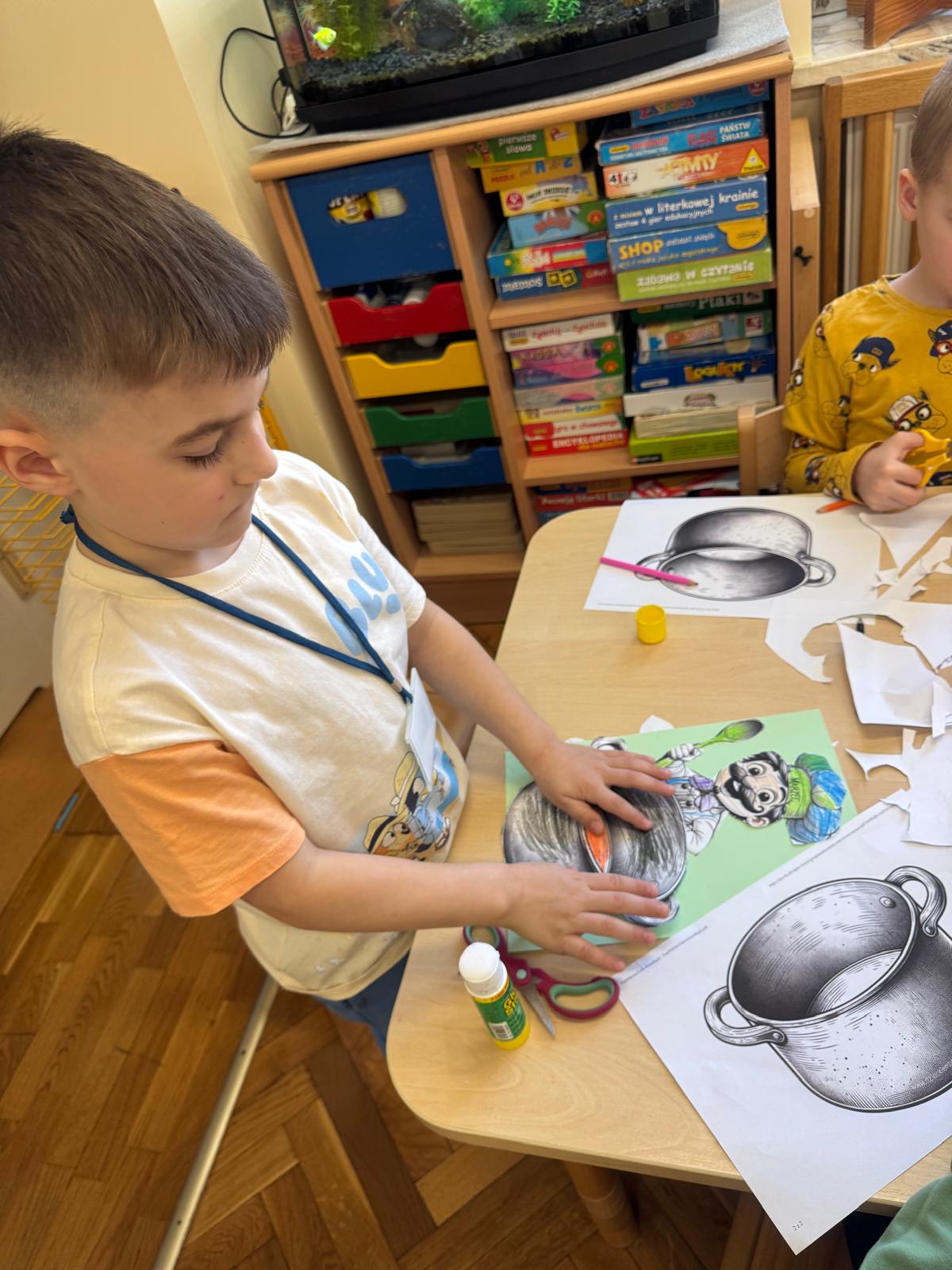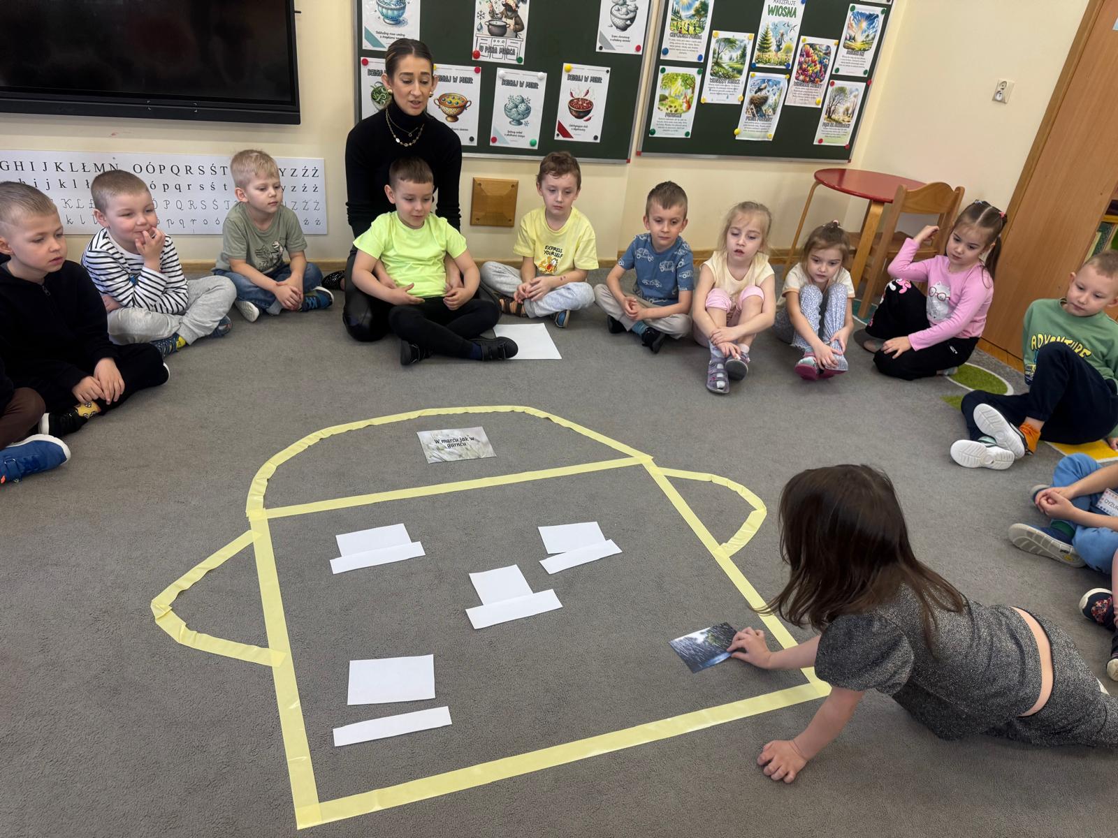Na początku zajęć dzieci poznały znaczenie tego powiedzenia. Poprzez zabawę w zagadki dowiedziały się, jak zmienna potrafi być pogoda w marcu - od słońca, przez deszcz, aż po śnieg. Przedszkolaki świetnie poradziły sobie z ich odgadywaniem, wykazując się dużą wiedzą i spostrzegawczością. Następnie wspólnie bawiliśmy się w grę z kostką, na której znajdowały się symbole pogodowe. Dzieci z radością rozpoznawały wylosowane zjawiska i aktywnie uczestniczyły w zabawie. Utrwaliliśmy również poznaną w tym tygodniu literę „g” - dzieci z dużym zaangażowaniem układały jej kształt z ziaren grochu. Kolejnym punktem dnia była praca plastyczna - mali artyści stworzyli kucharzy mieszających w garnkach różne rodzaje pogody. Powstały bardzo pomysłowe i kolorowe prace. Na zakończenie zajęć dzieci wzięły udział w zabawie ruchowej z chustą animacyjną. Ich zadaniem było utrzymanie „deszczyku” na chuście, co sprawiło wszystkim wiele radości i śmiechu.