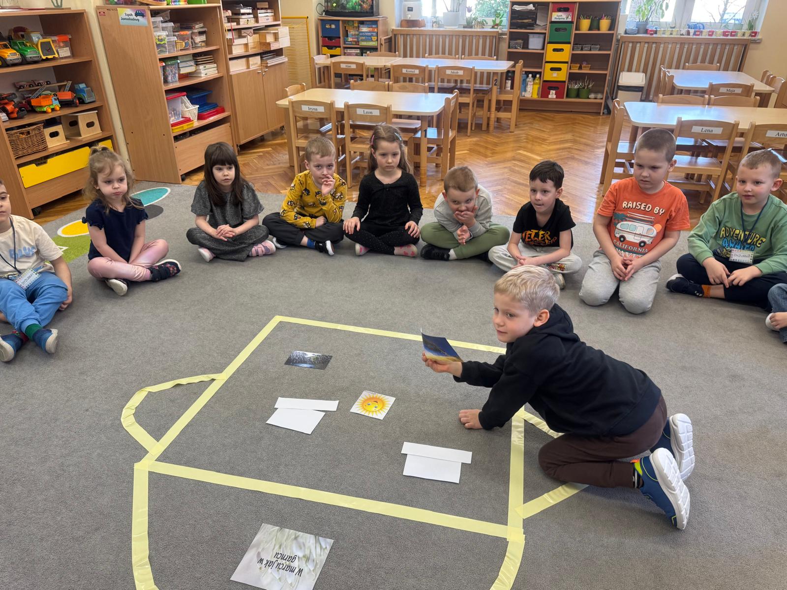 Dzisiejszy dzień w grupie pięciolatków „Promyczki” upłynął pod znakiem marcowej pogody i znanego przysłowia „W marcu jak w garncu”.