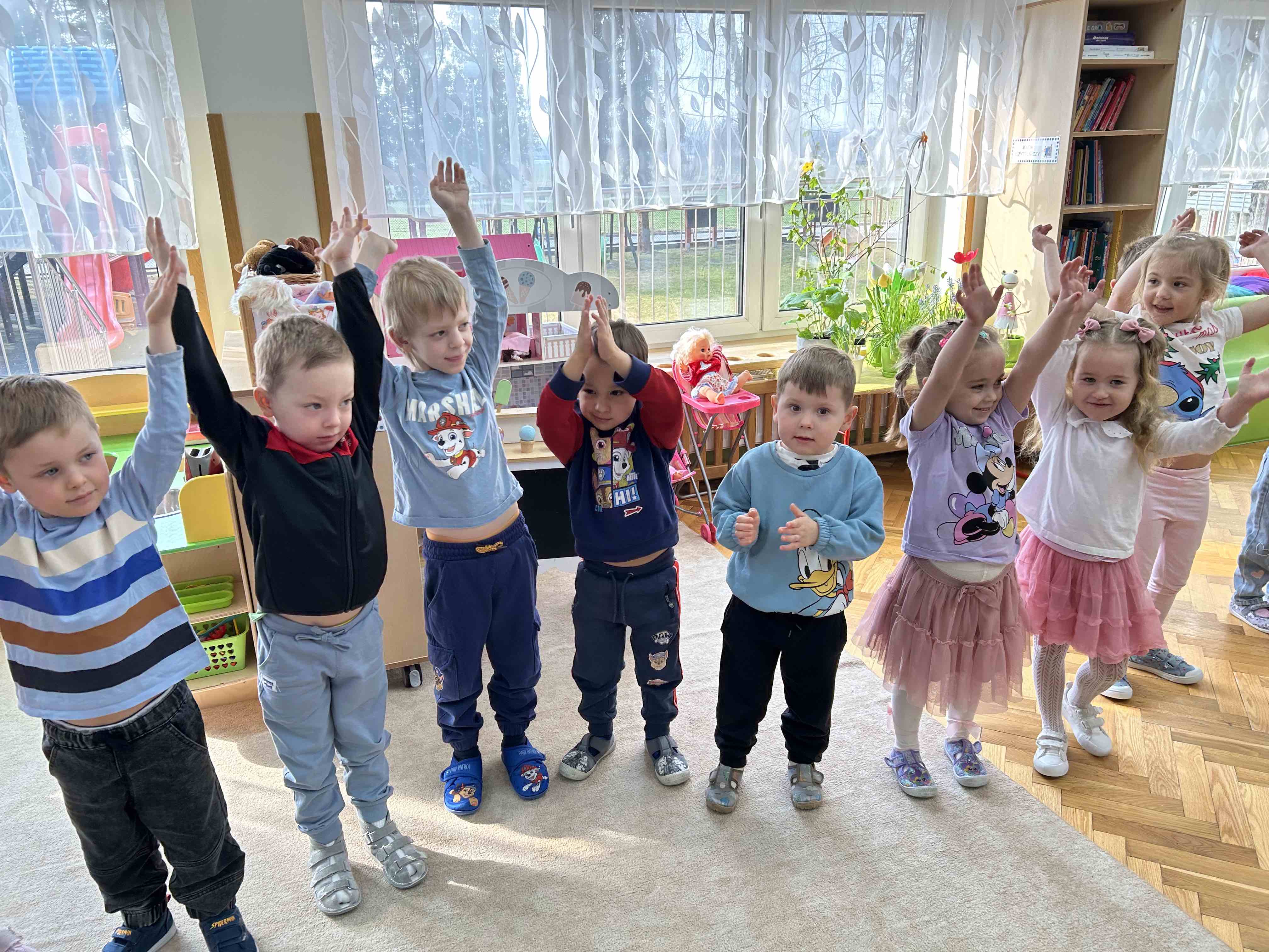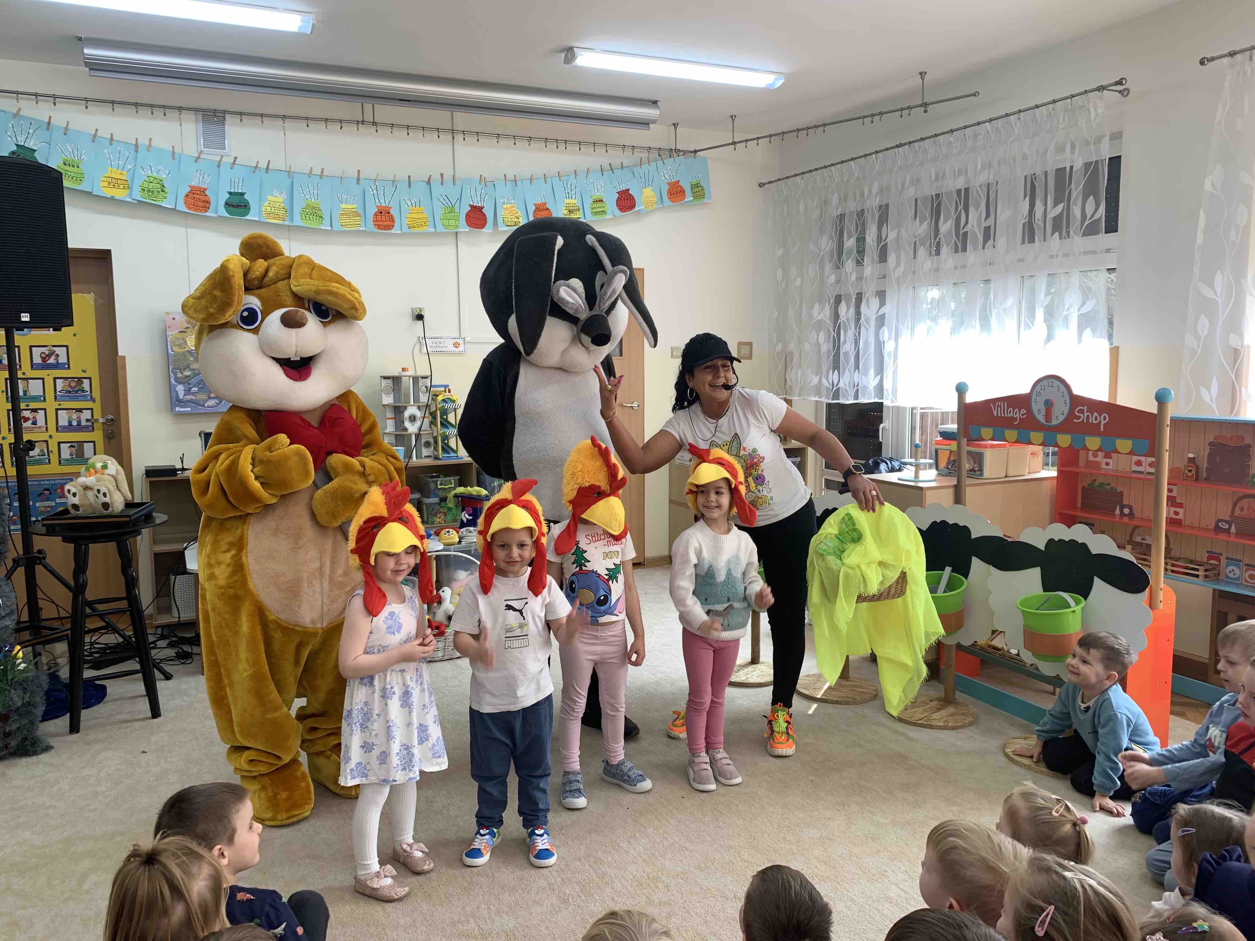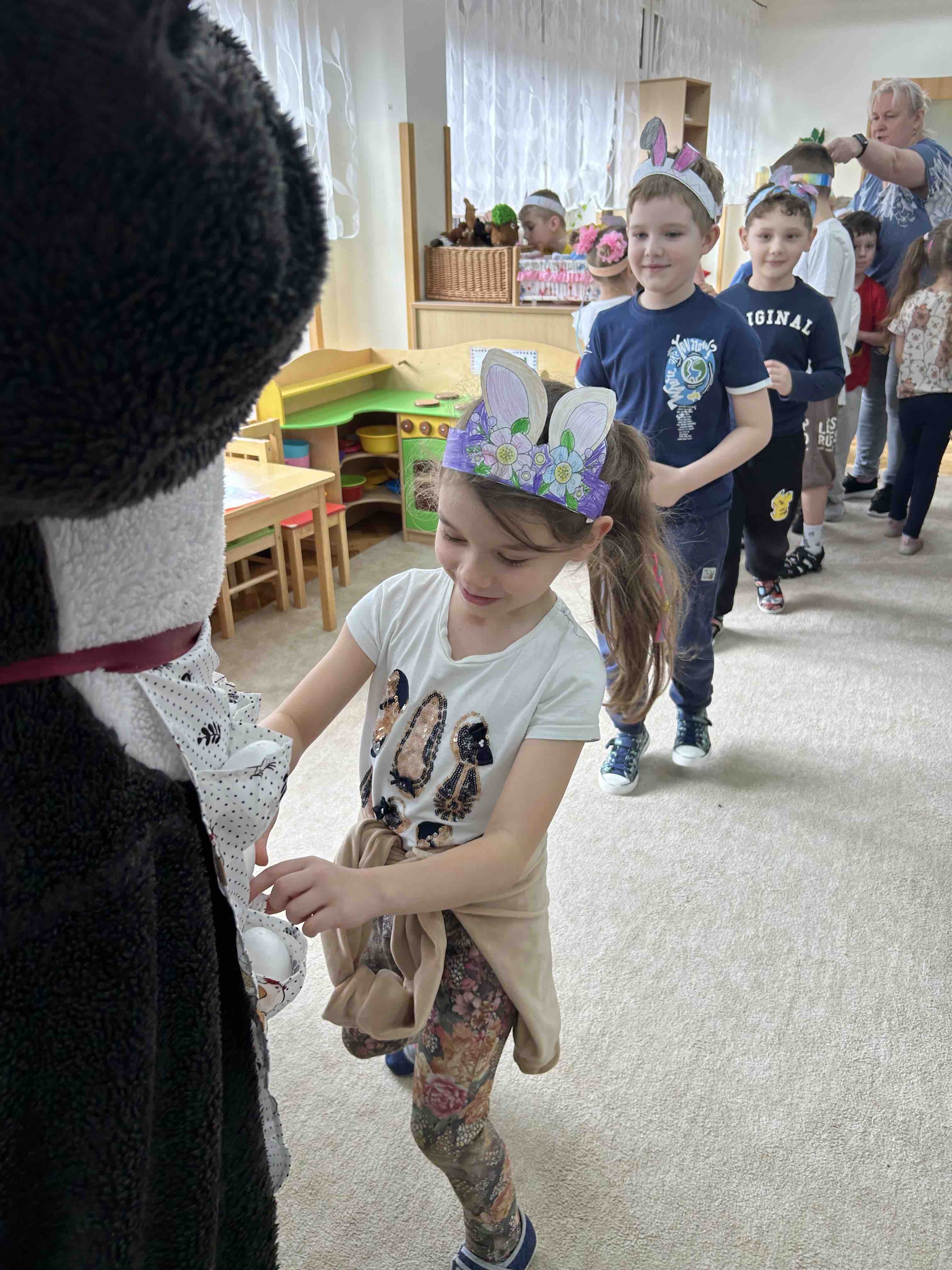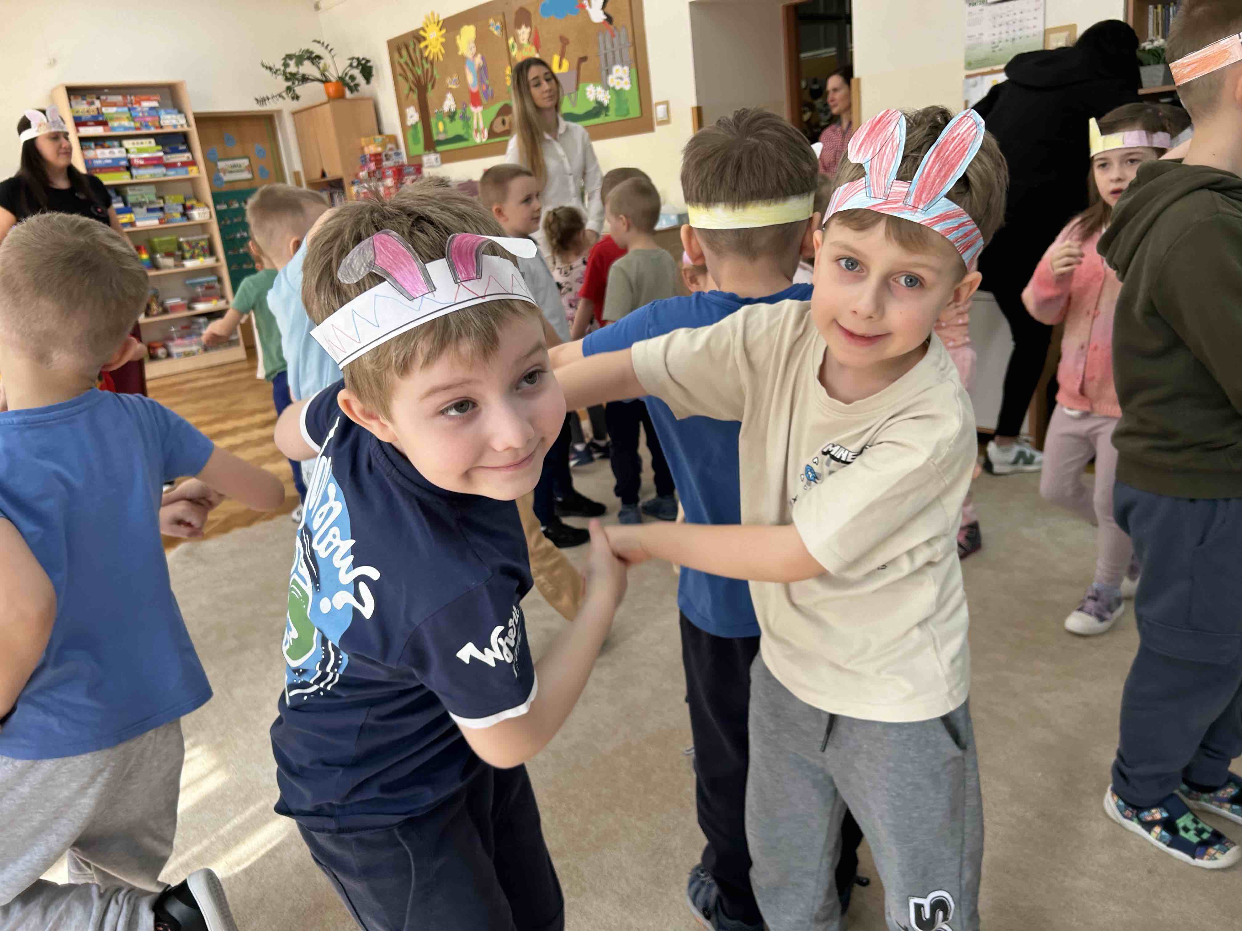 Przedszkolaki wzięły udział w emocjonujących konkurencjach drużynowych, które wywołały mnóstwo śmiechu i zdrowej rywalizacji. Było przenoszenie jajek, zadania sprawnościowe oraz zabawy wymagające współpracy. Dzieci śpiewały również wesołe, wielkanocne piosenki, tworząc radosną atmosferę, która udzieliła się wszystkim obecnym.