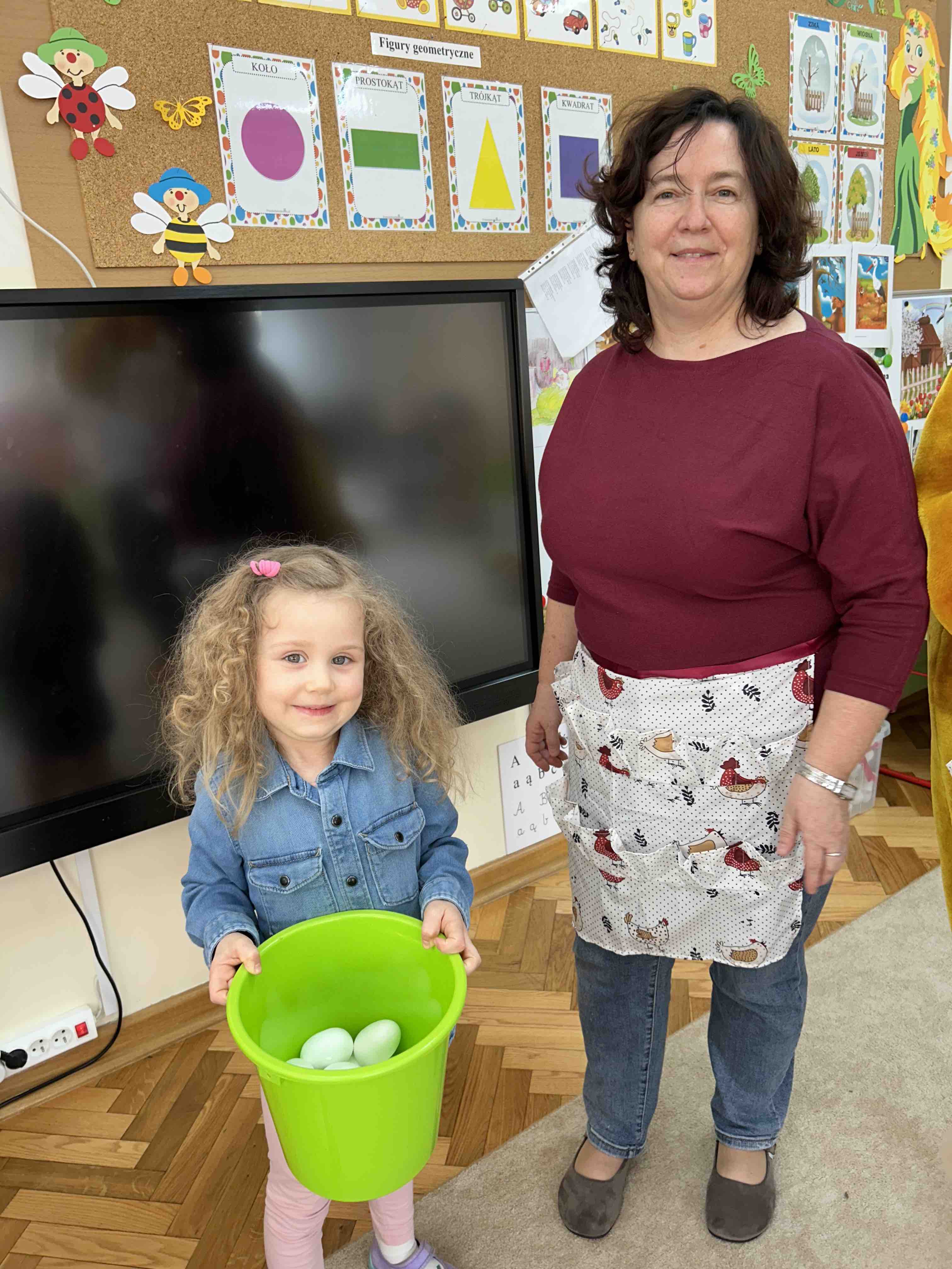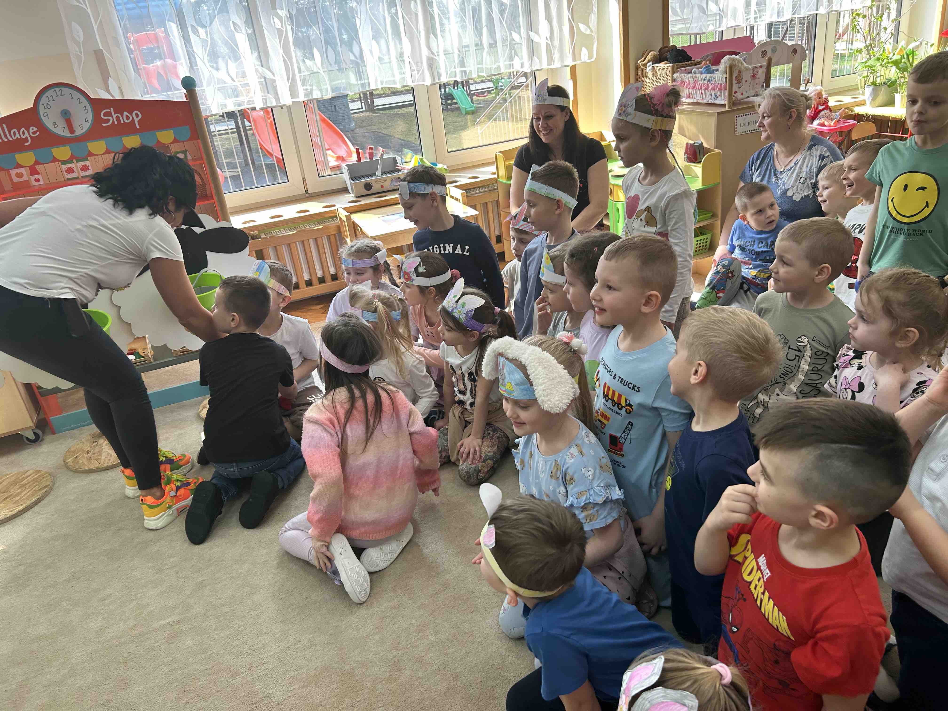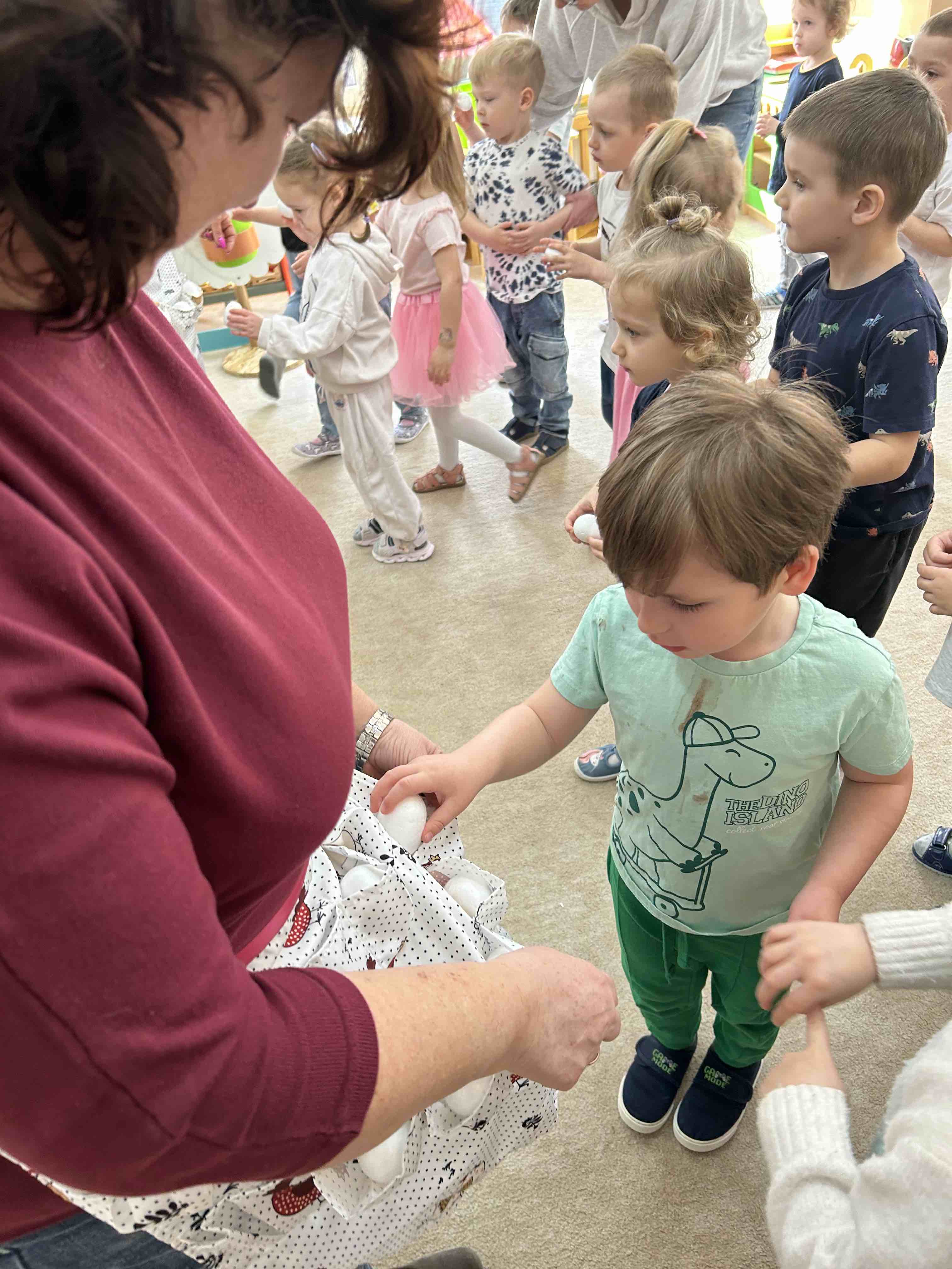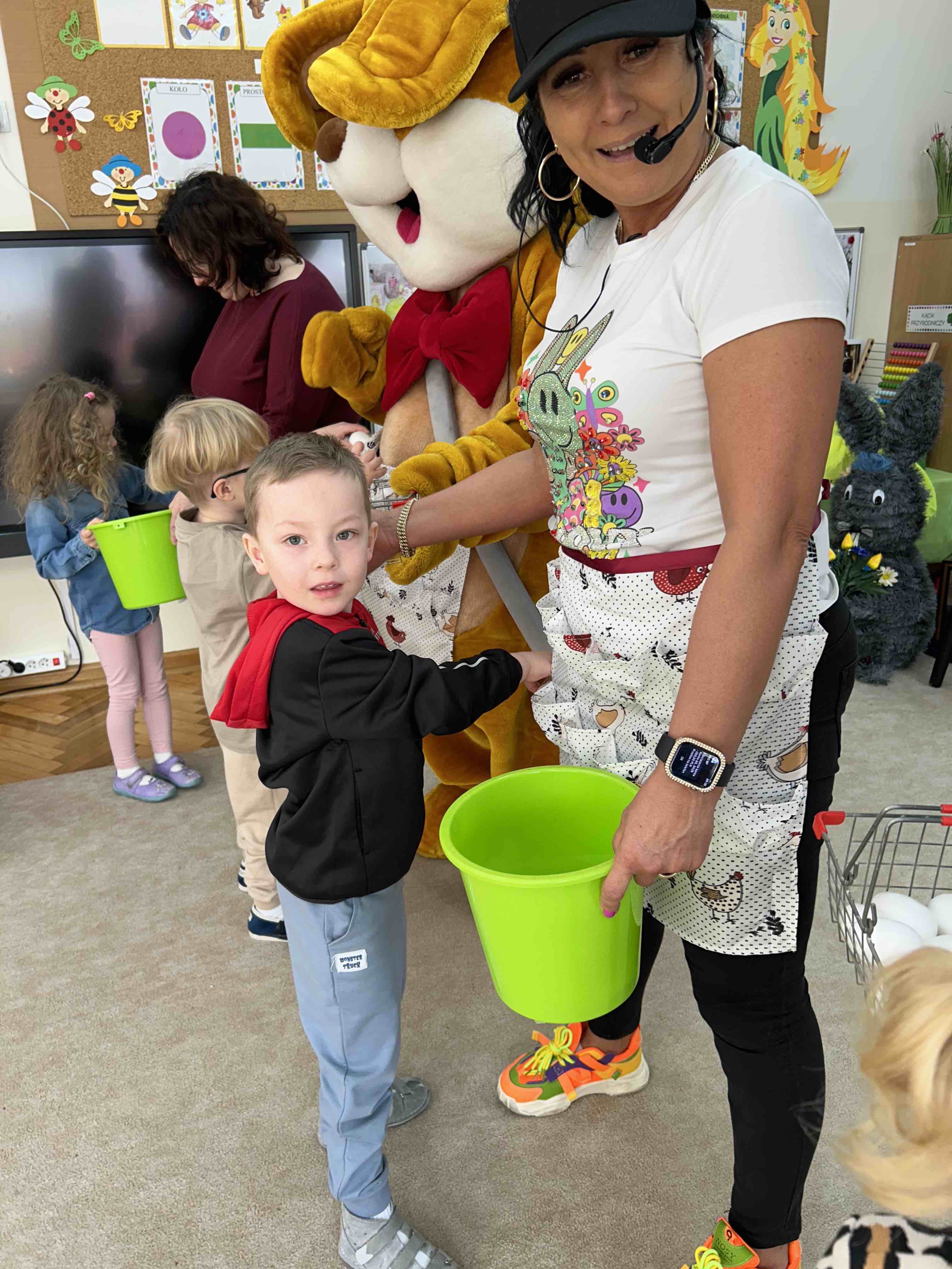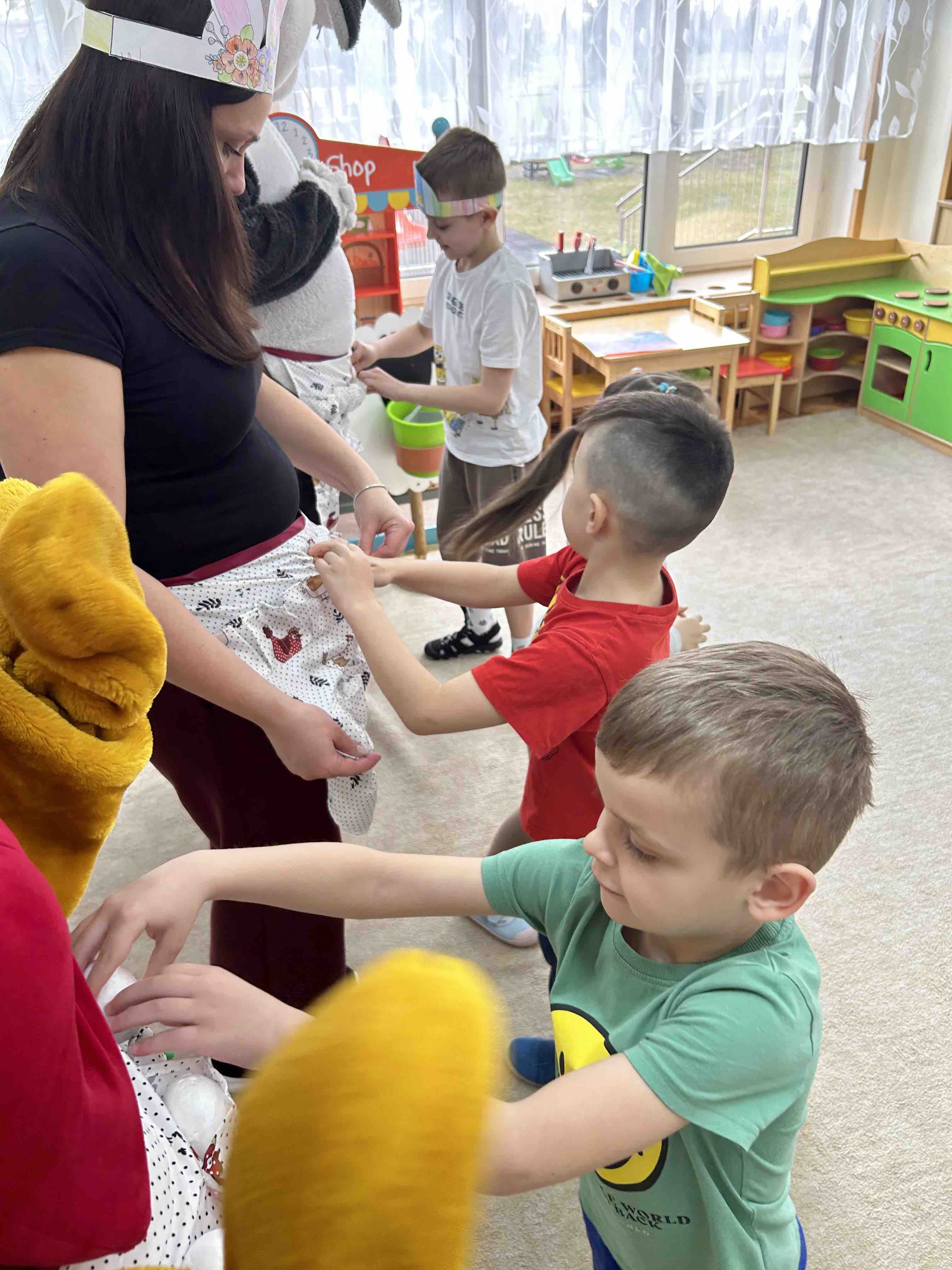 Przedszkolaki wzięły udział w emocjonujących konkurencjach drużynowych, które wywołały mnóstwo śmiechu i zdrowej rywalizacji. Było przenoszenie jajek, zadania sprawnościowe oraz zabawy wymagające współpracy. Dzieci śpiewały również wesołe, wielkanocne piosenki, tworząc radosną atmosferę, która udzieliła się wszystkim obecnym.