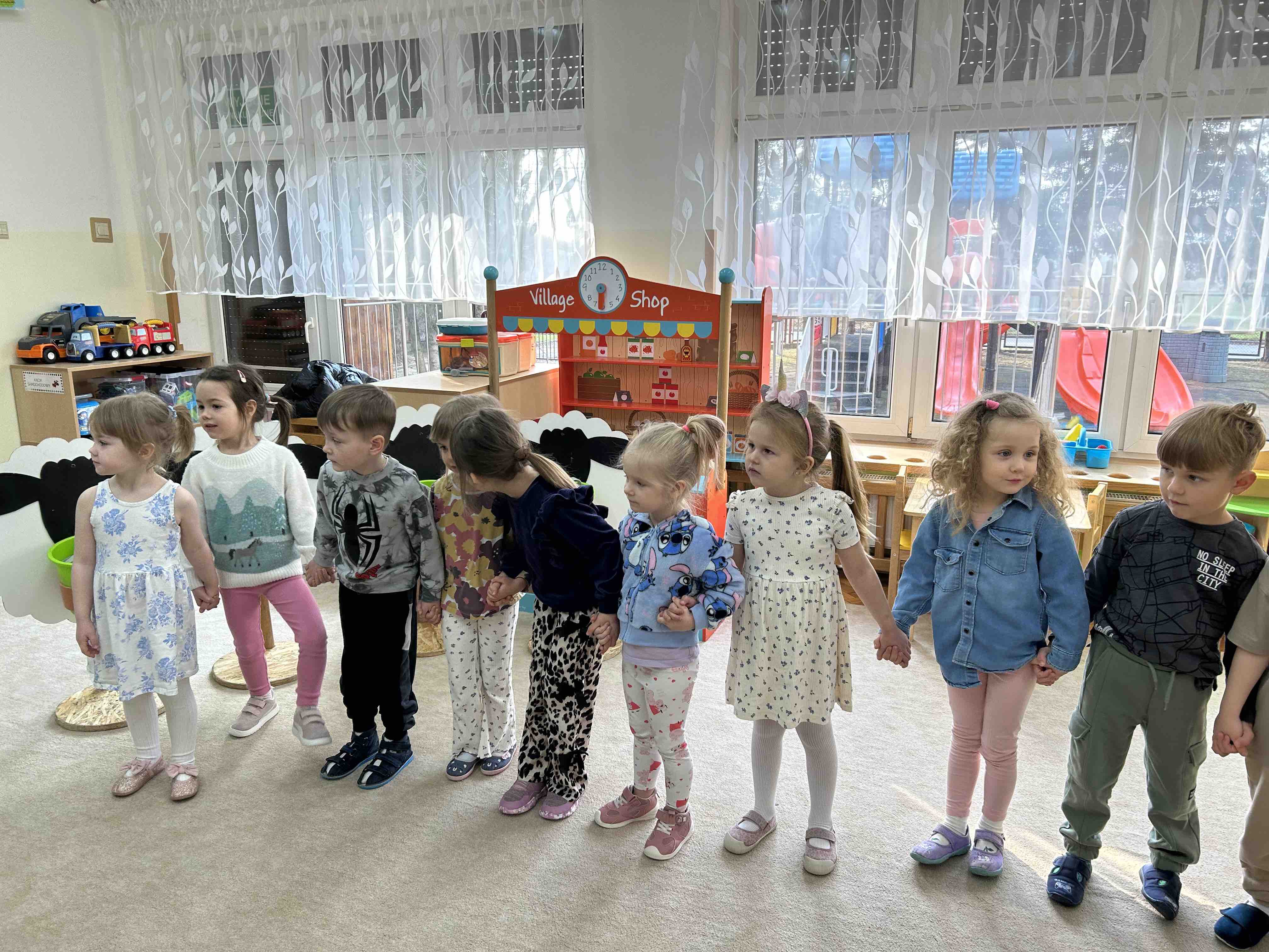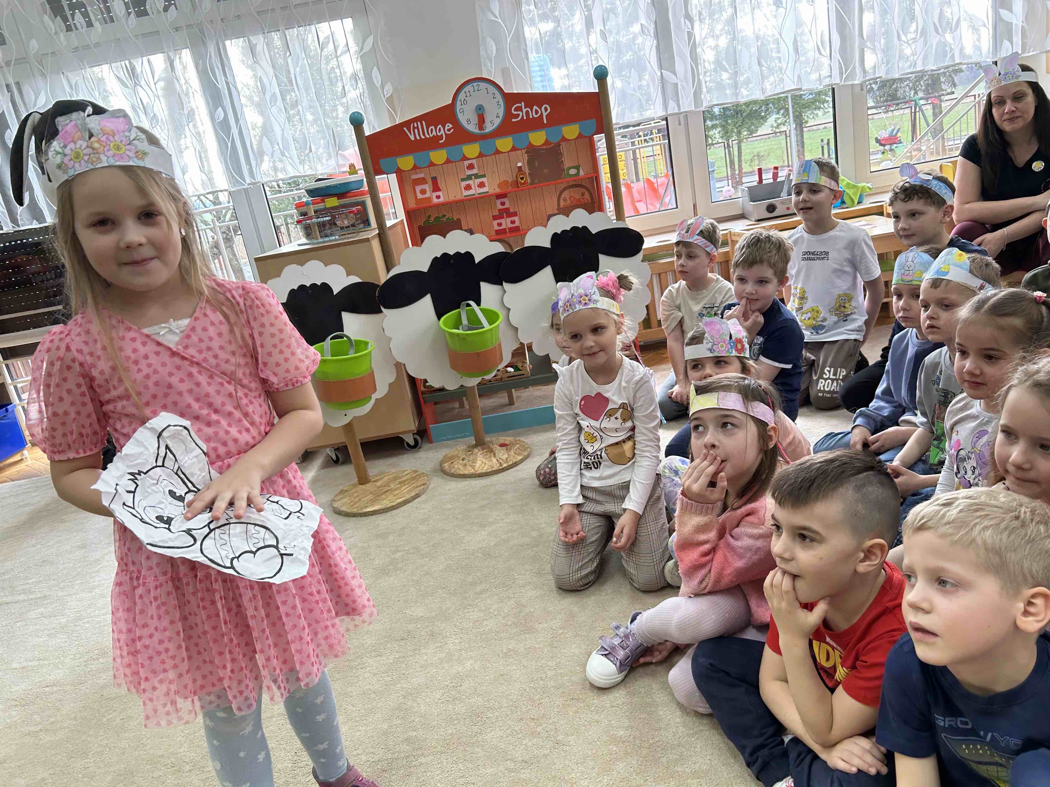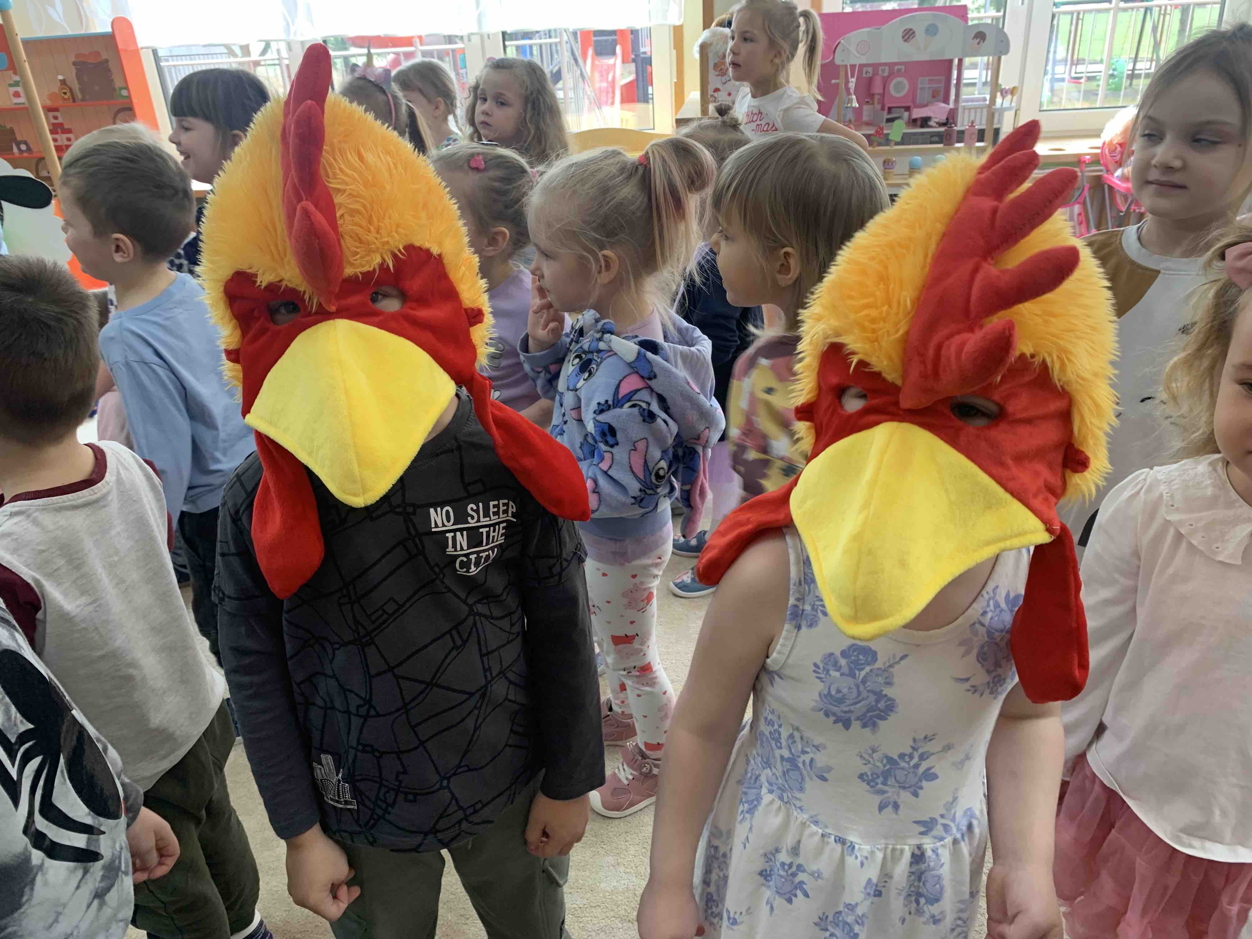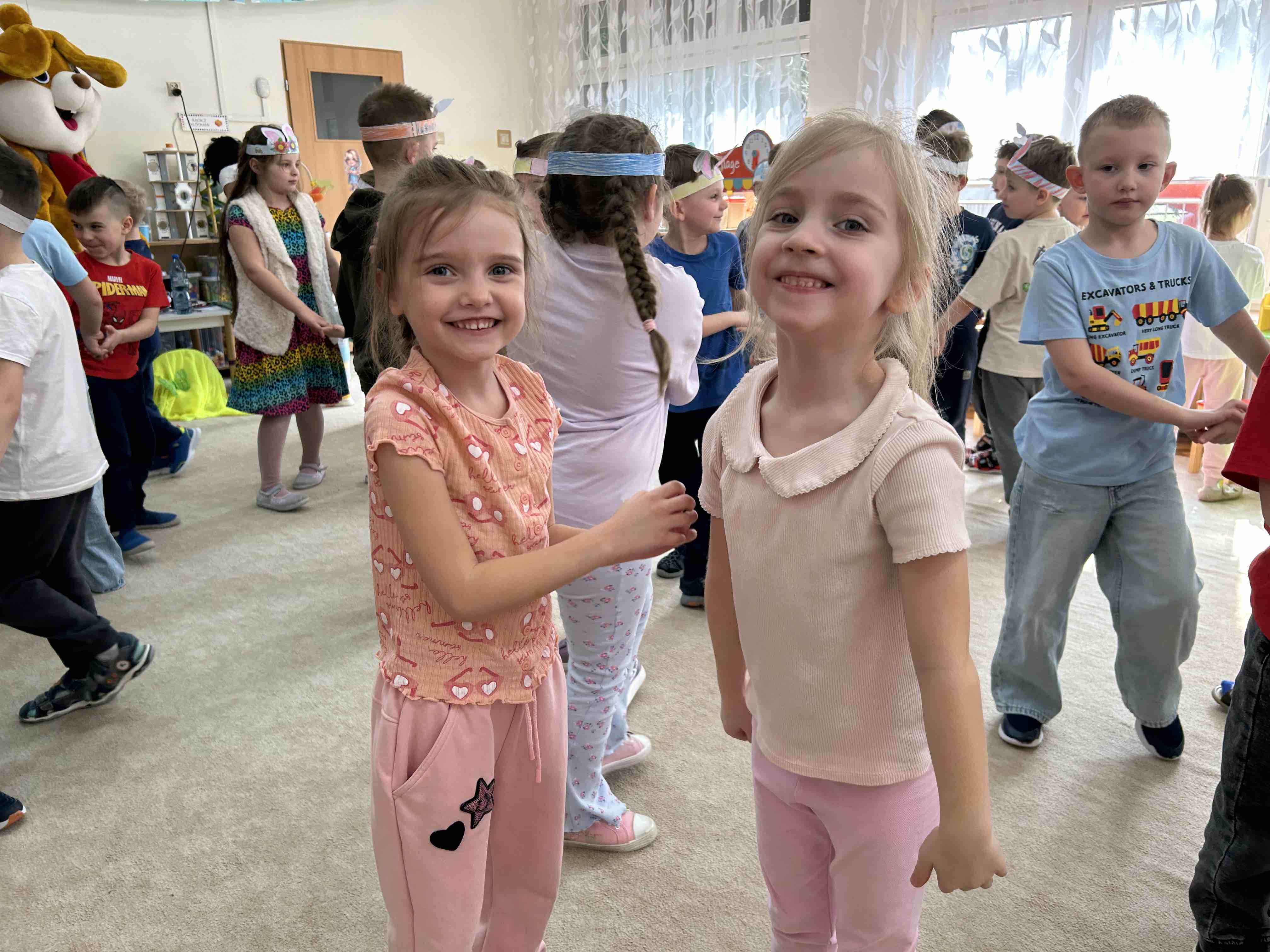 Przedszkolaki wzięły udział w emocjonujących konkurencjach drużynowych, które wywołały mnóstwo śmiechu i zdrowej rywalizacji. Było przenoszenie jajek, zadania sprawnościowe oraz zabawy wymagające współpracy. Dzieci śpiewały również wesołe, wielkanocne piosenki, tworząc radosną atmosferę, która udzieliła się wszystkim obecnym.