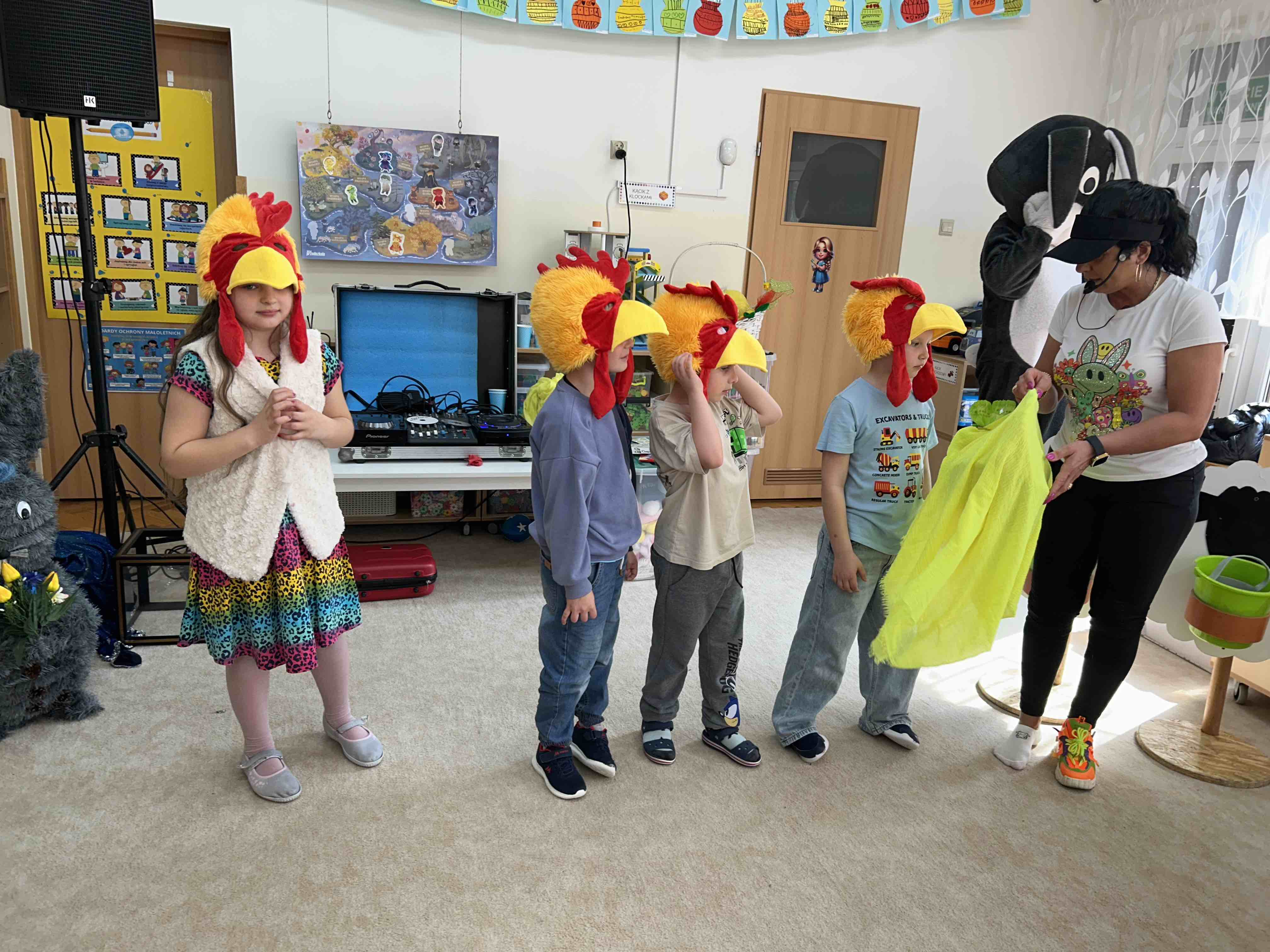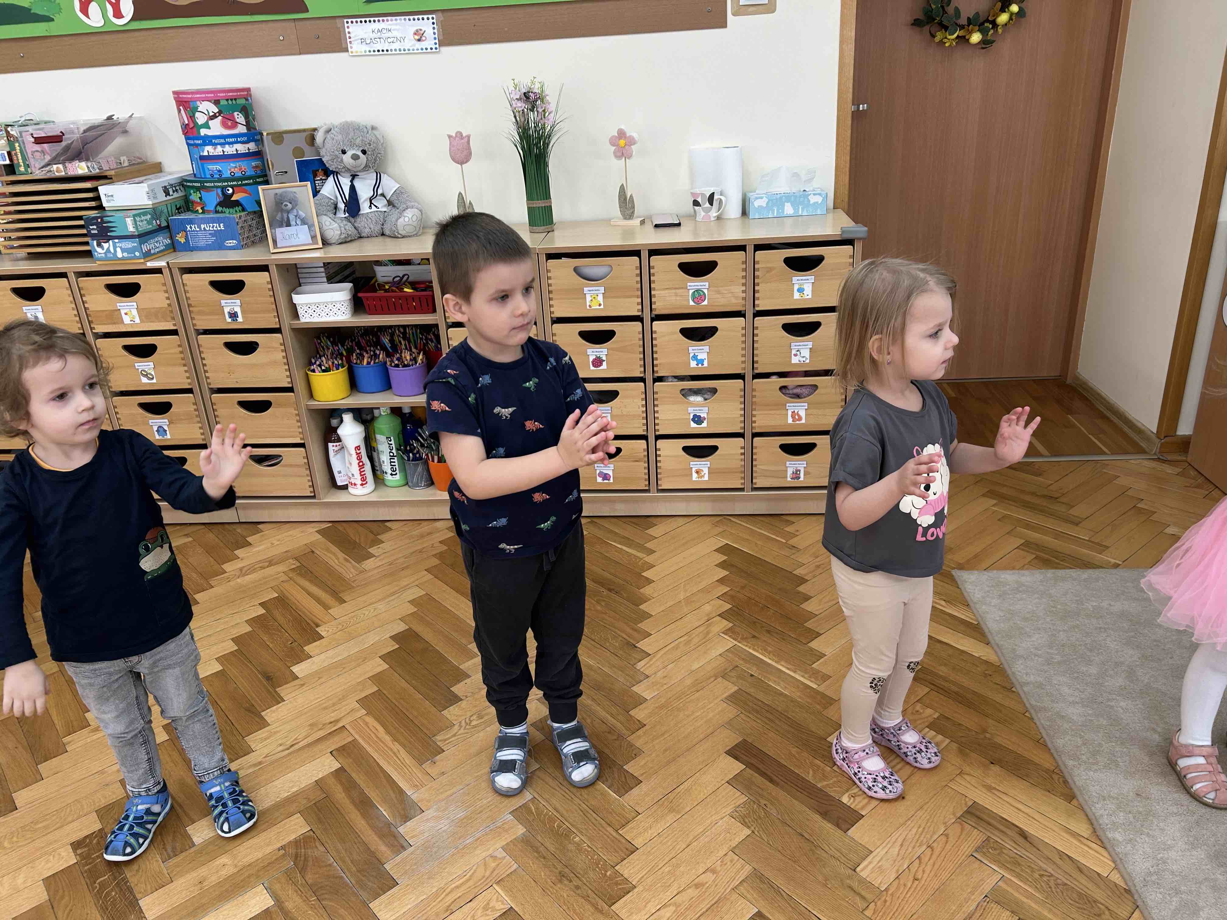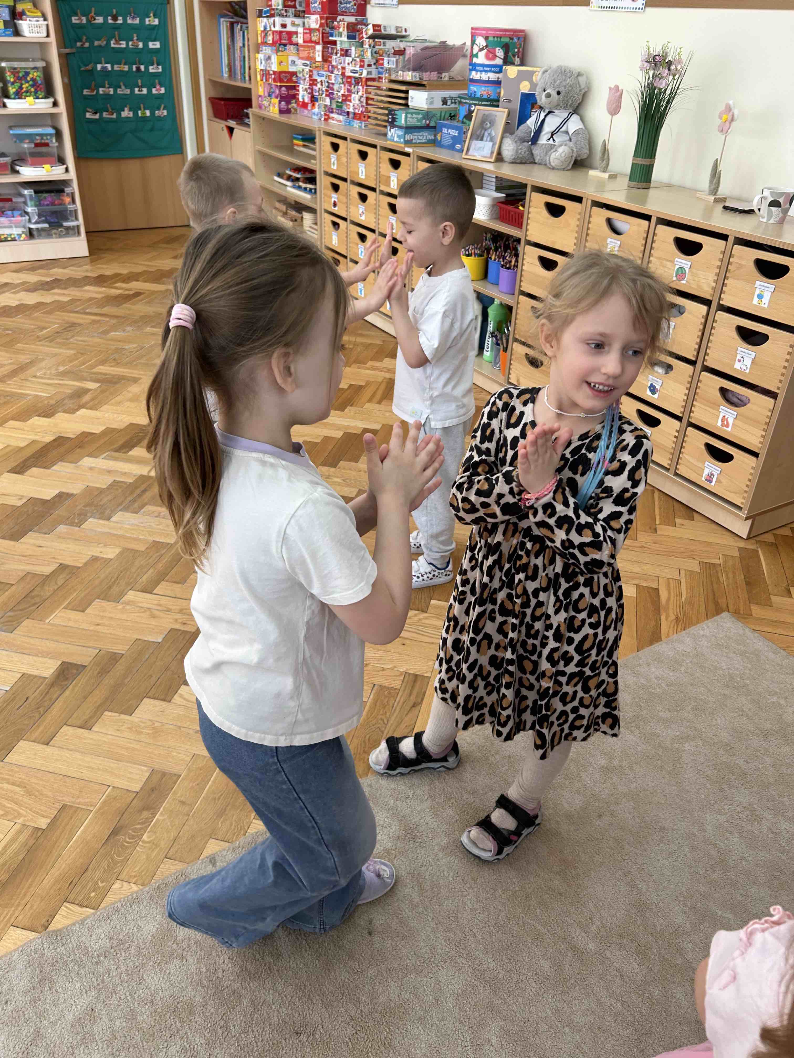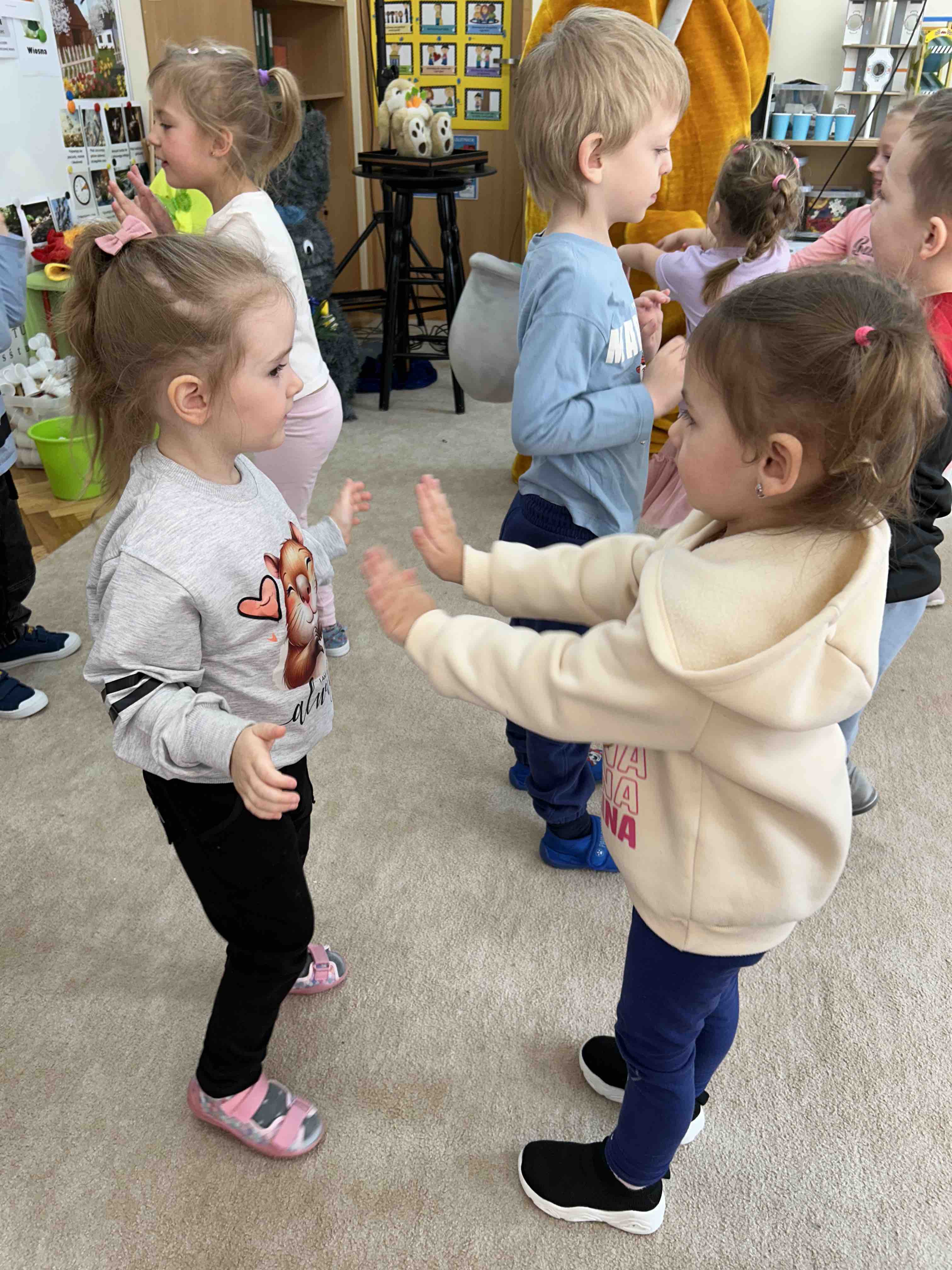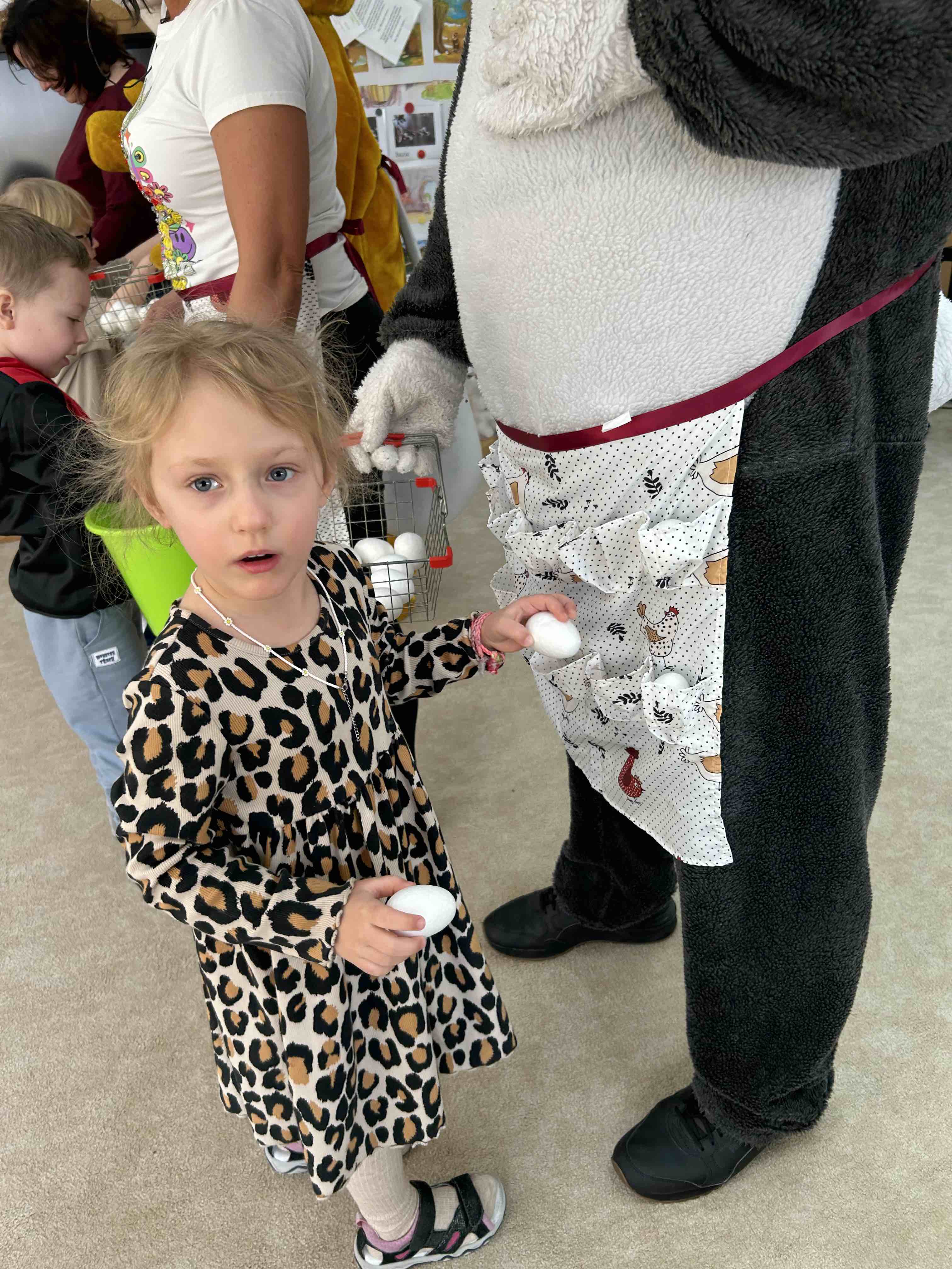 Przedszkolaki wzięły udział w emocjonujących konkurencjach drużynowych, które wywołały mnóstwo śmiechu i zdrowej rywalizacji. Było przenoszenie jajek, zadania sprawnościowe oraz zabawy wymagające współpracy. Dzieci śpiewały również wesołe, wielkanocne piosenki, tworząc radosną atmosferę, która udzieliła się wszystkim obecnym.