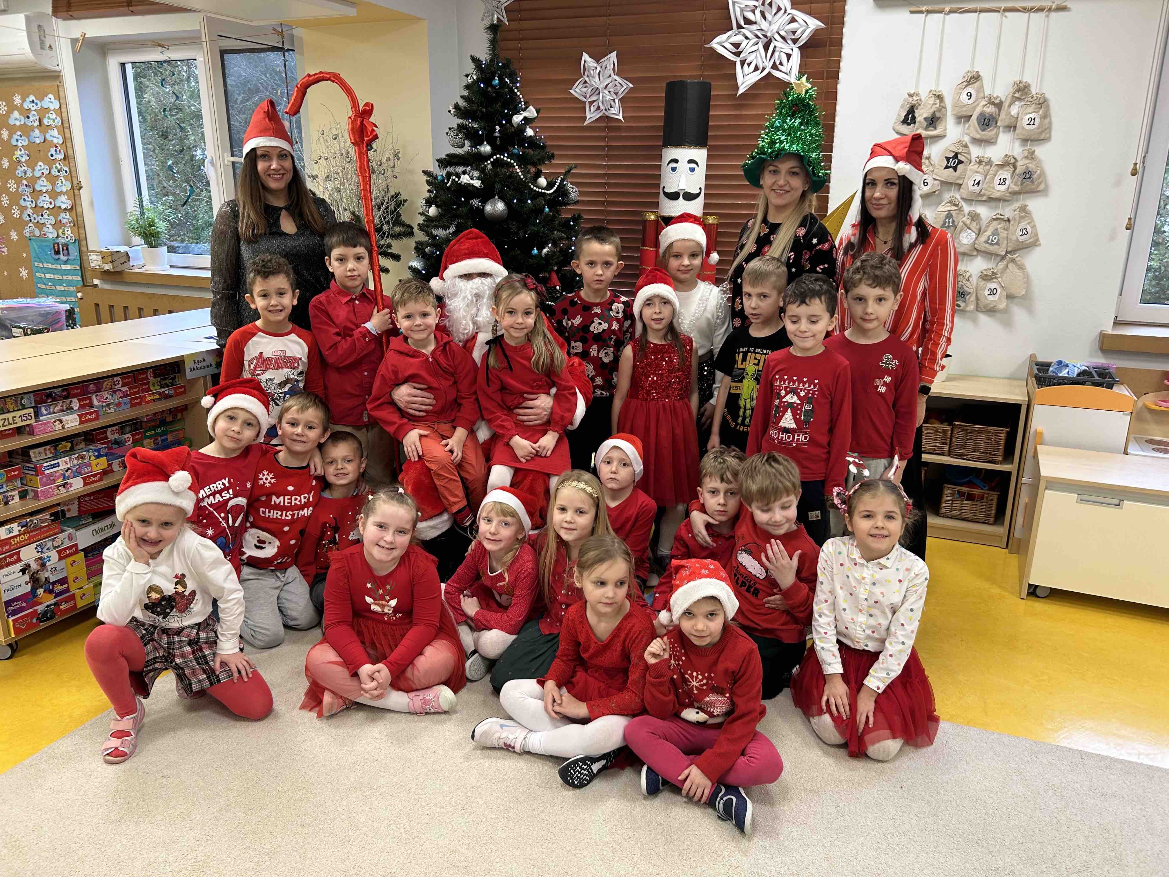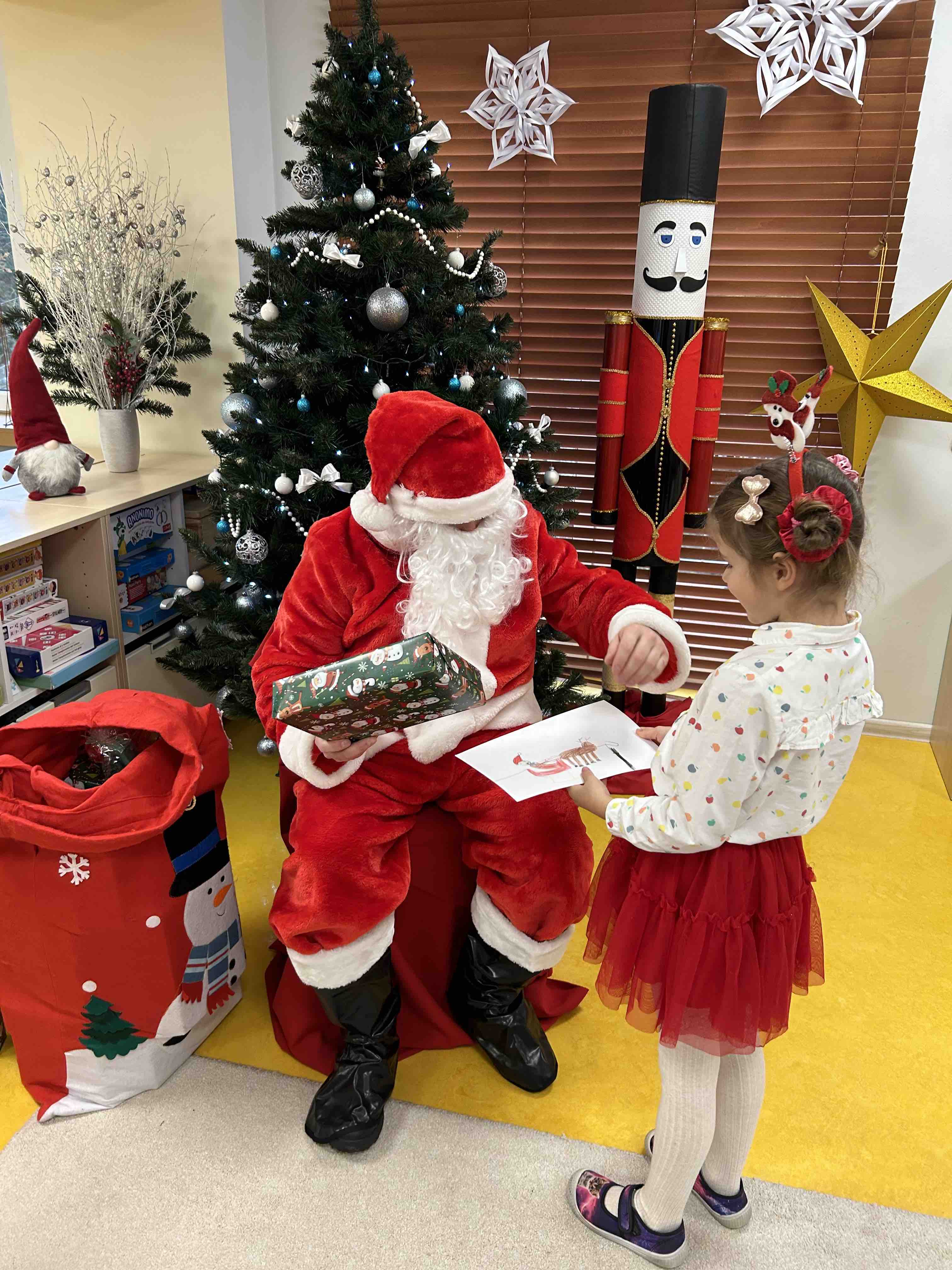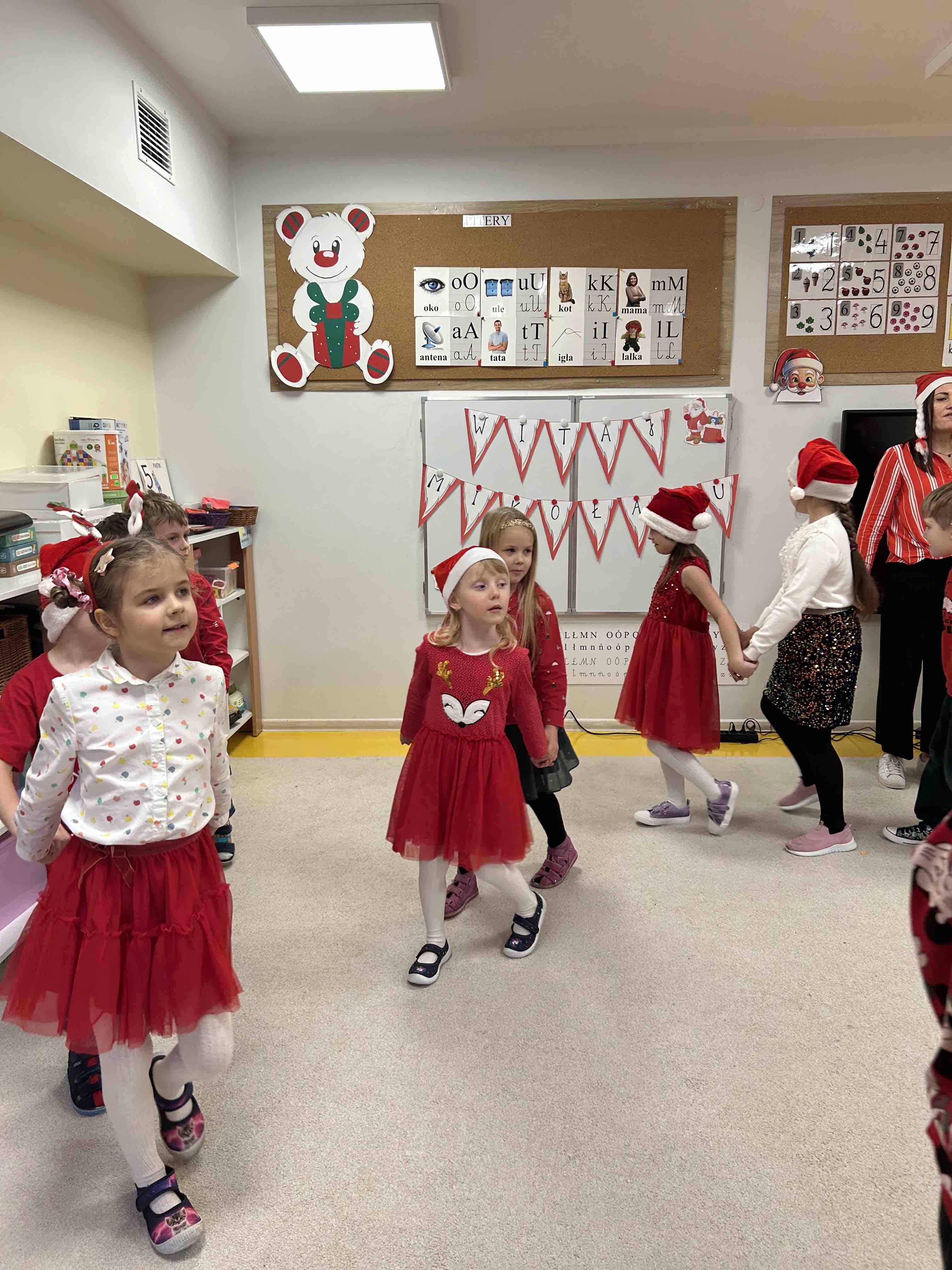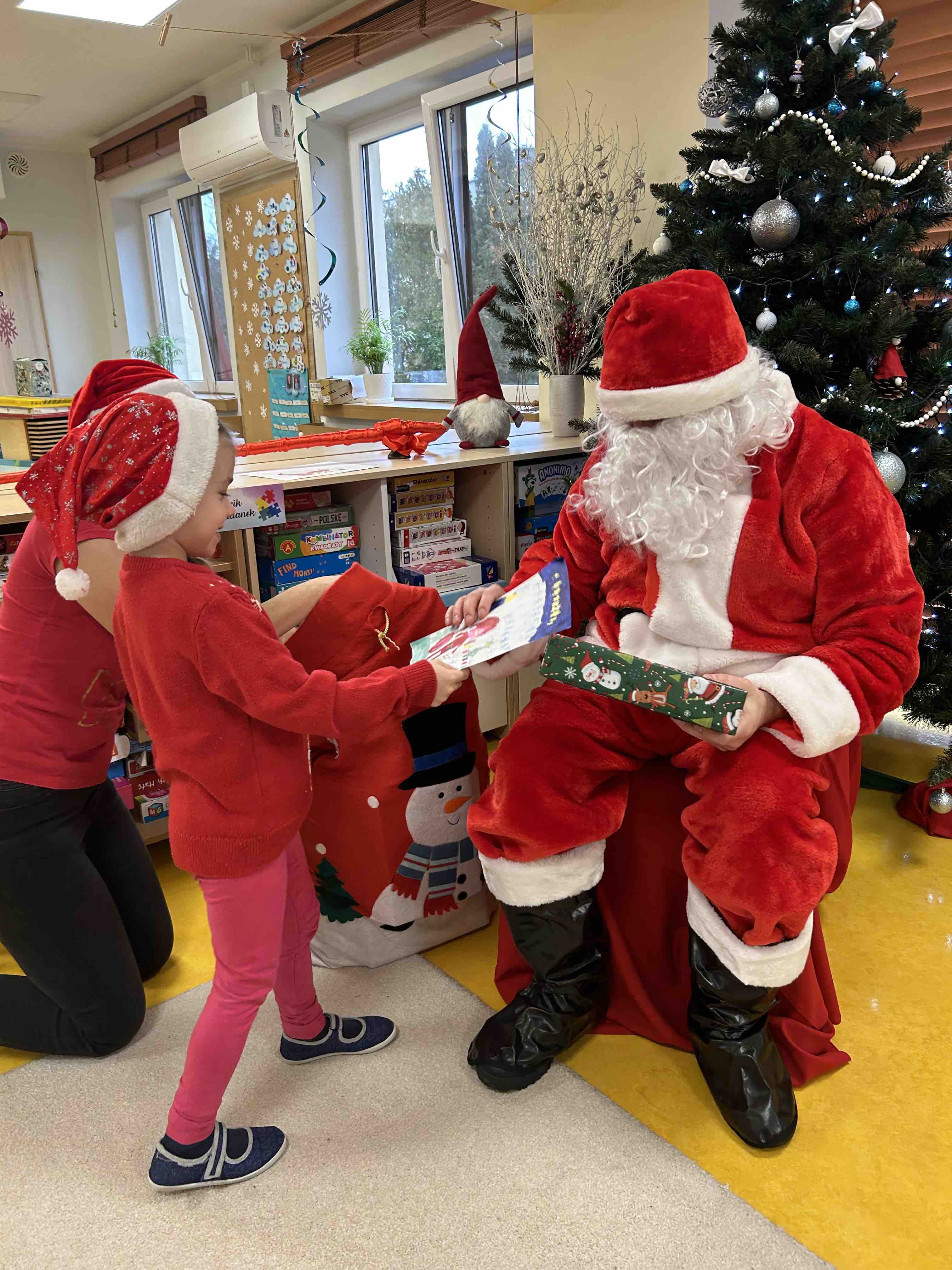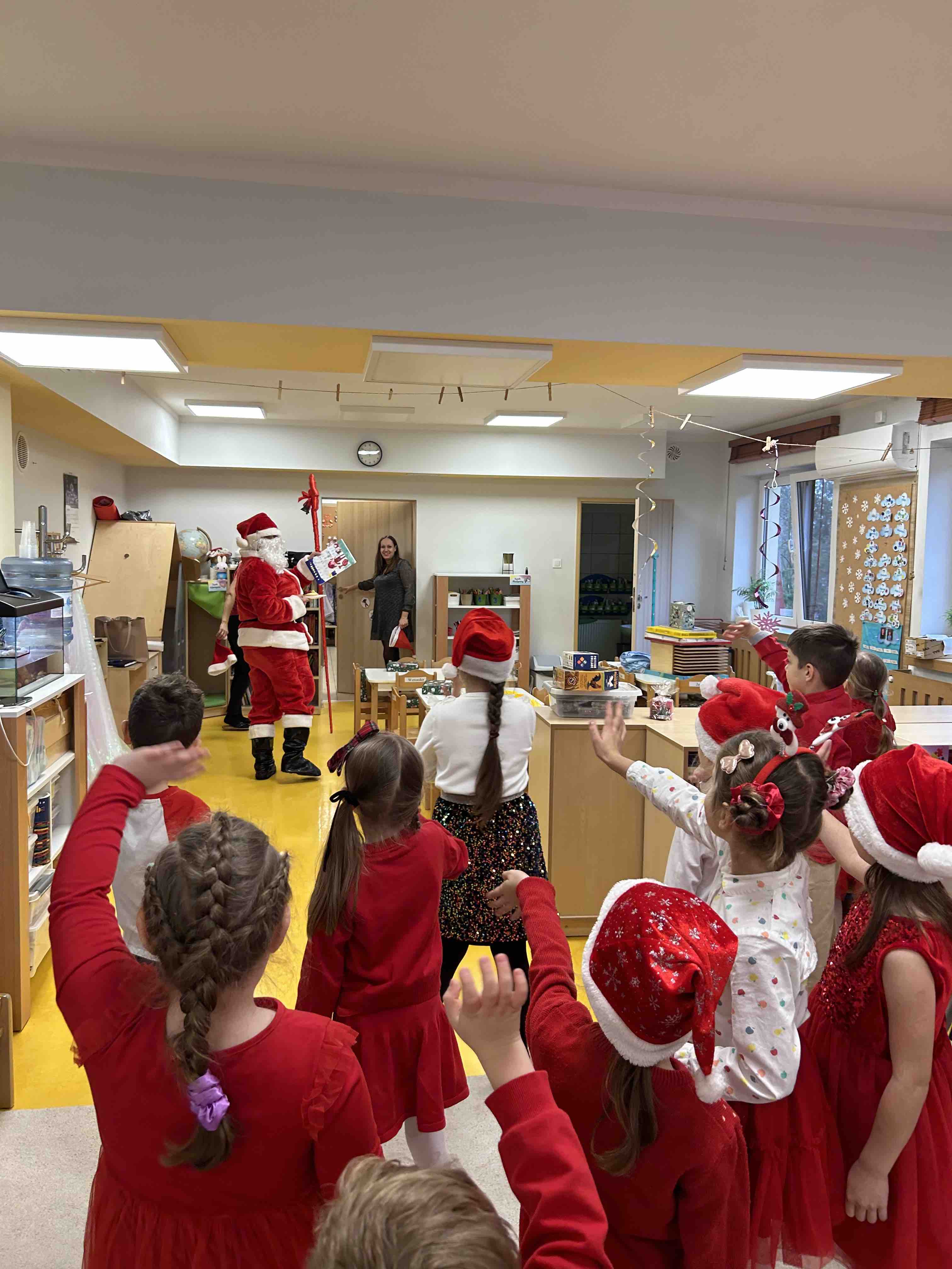 Zanim się zjawił dzieci z grupy chmurek przygotowały dla niego słodką niespodziankę oraz przyozdobiły salę. 6 latki zaprezentowały się śpiewając i tańcząc piosenkę pt. "Mikołaj kochany". Następnie wszystkie dzieci otrzymały prezenty. Niektóre przedszkolaki przygotowały dla Świętego Mikołaja piękne rysunki, które mu wręczyły.