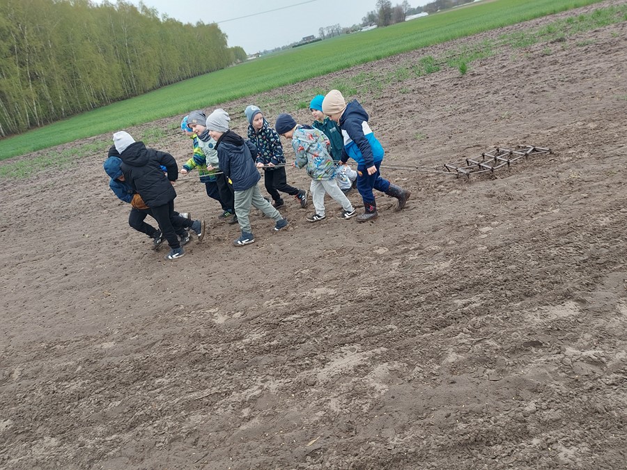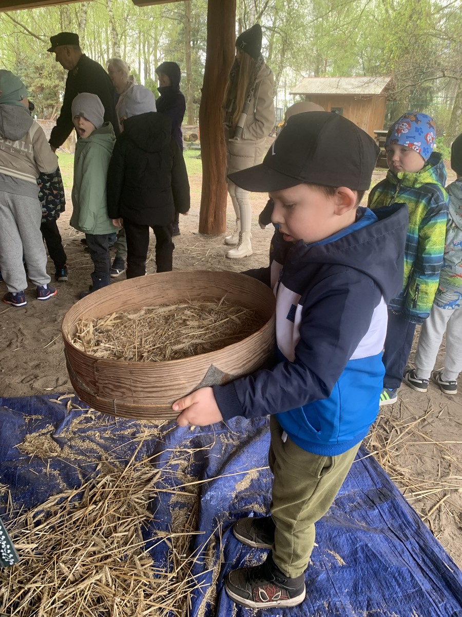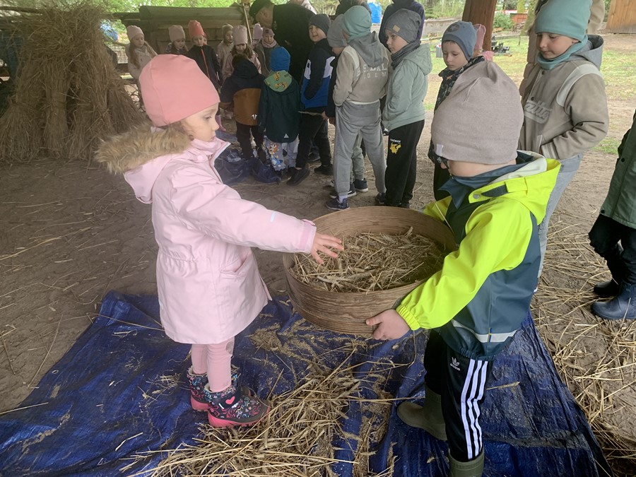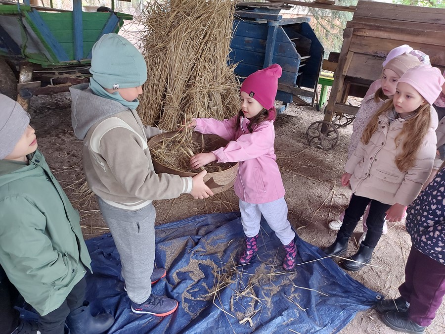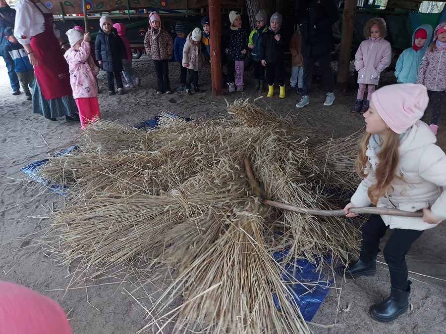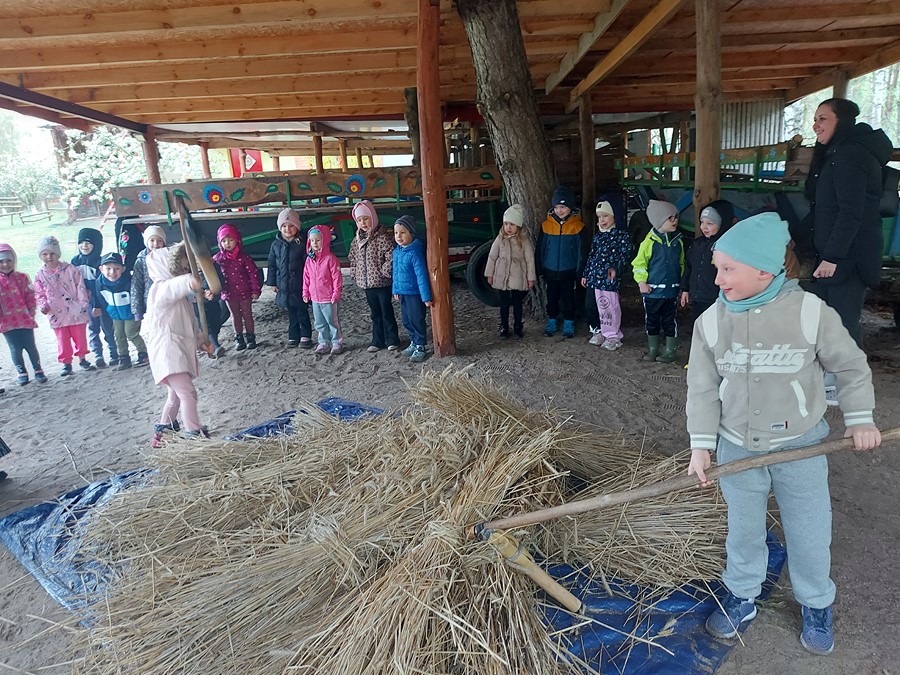 Podczas pobytu dzieci miały okazję poznać wszystkie etapy powstawania chleba oraz zobaczyć, jak wyglądało dawniej życie na wsi i codzienna praca w gospodarstwie. Z dużym zaangażowaniem brały udział w zajęciach praktycznych – bronowały, siały, młóciły zboże cepami oraz układały snopki. Mogły również obejrzeć maszyny rolnicze i dowiedzieć się, jak ciężka była niegdyś praca w polu.