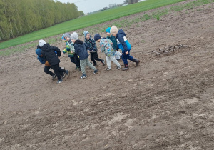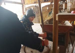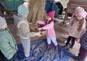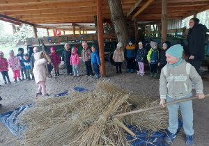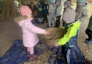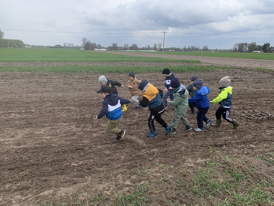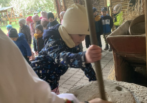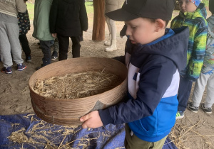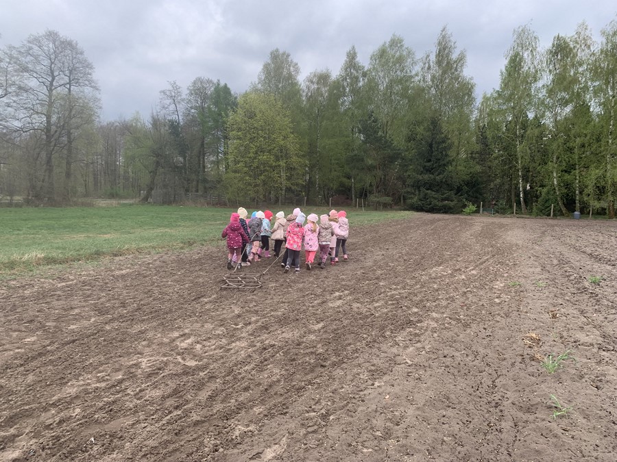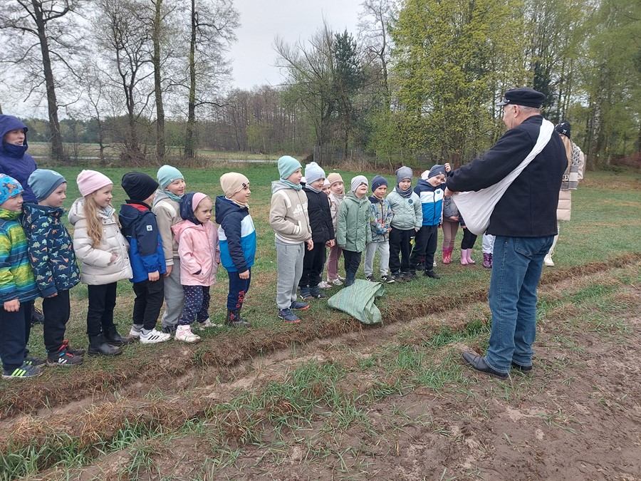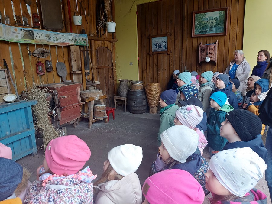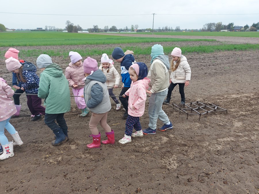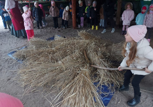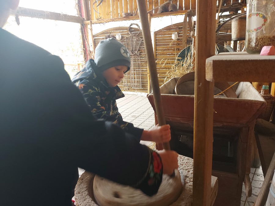 Podczas pobytu dzieci miały okazję poznać wszystkie etapy powstawania chleba oraz zobaczyć, jak wyglądało dawniej życie na wsi i codzienna praca w gospodarstwie. Z dużym zaangażowaniem brały udział w zajęciach praktycznych – bronowały, siały, młóciły zboże cepami oraz układały snopki. Mogły również obejrzeć maszyny rolnicze i dowiedzieć się, jak ciężka była niegdyś praca w polu.