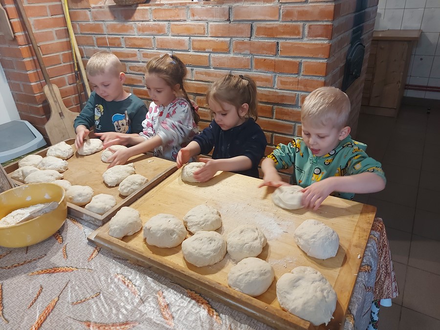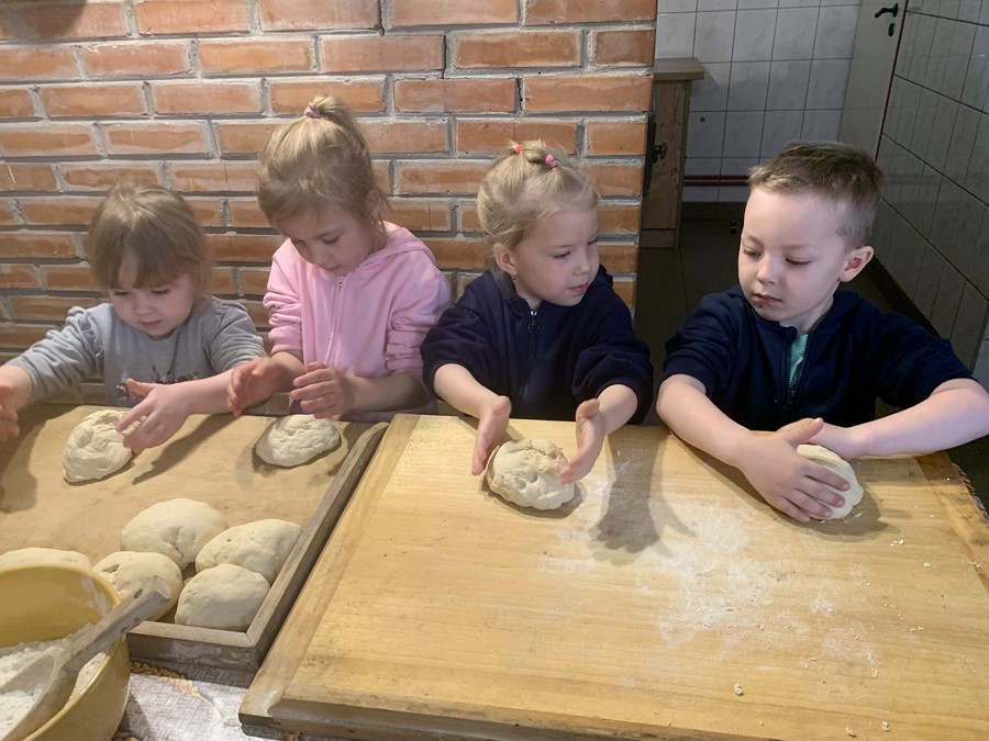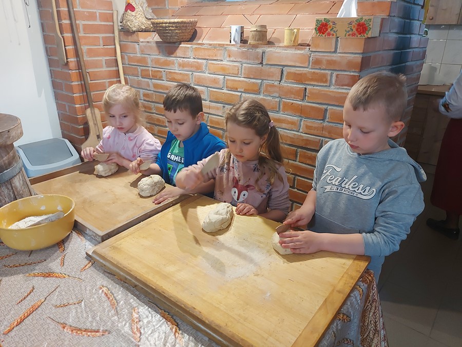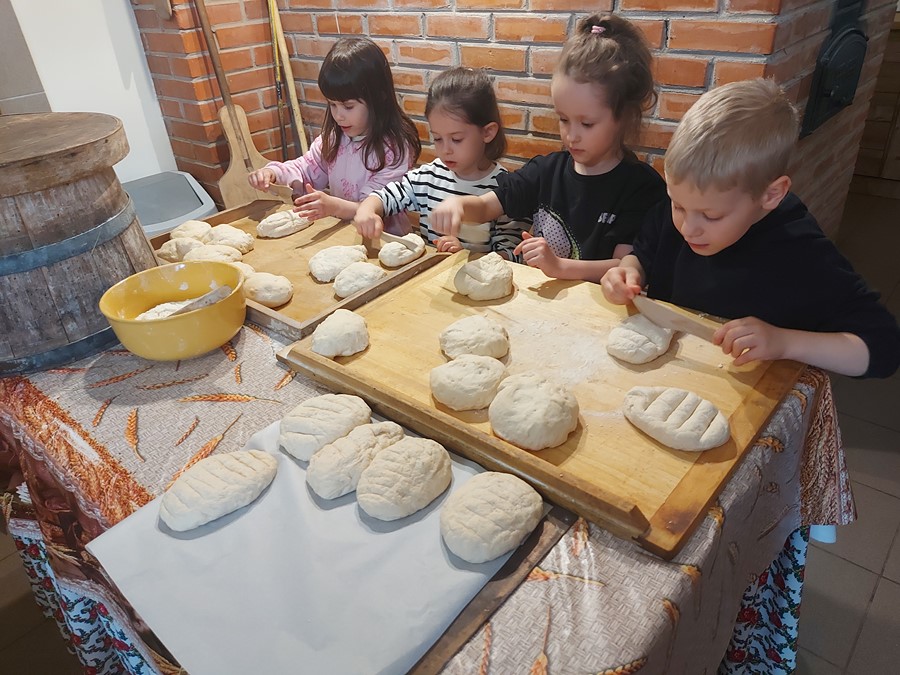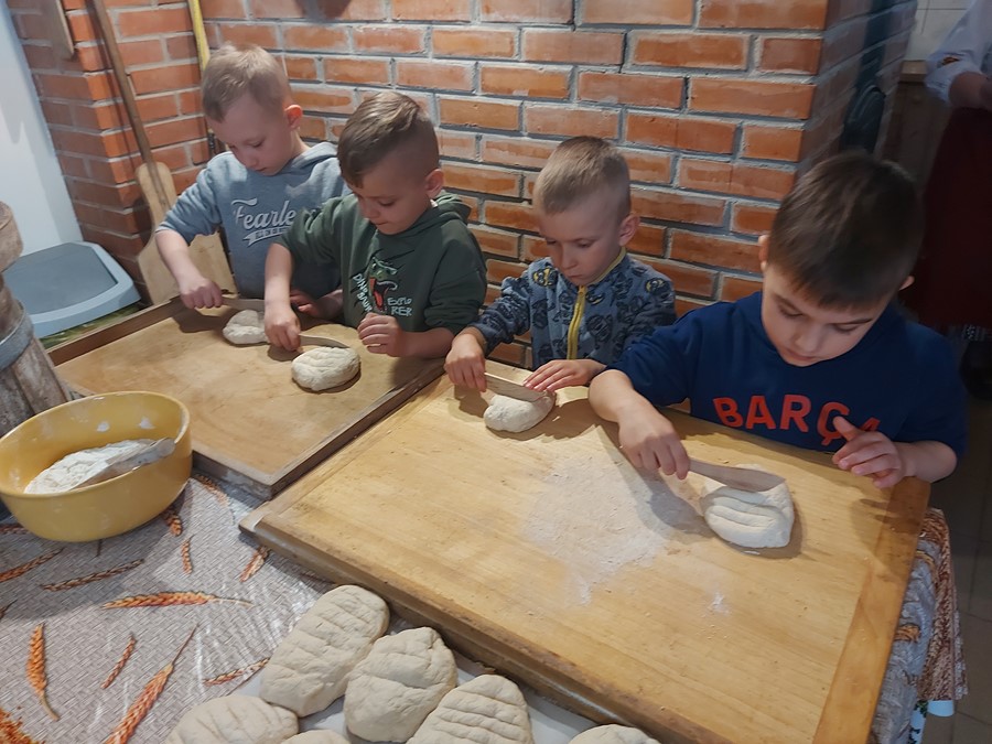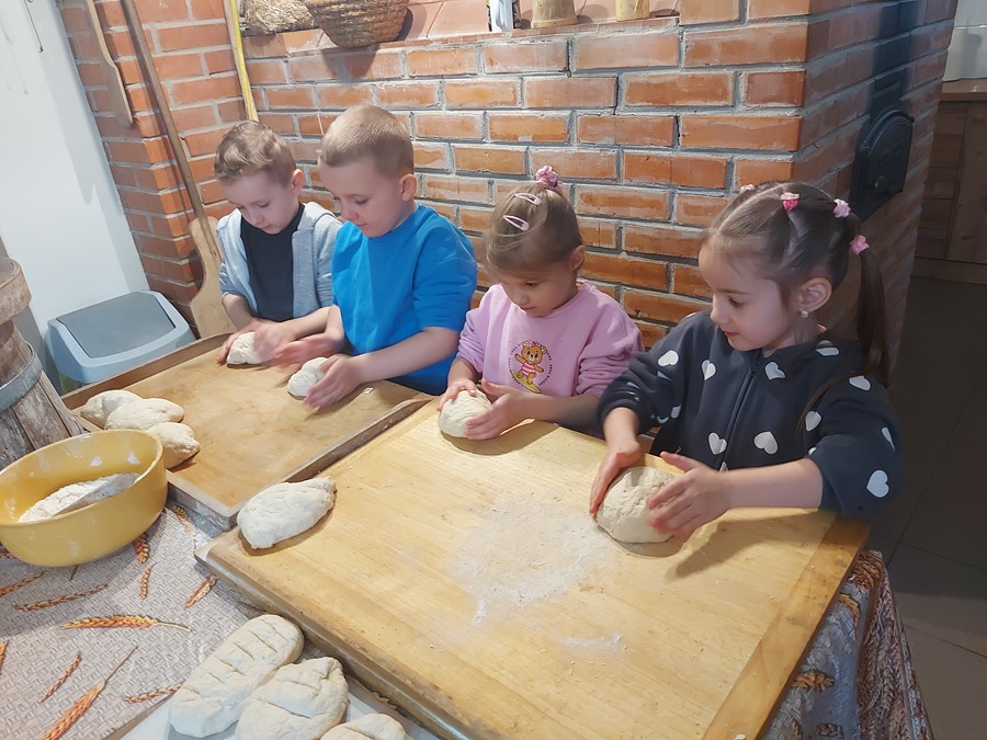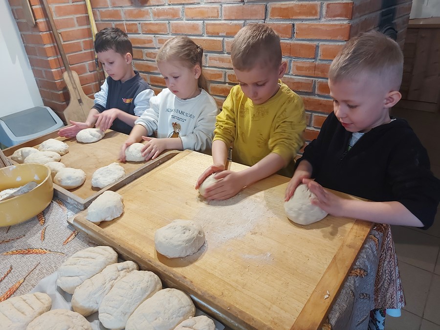 Jednym z najbardziej wyczekiwanych momentów wycieczki był własnoręczny wypiek chleba. Dzieci samodzielnie zagniatały ciasto i formowały bochenki, co sprawiło im wiele radości i satysfakcji.