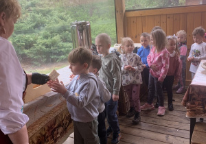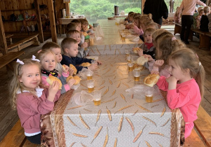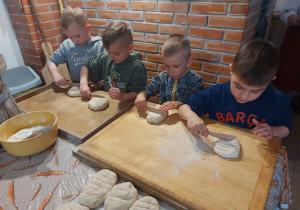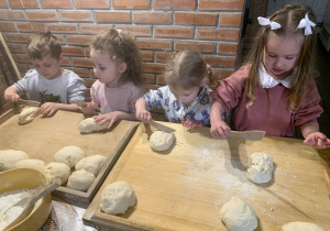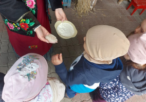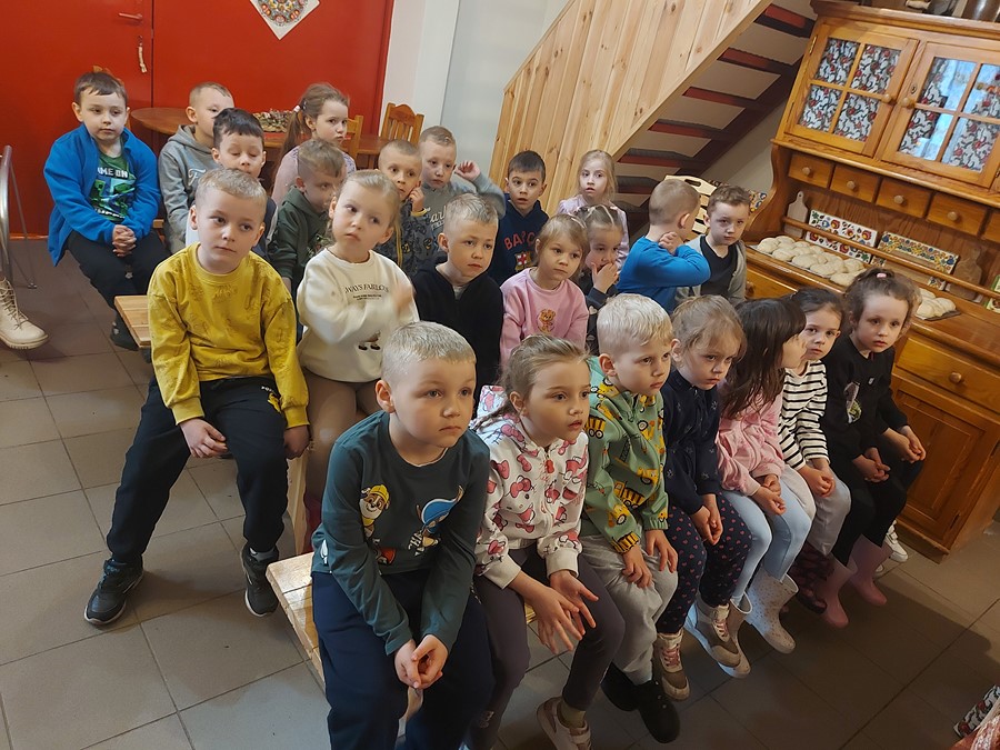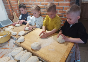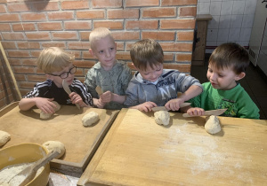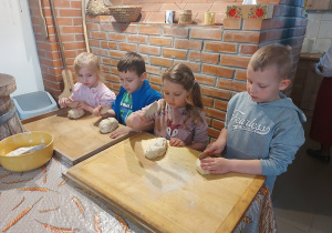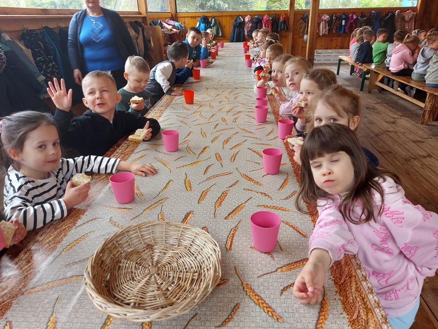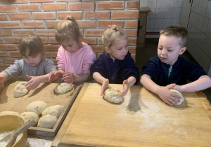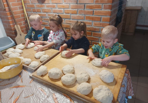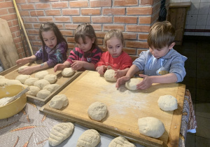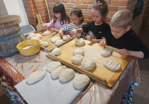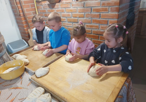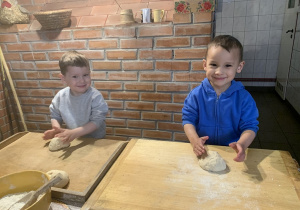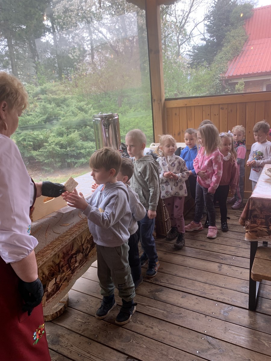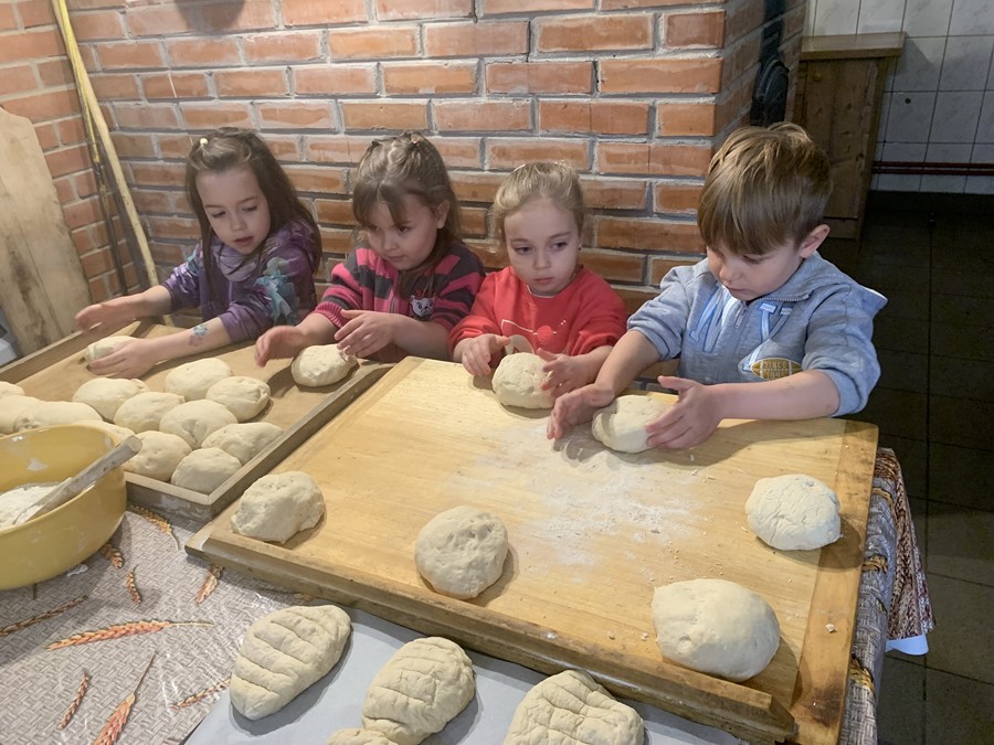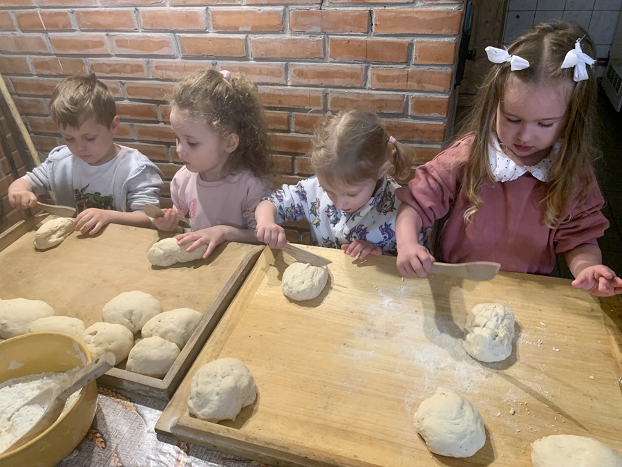 Jednym z najbardziej wyczekiwanych momentów wycieczki był własnoręczny wypiek chleba. Dzieci samodzielnie zagniatały ciasto i formowały bochenki, co sprawiło im wiele radości i satysfakcji.