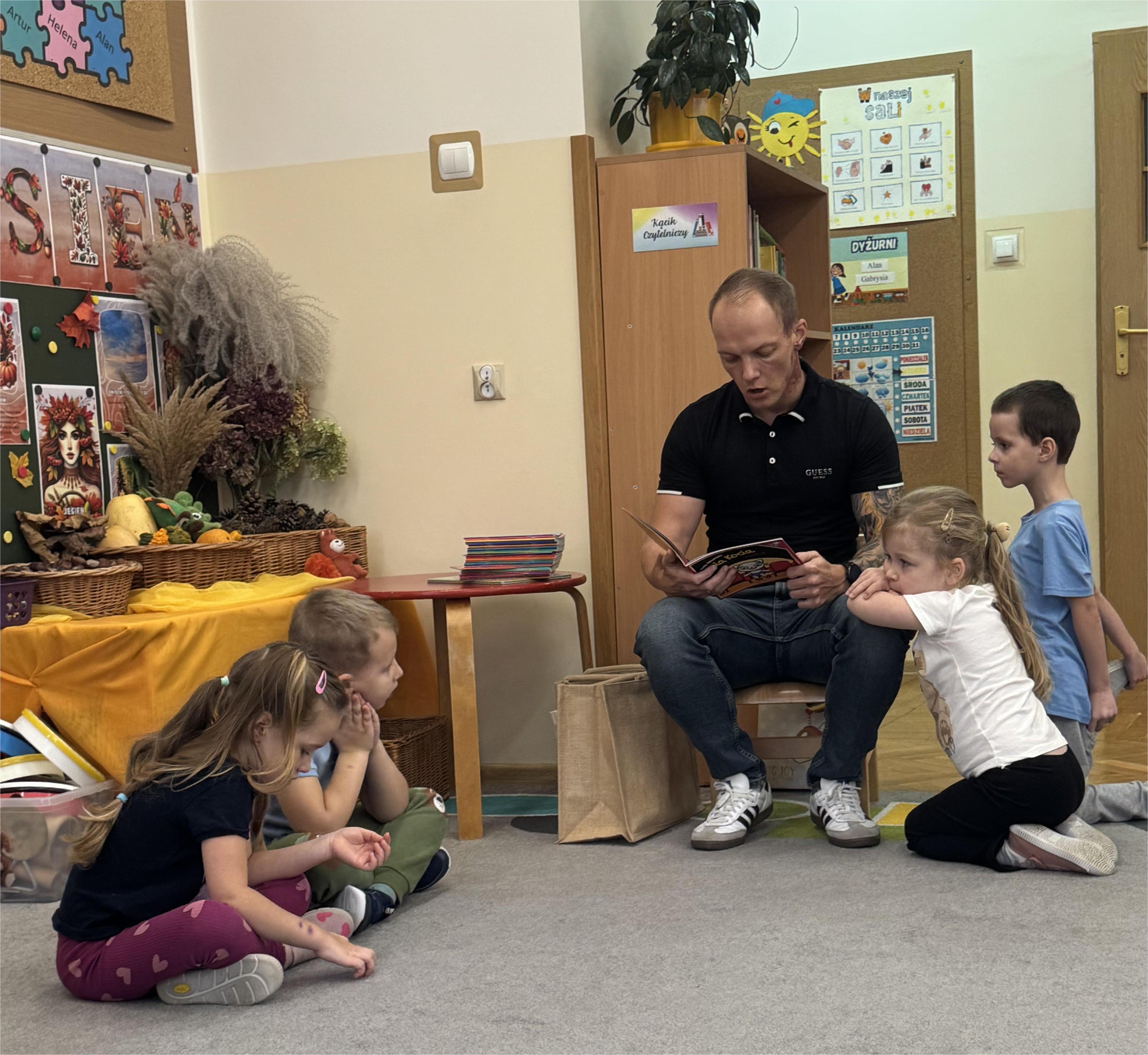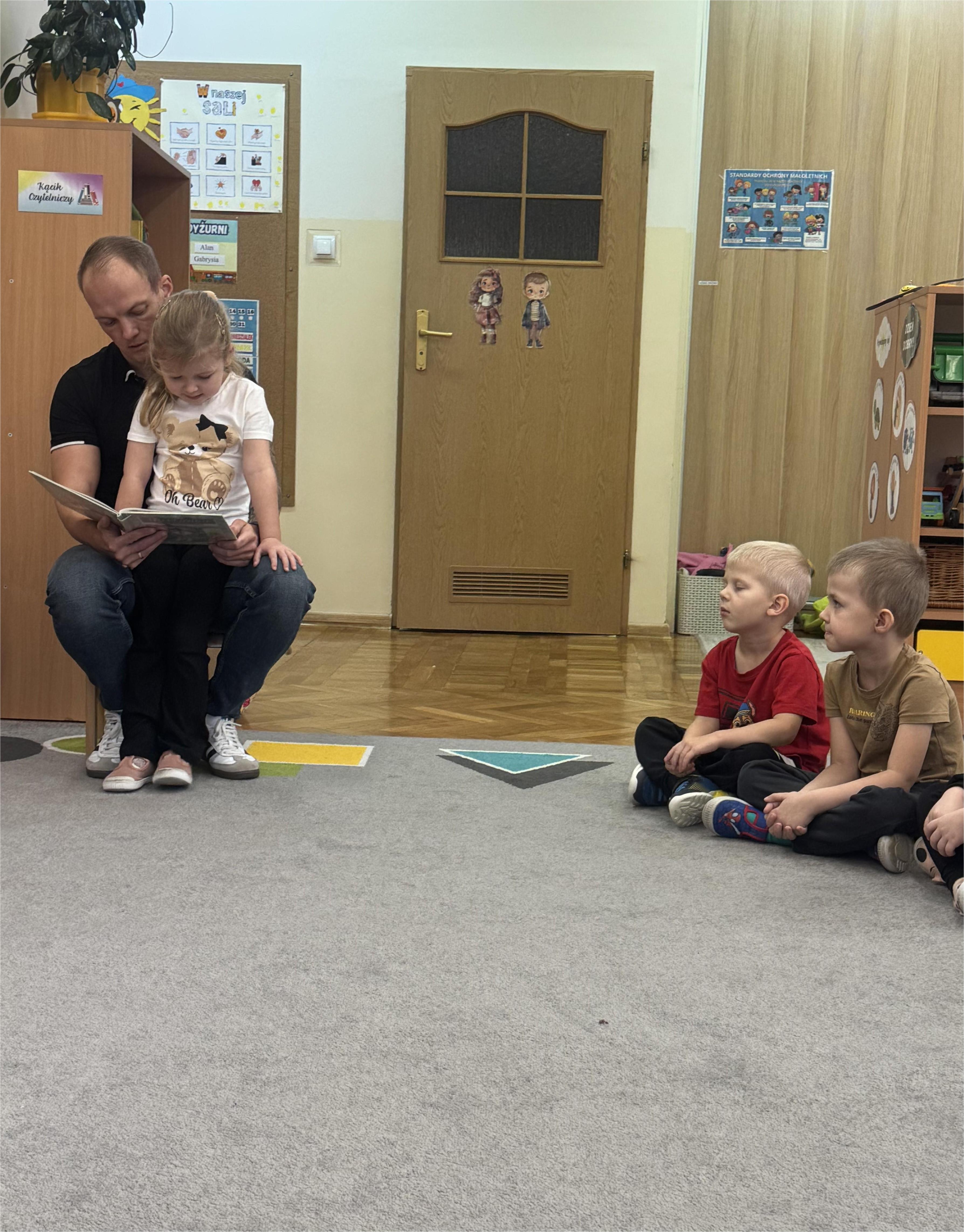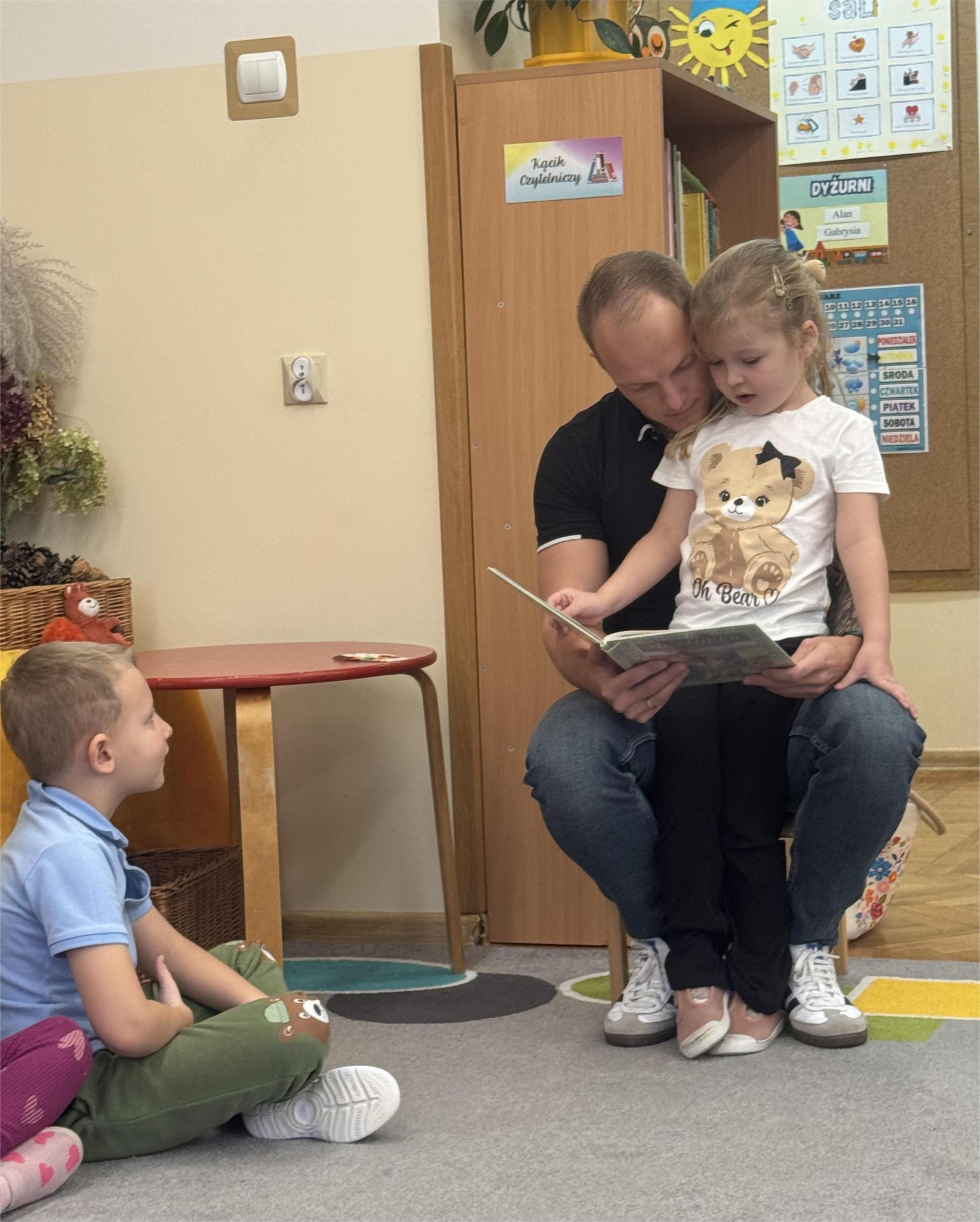 Jako pierwszy odwiedził nas tata Poli, który przeniósł dzieci w magiczny świat przygód bajkowych bohaterów Kociego domku Gabi. Jego pełna ciepła i zaangażowania interpretacja sprawiła, że przedszkolaki słuchały z ogromnym zainteresowaniem. Dzieci chętnie dzieliły się swoimi spostrzeżeniami, opowiadały o własnych książkach i zadawały pytania dotyczące wysłuchanej historii.