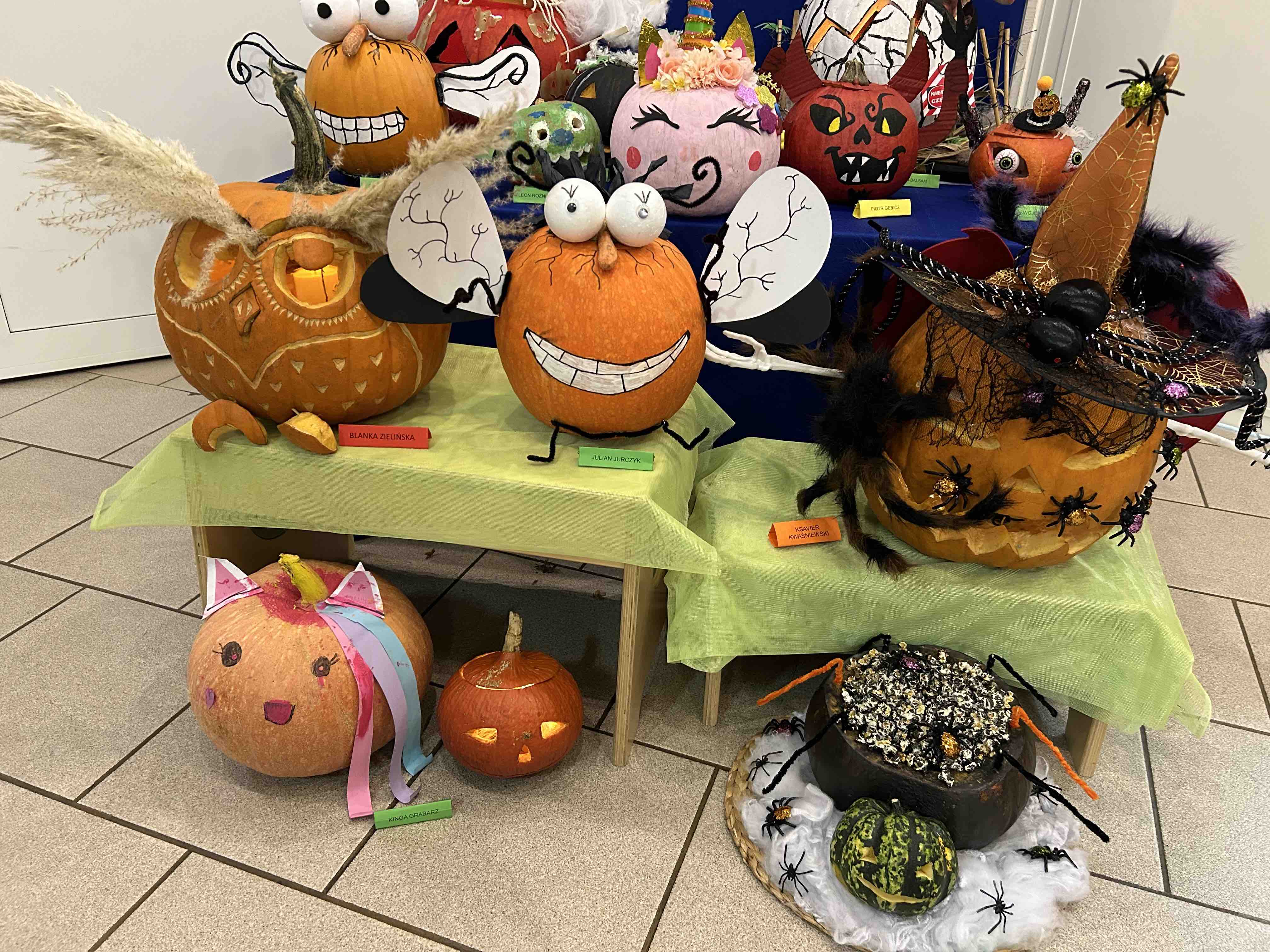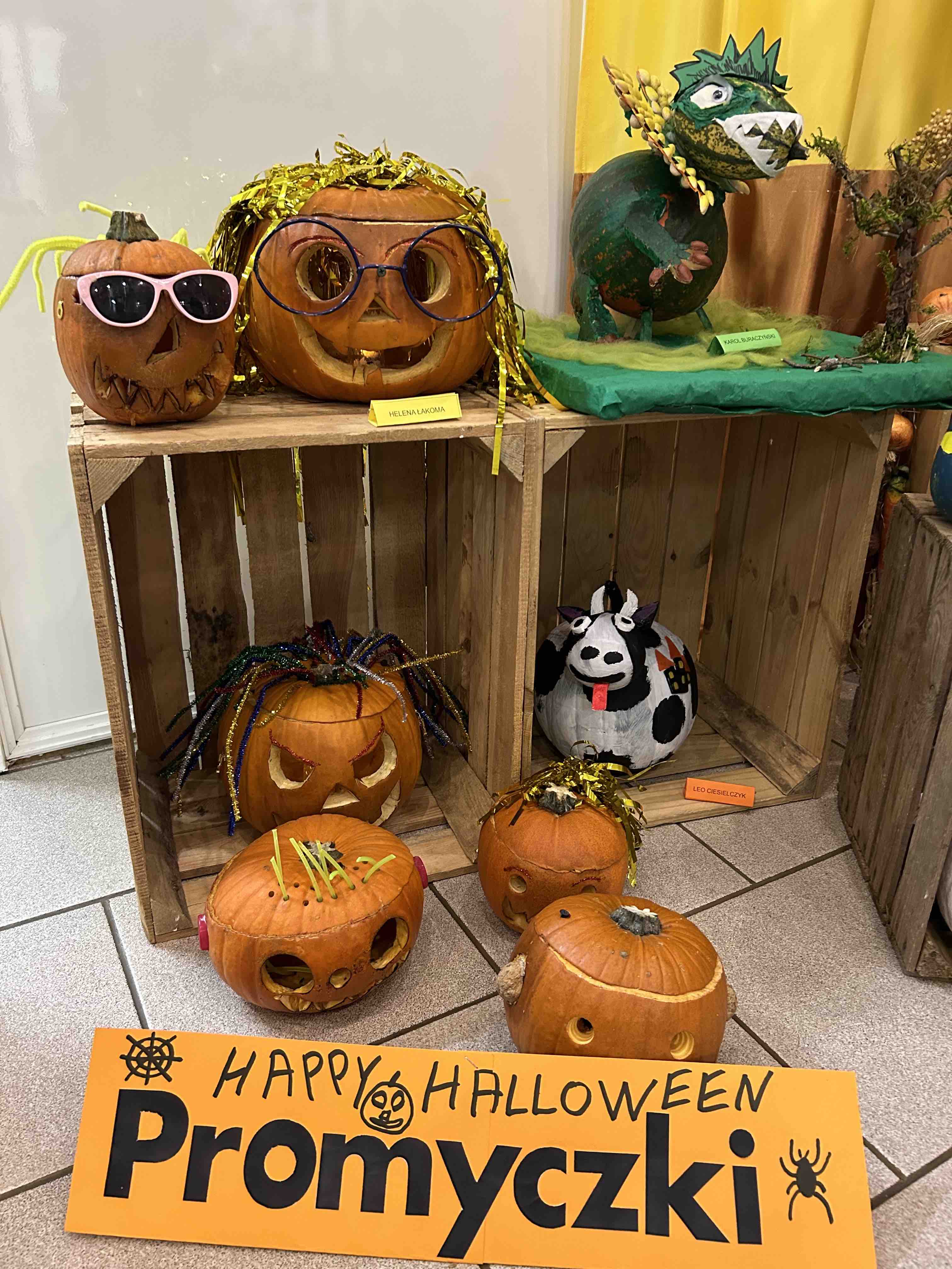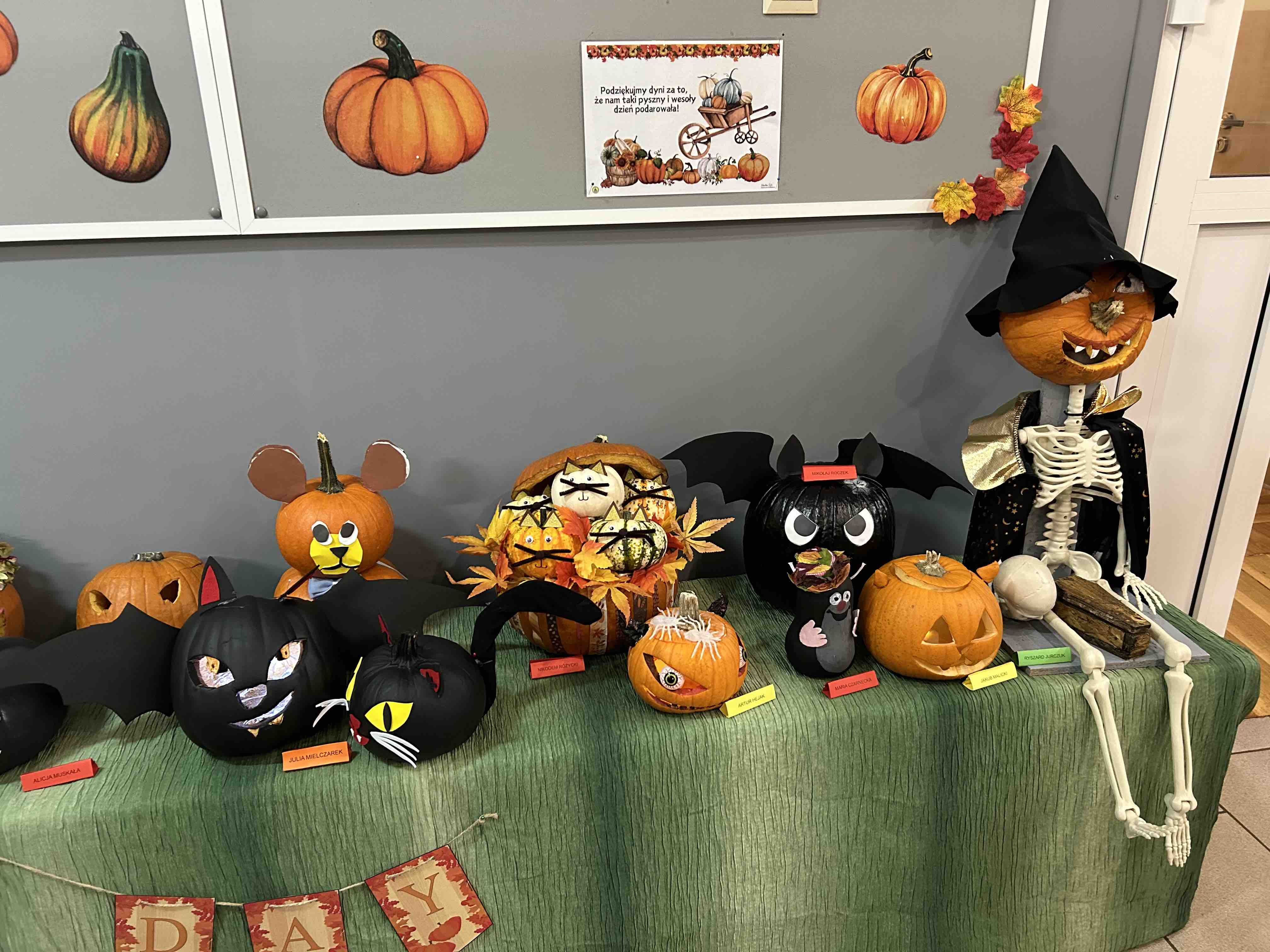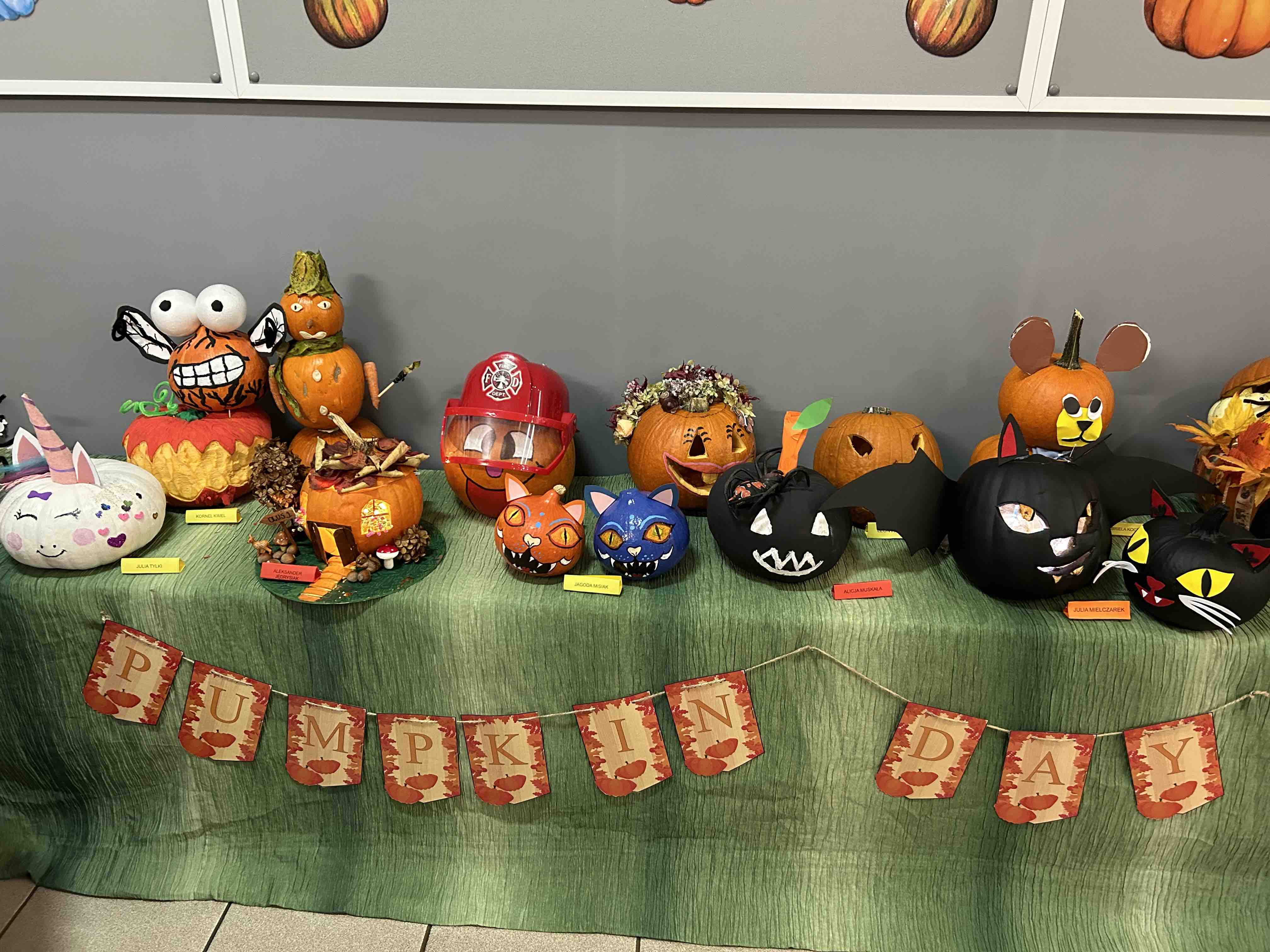 W ostatnim tygodniu października na przedszkolnym korytarzu pojawiły się niezwykłe dynie - to bohaterowie wystawy konkursowej ,,Dyniowe stwory poprawiają humory”. Każda dynia, mała czy duża, zmieniła się w wyjątkowego stwora o niepowtarzalnym wyglądzie. Wśród nich można było zobaczyć uśmiechnięte potworki, zabawne zwierzaki tj. dinozaury czy lwy. Niektóre stwory miały kapelusze, czapki, okulary lub szyszki, liście.