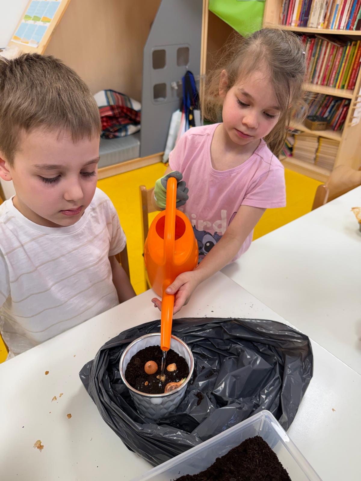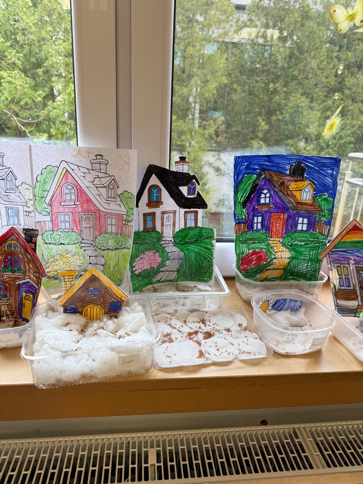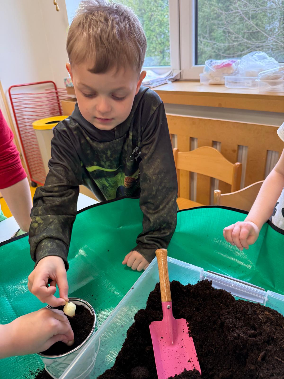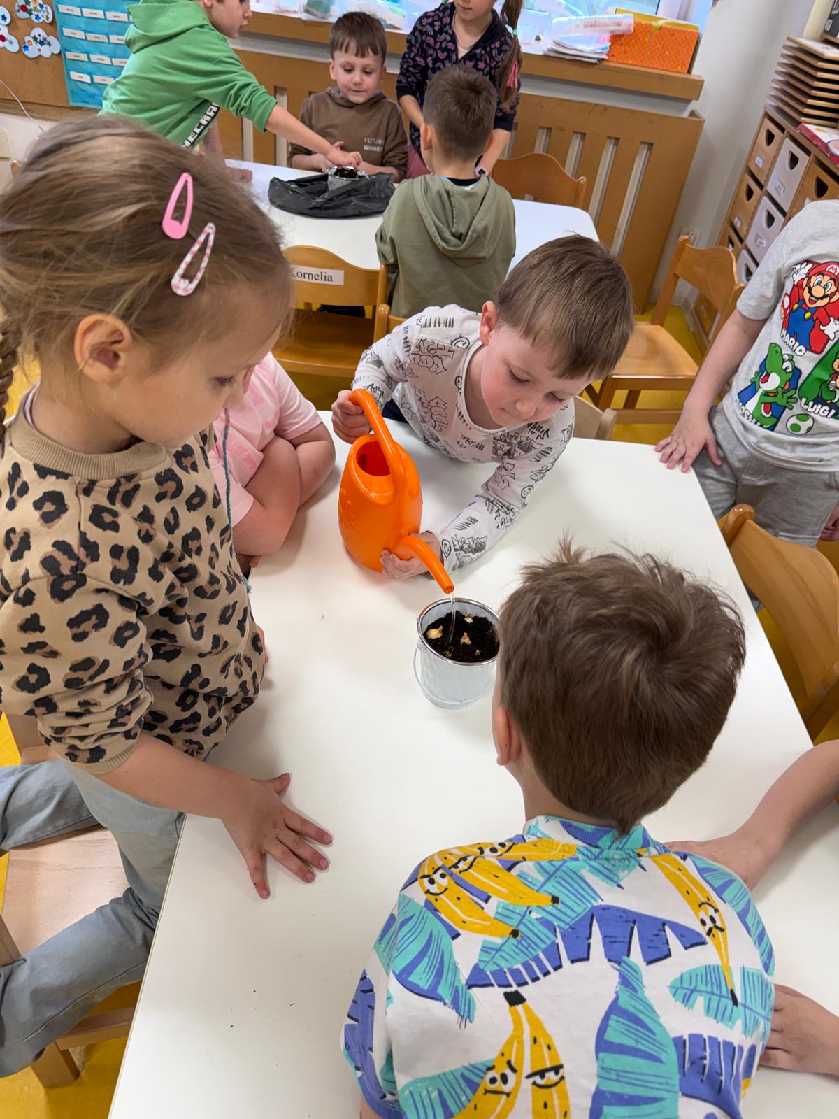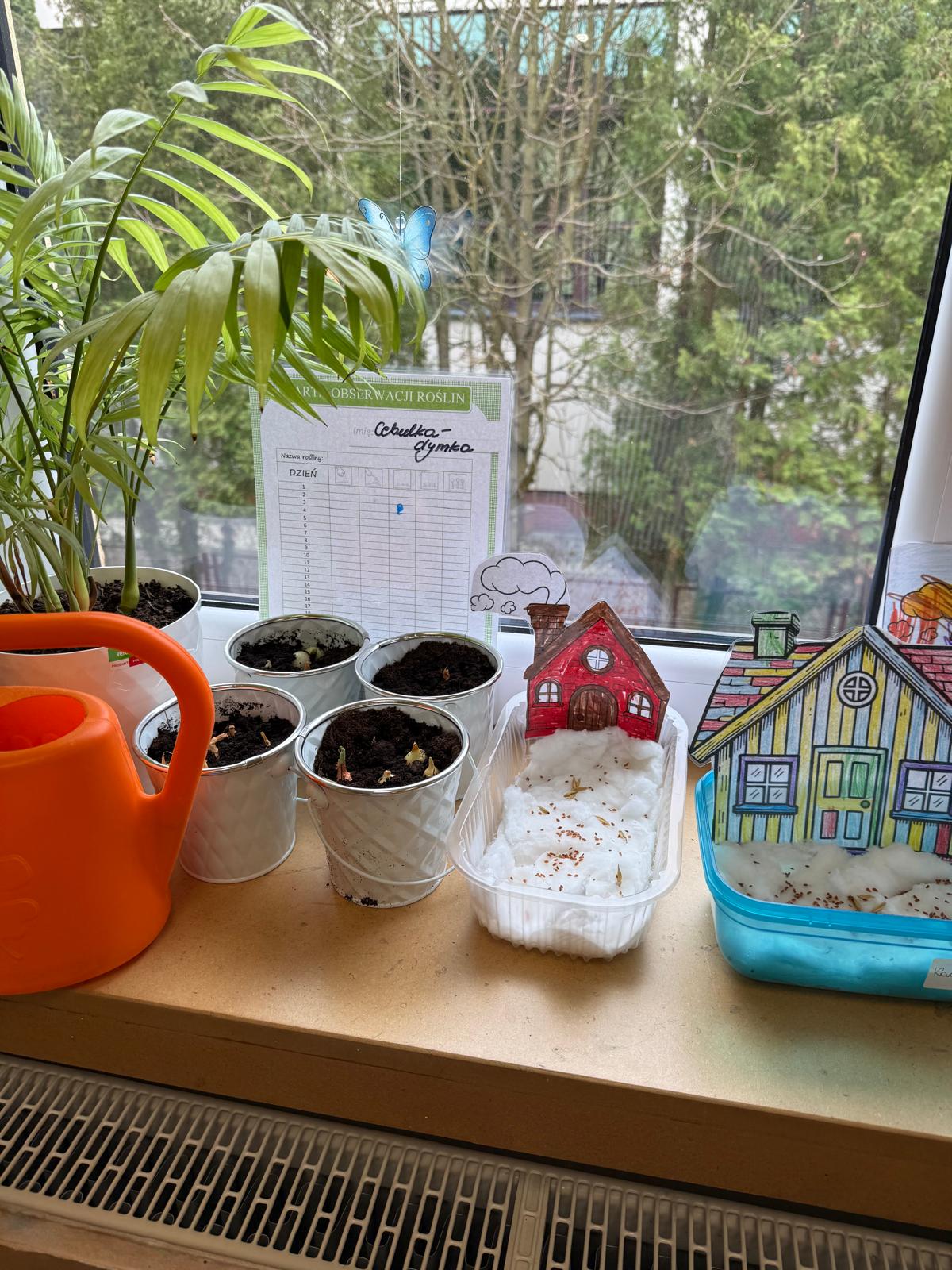 Następnie dzieci przystąpiły do pracy. Podzieleni na grupy wsypali ziemię do doniczek i wsadzili małe cebulki oraz starannie je podlali. Następnym etapem było założenie własnych trawników (rzeżuchy i owsa) przed przygotowanymi przez dzieci domkami.