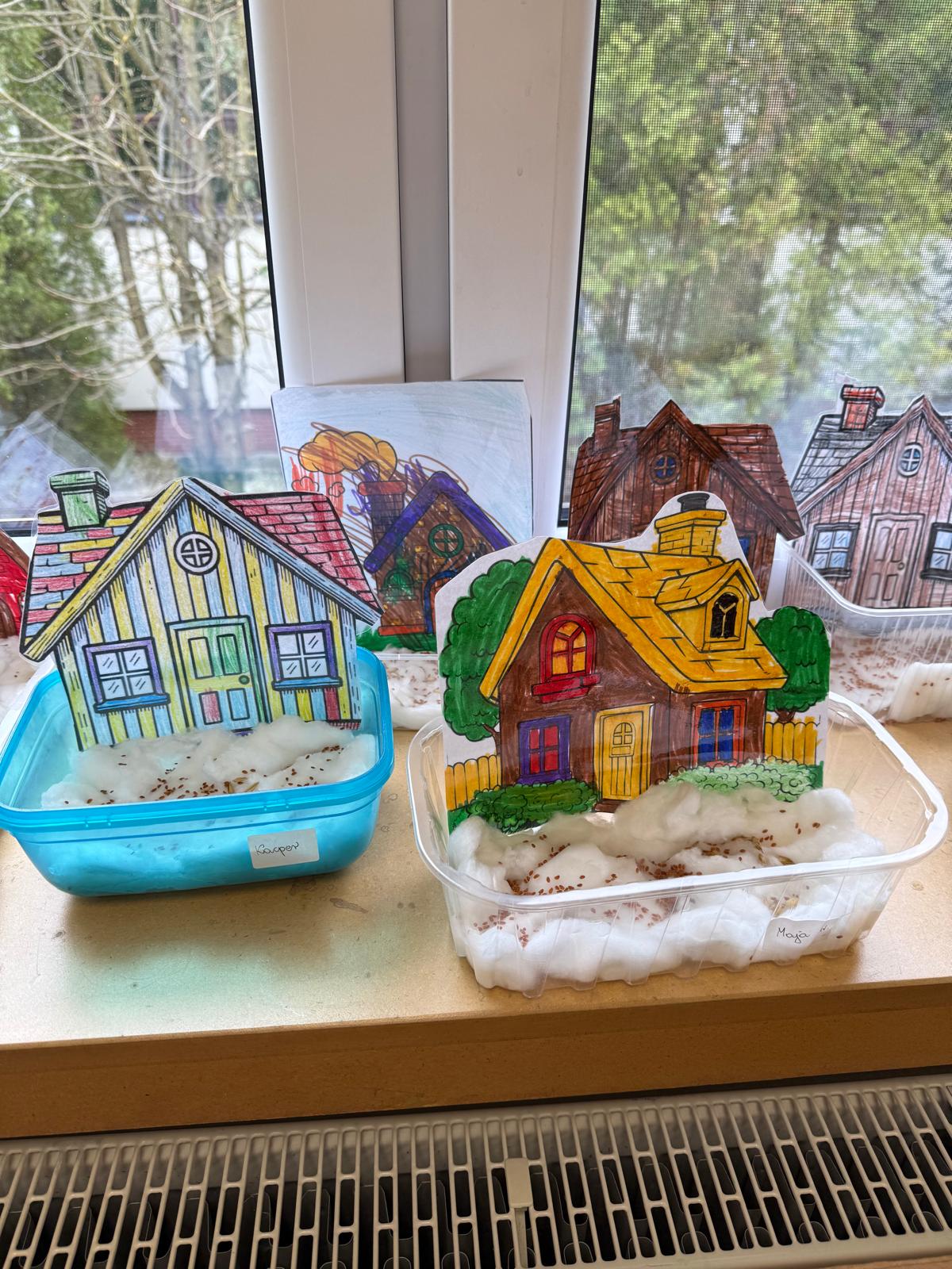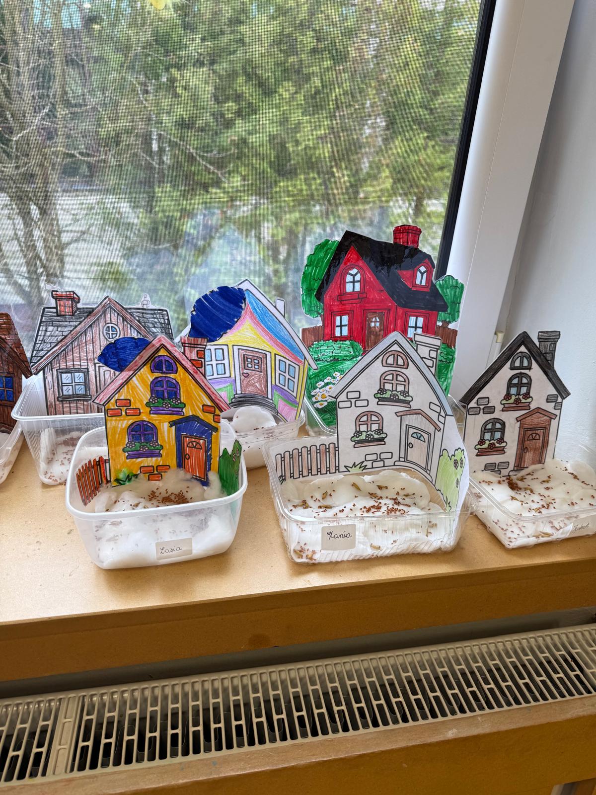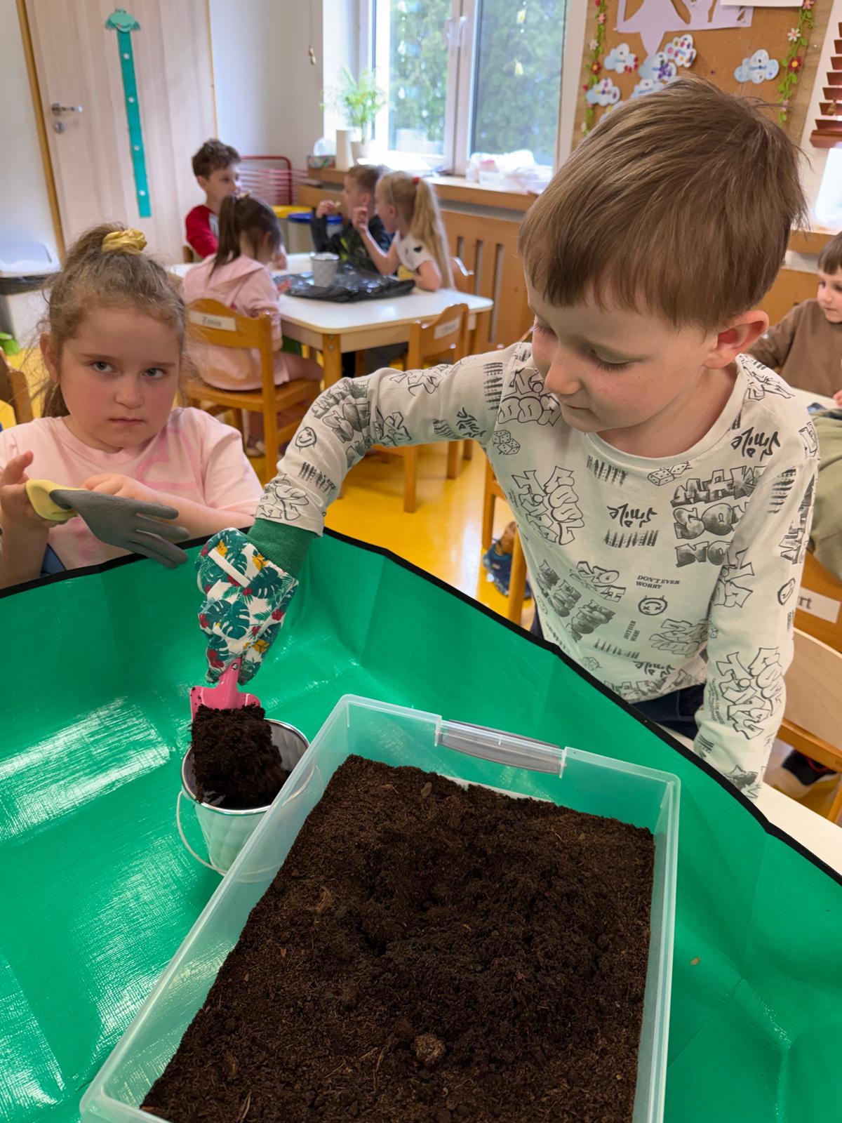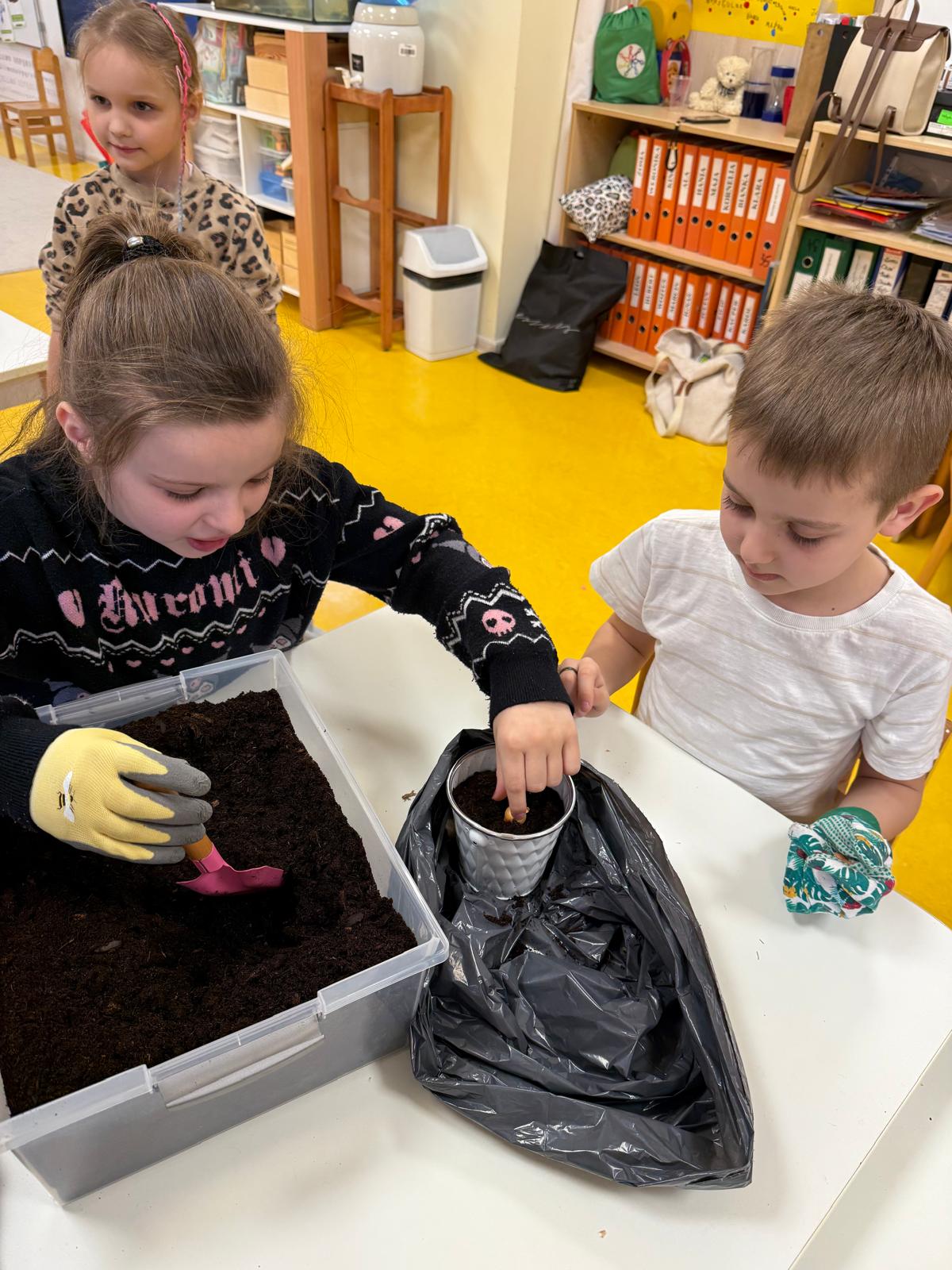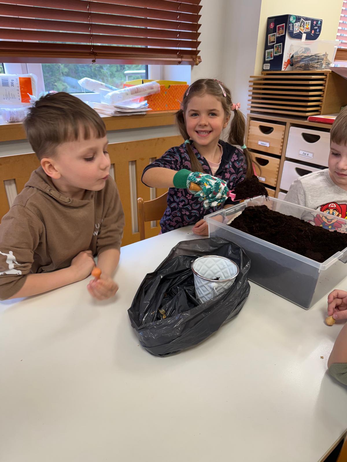 Następnie dzieci przystąpiły do pracy. Podzieleni na grupy wsypali ziemię do doniczek i wsadzili małe cebulki oraz starannie je podlali. Następnym etapem było założenie własnych trawników (rzeżuchy i owsa) przed przygotowanymi przez dzieci domkami.