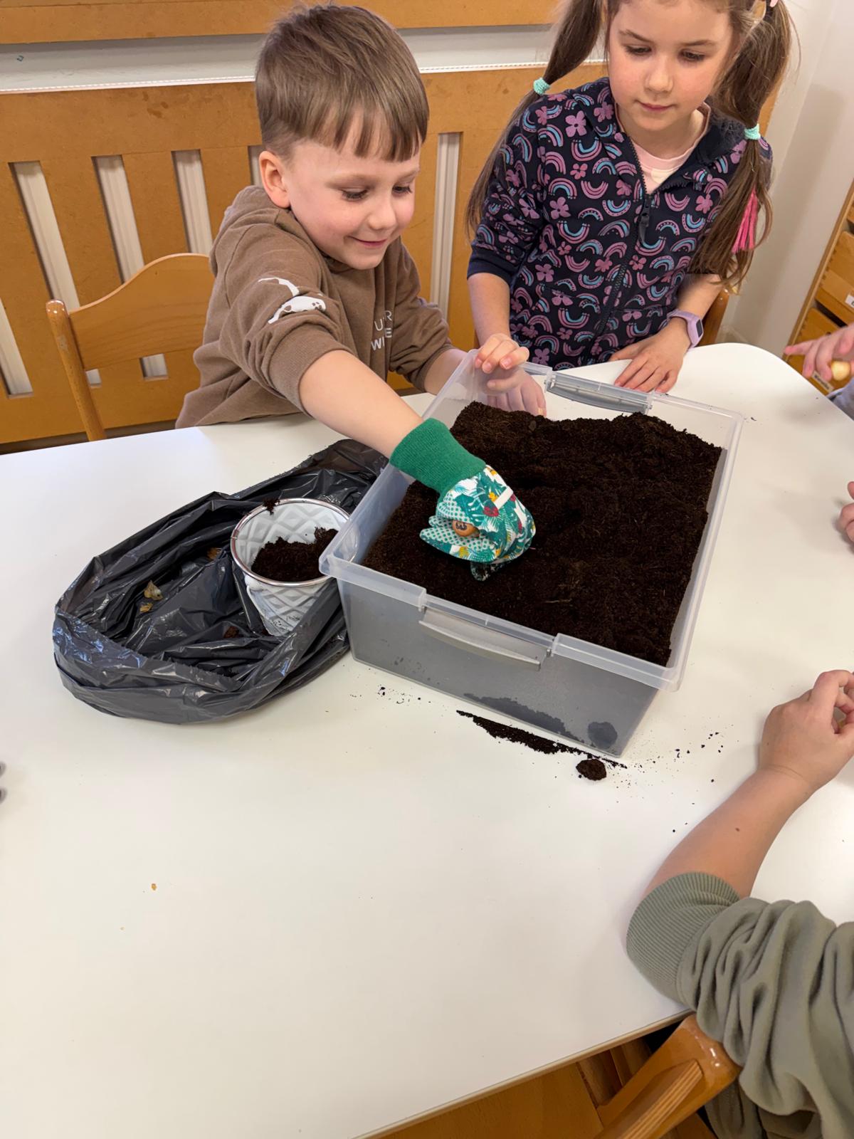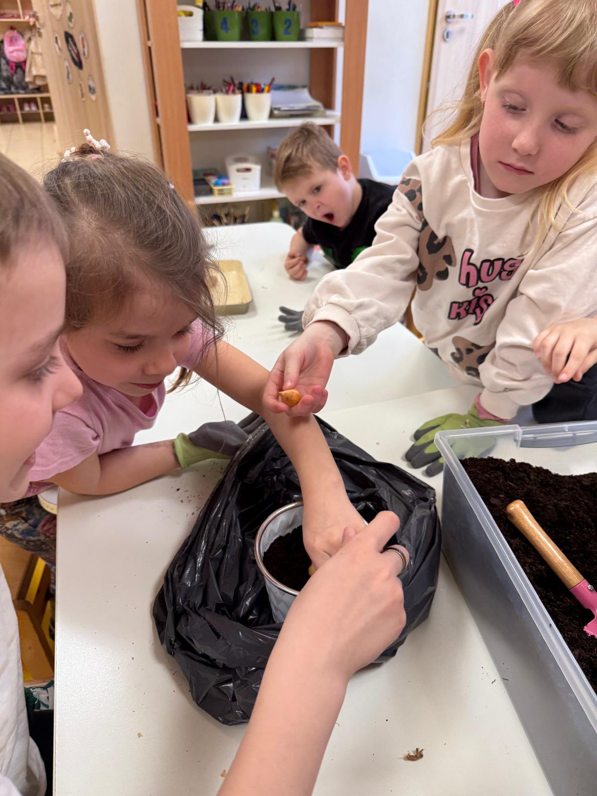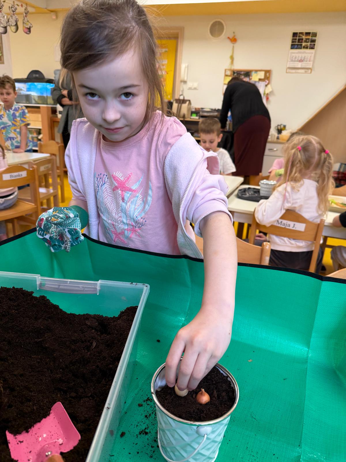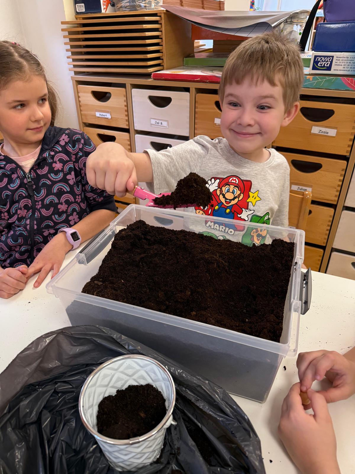 Następnie dzieci przystąpiły do pracy. Podzieleni na grupy wsypali ziemię do doniczek i wsadzili małe cebulki oraz starannie je podlali. Następnym etapem było założenie własnych trawników (rzeżuchy i owsa) przed przygotowanymi przez dzieci domkami.