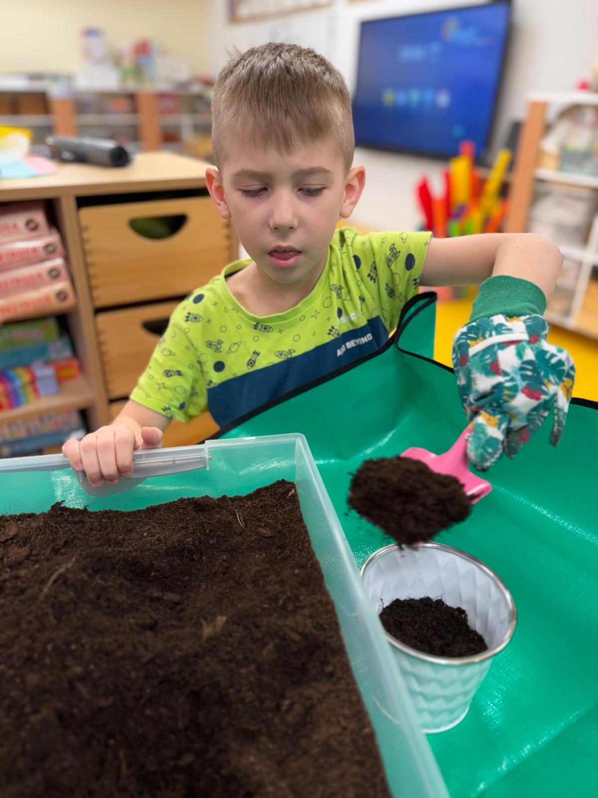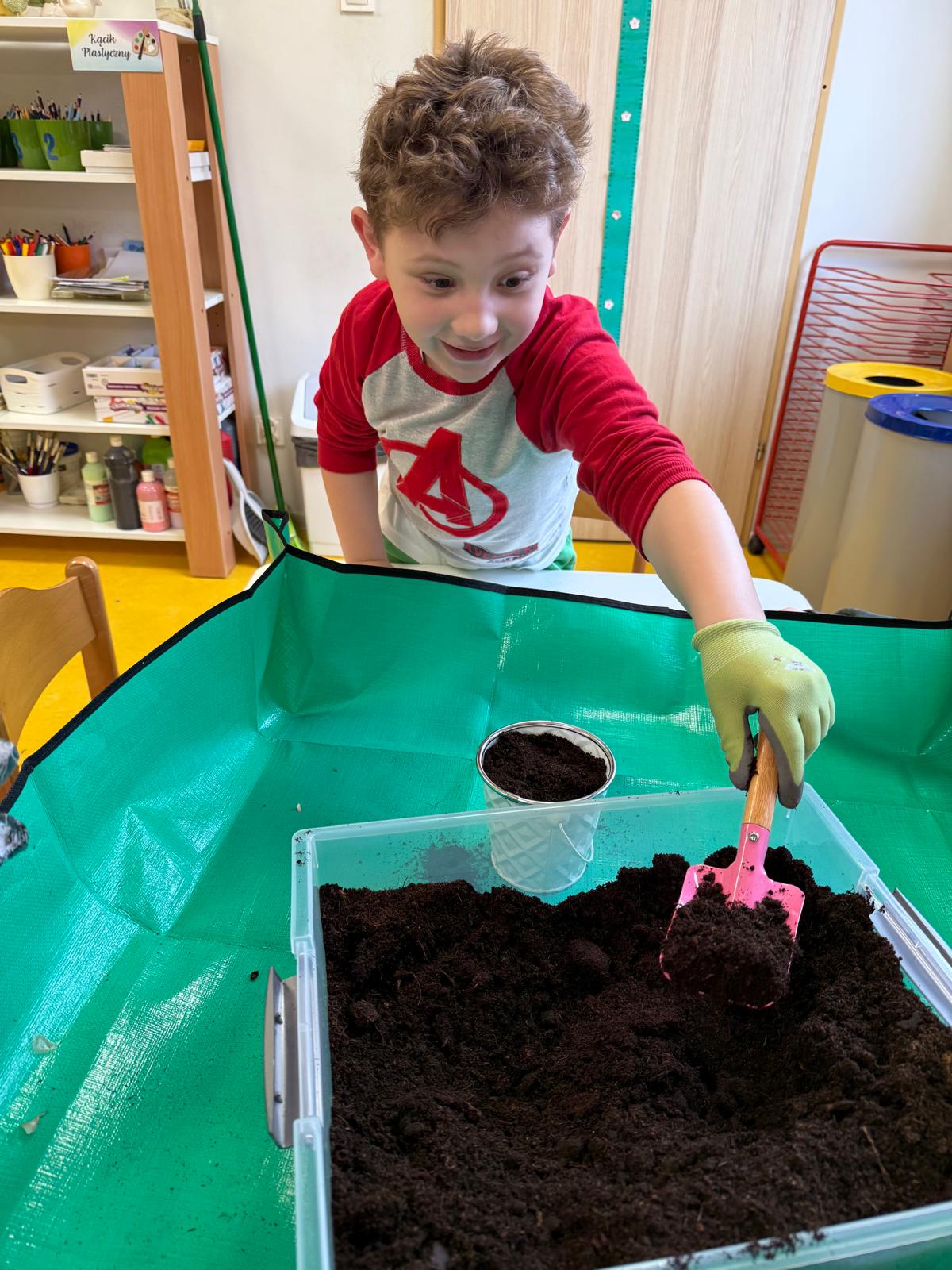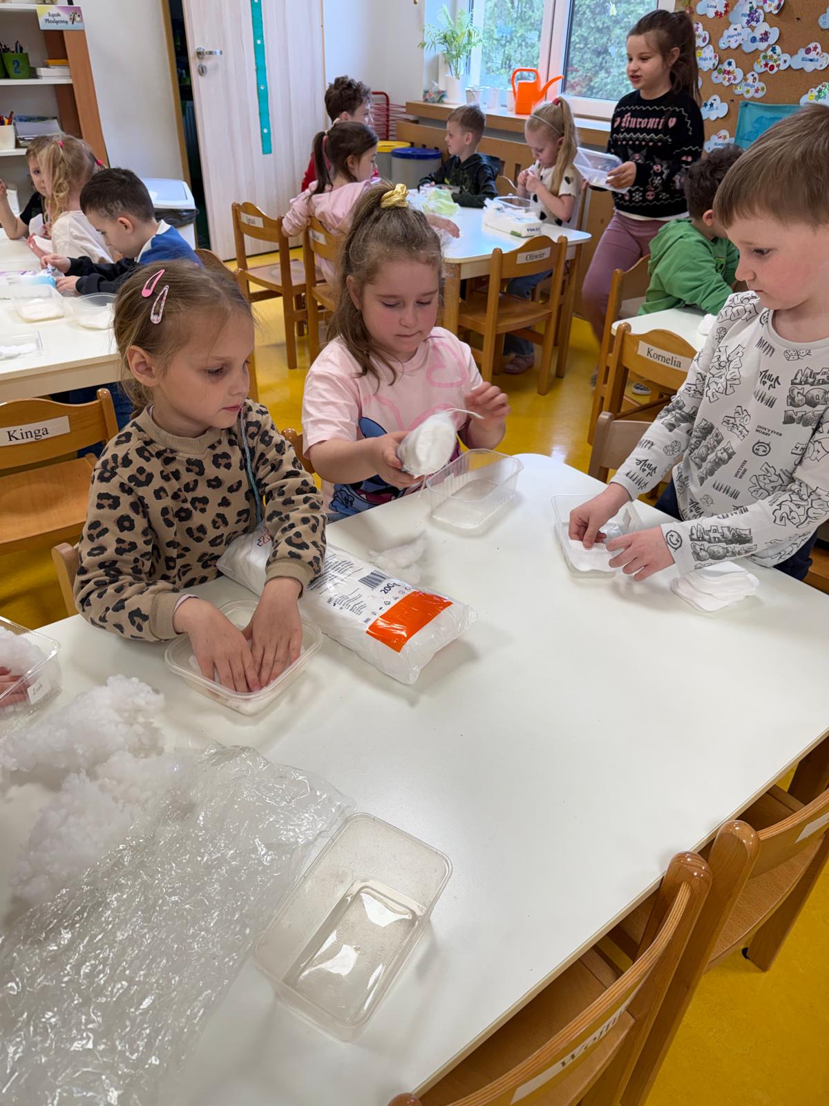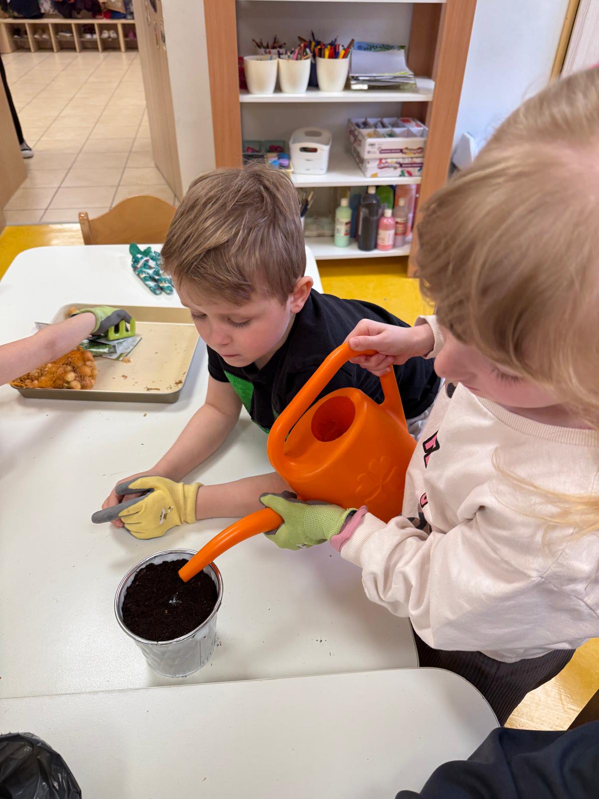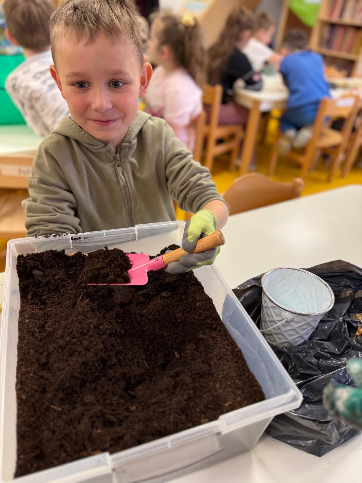 Następnie dzieci przystąpiły do pracy. Podzieleni na grupy wsypali ziemię do doniczek i wsadzili małe cebulki oraz starannie je podlali. Następnym etapem było założenie własnych trawników (rzeżuchy i owsa) przed przygotowanymi przez dzieci domkami.