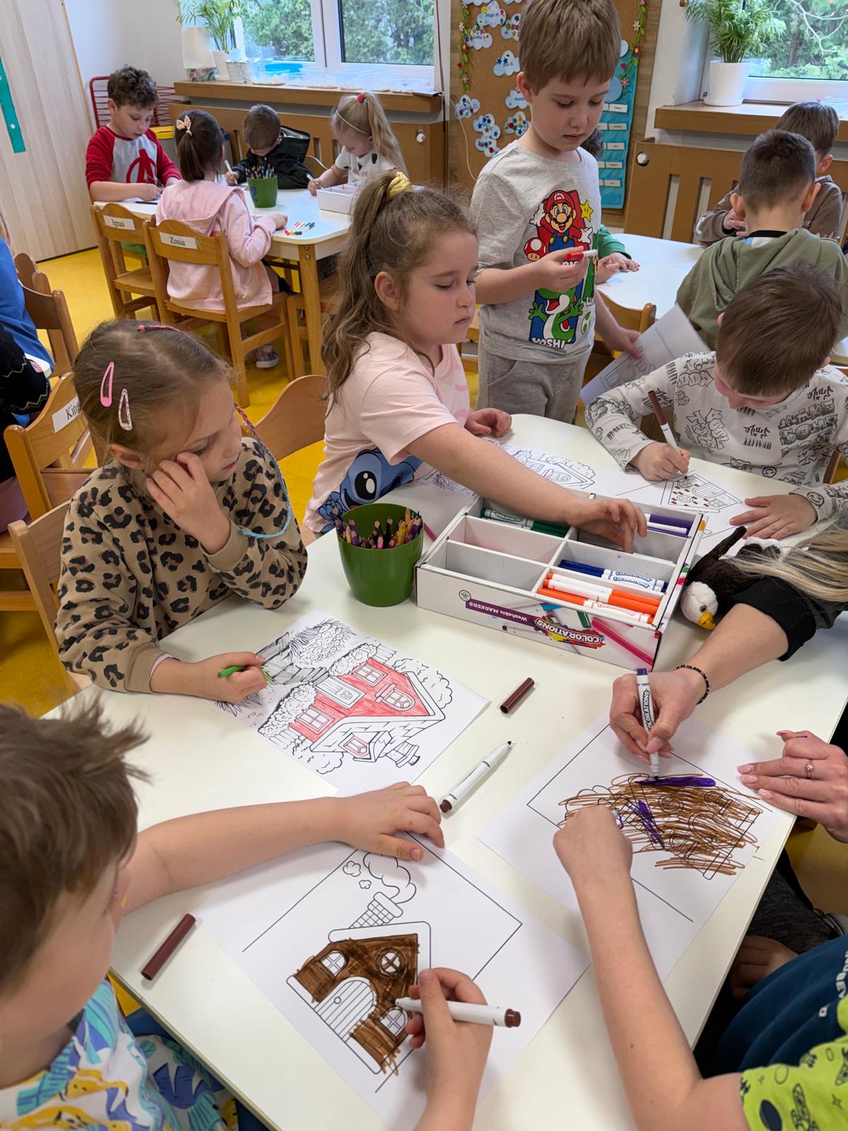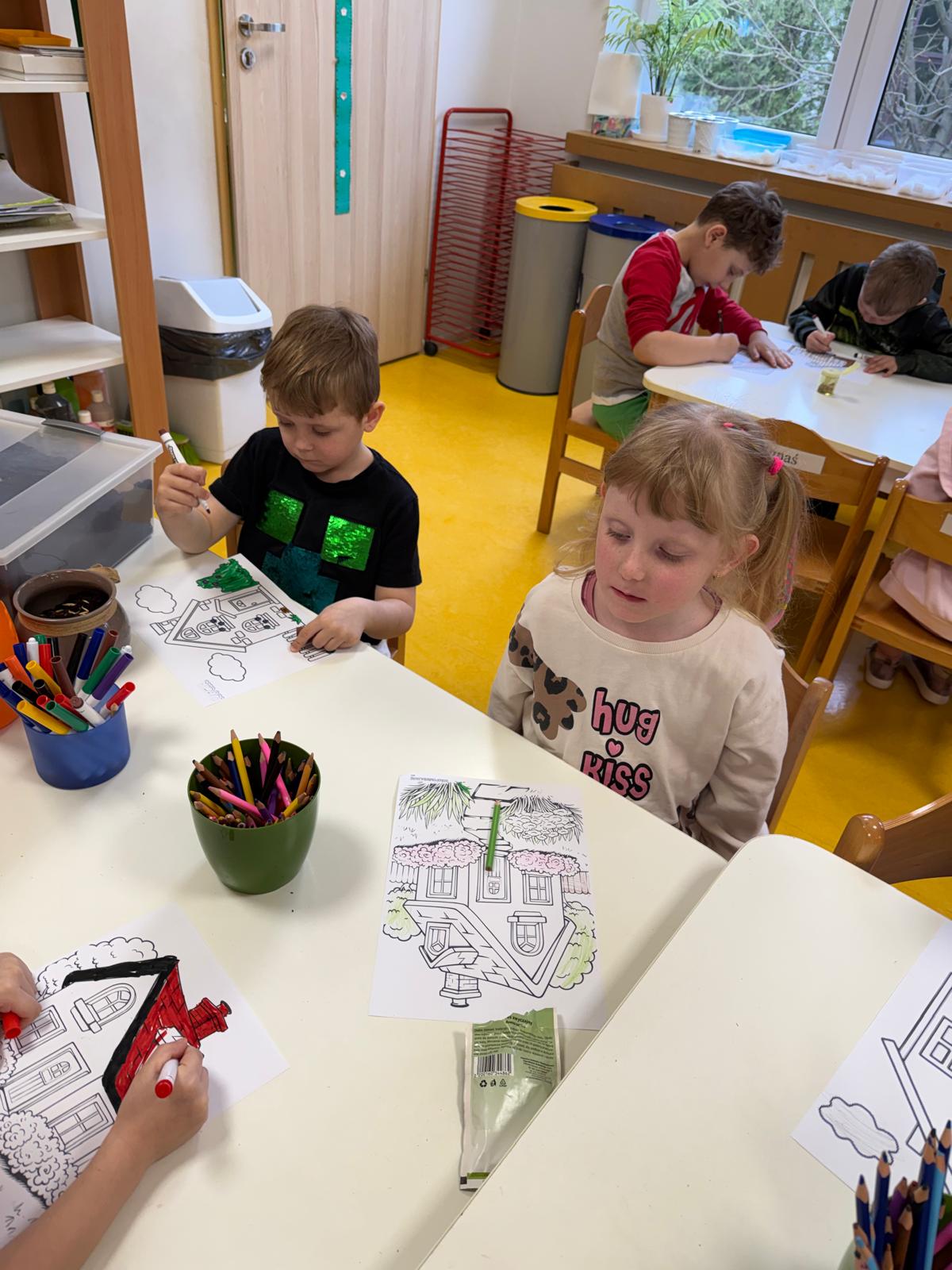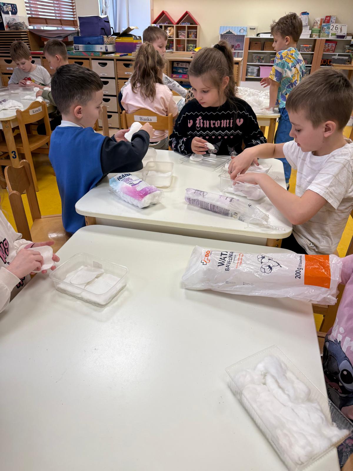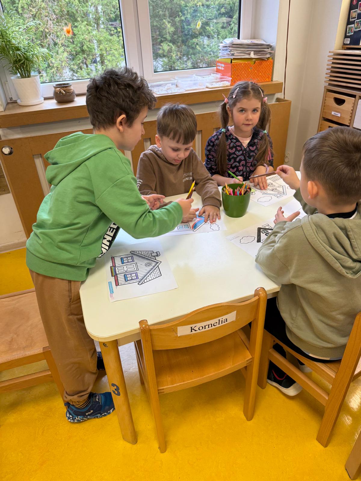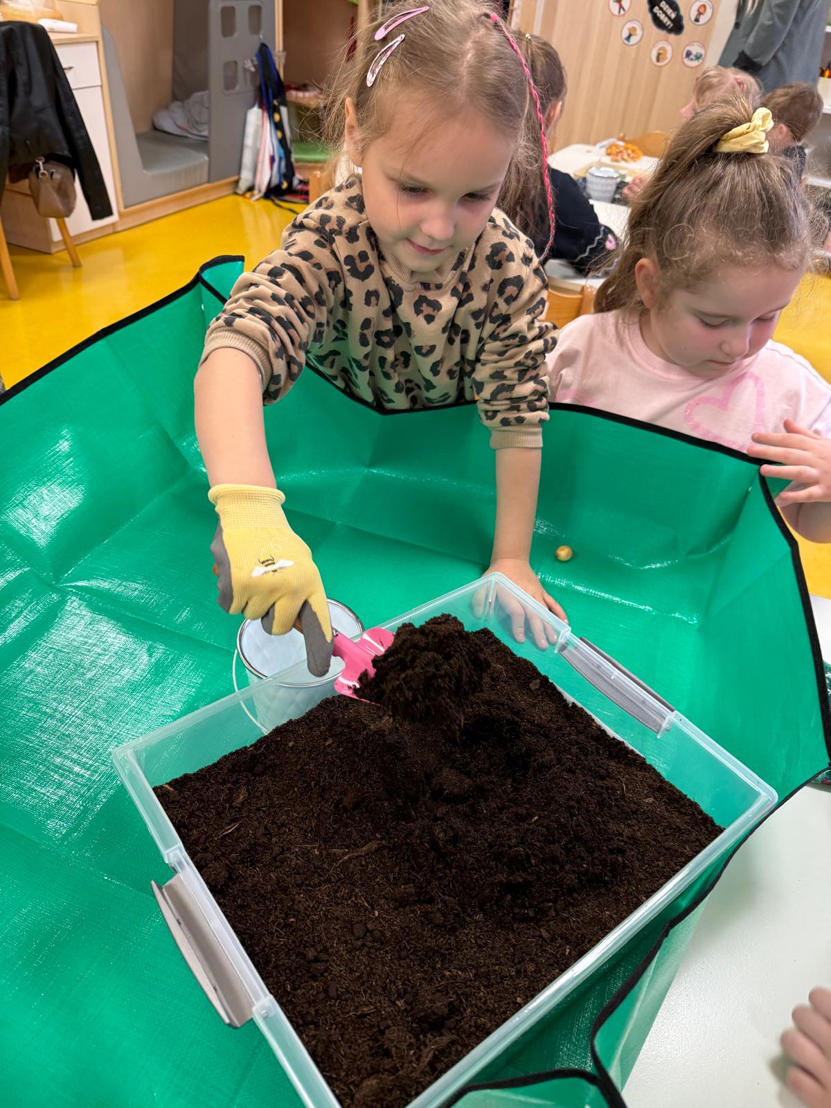 Następnie dzieci przystąpiły do pracy. Podzieleni na grupy wsypali ziemię do doniczek i wsadzili małe cebulki oraz starannie je podlali. Następnym etapem było założenie własnych trawników (rzeżuchy i owsa) przed przygotowanymi przez dzieci domkami.