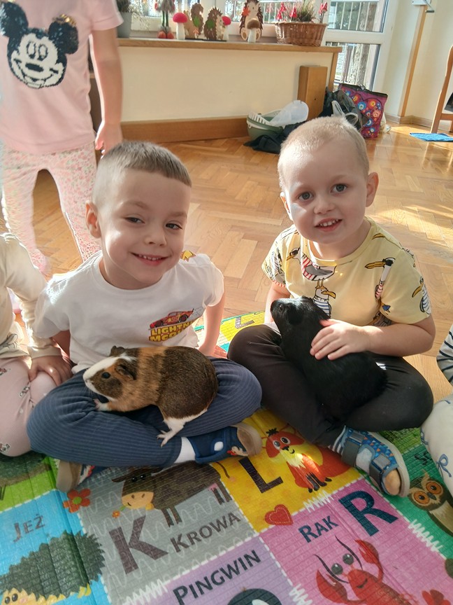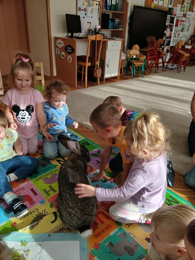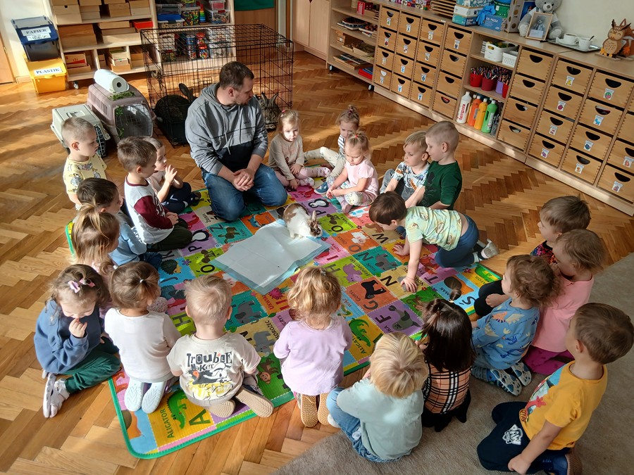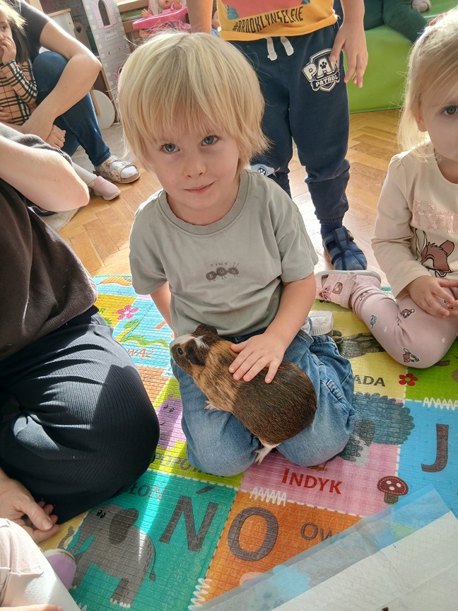 Podczas zajęć każde dziecko mogło przez chwilę potrzymać zwierzątko na kolanach, oczywiście pod opieką dorosłych. Spotkanie było nie tylko pełne emocji, lecz także bardzo edukacyjne – dzieci nauczyły się odpowiedzialności, empatii oraz troski o zwierzęta.