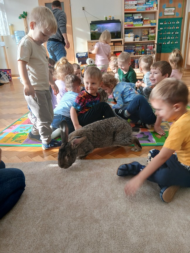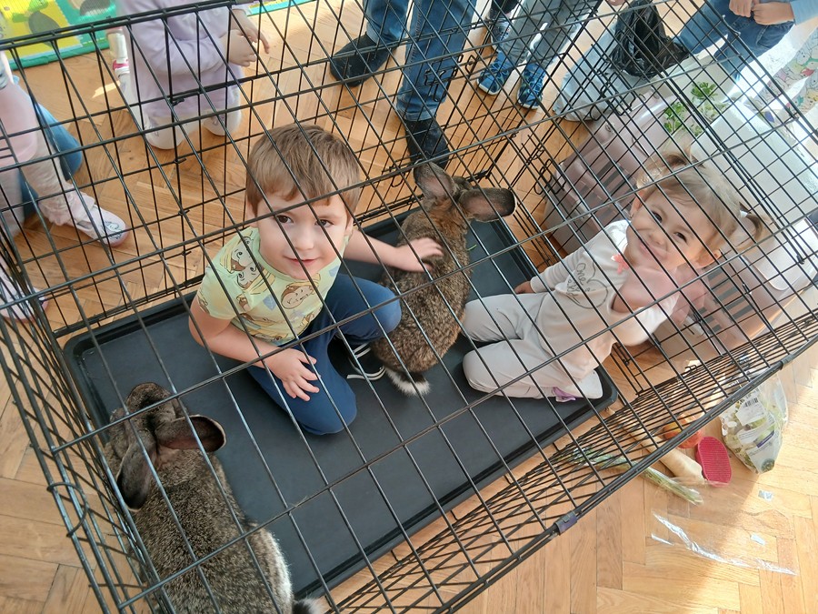 Najpierw pan opowiedział, jak należy obchodzić się ze zwierzętami i jak okazywać im delikatność oraz szacunek. Następnie dzieci mogły podziwiać króliki o miękkiej, puszystej sierści. Króliki chętnie pozwalały się głaskać, a niektóre nawet podskakiwały po specjalnie przygotowanej macie, co wywoływało wiele radości i śmiechu.