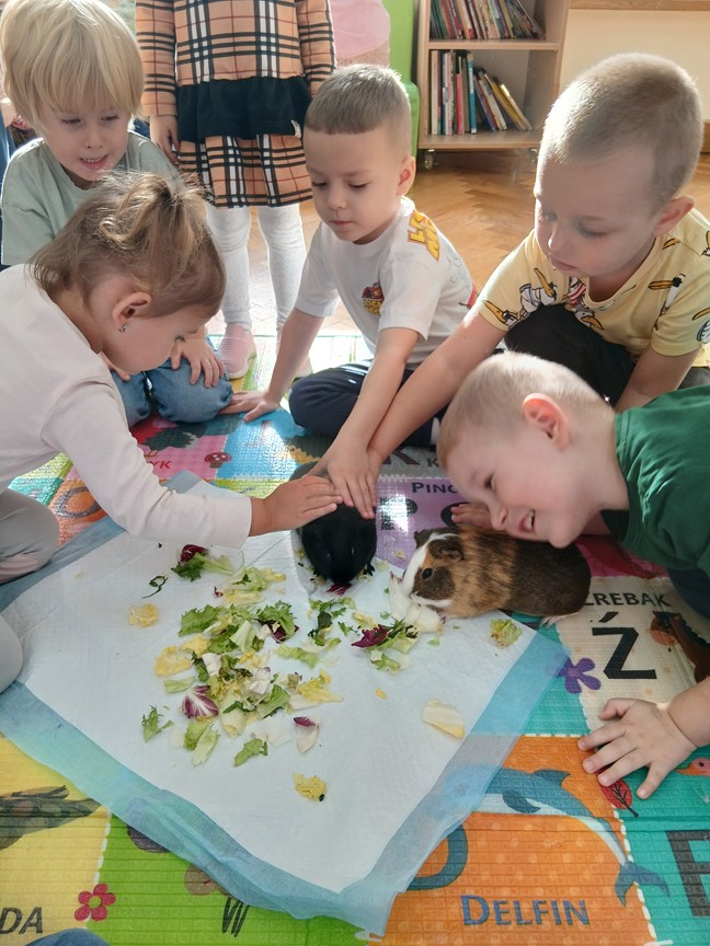 Potem przyszedł czas na spotkanie ze świnkami morskimi. Przedszkolaki dowiedziały się, czym żywią się świnki, jak o nie dbać i dlaczego lubią schować się w domkach.